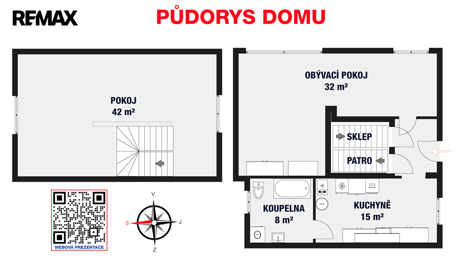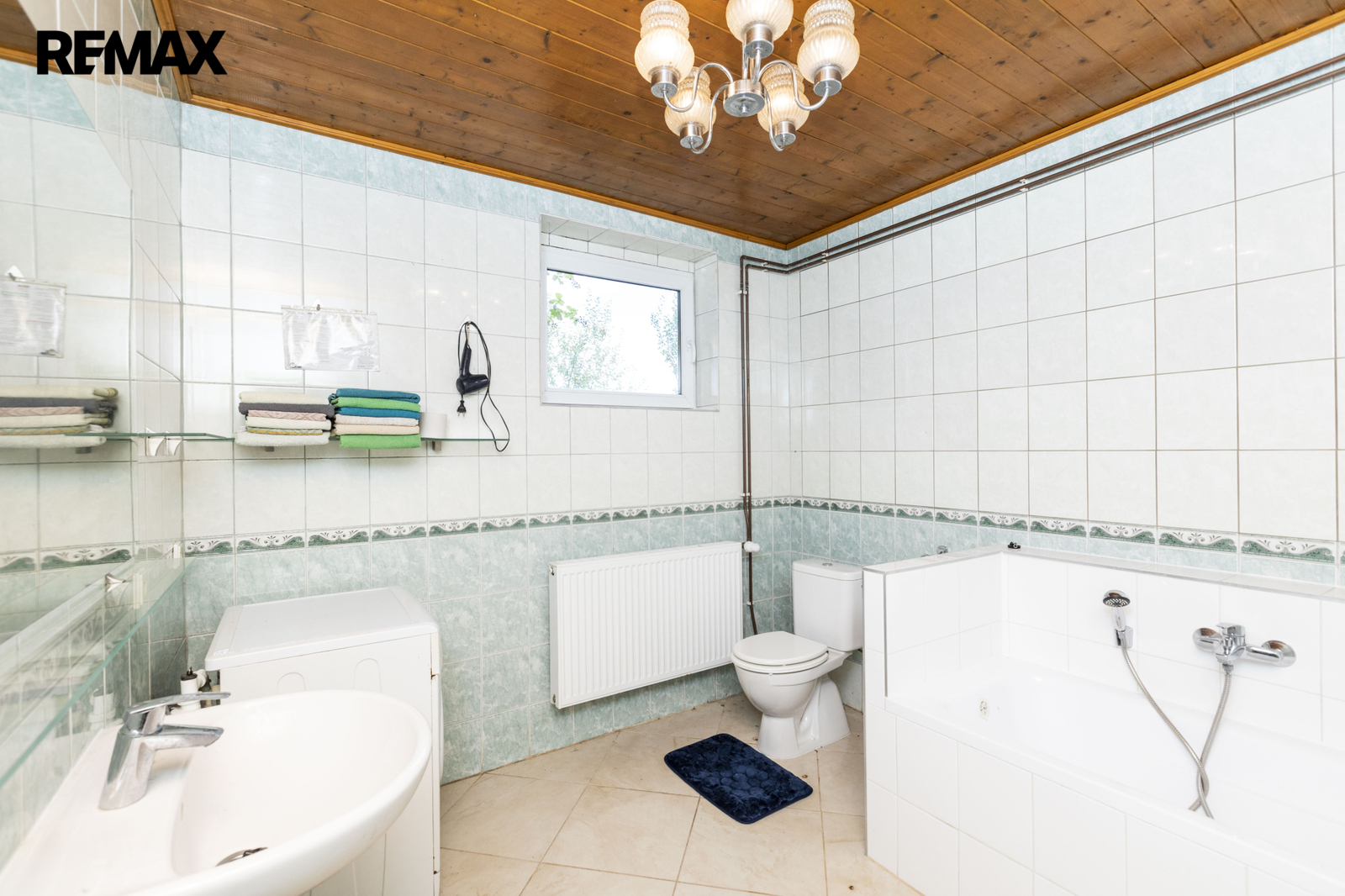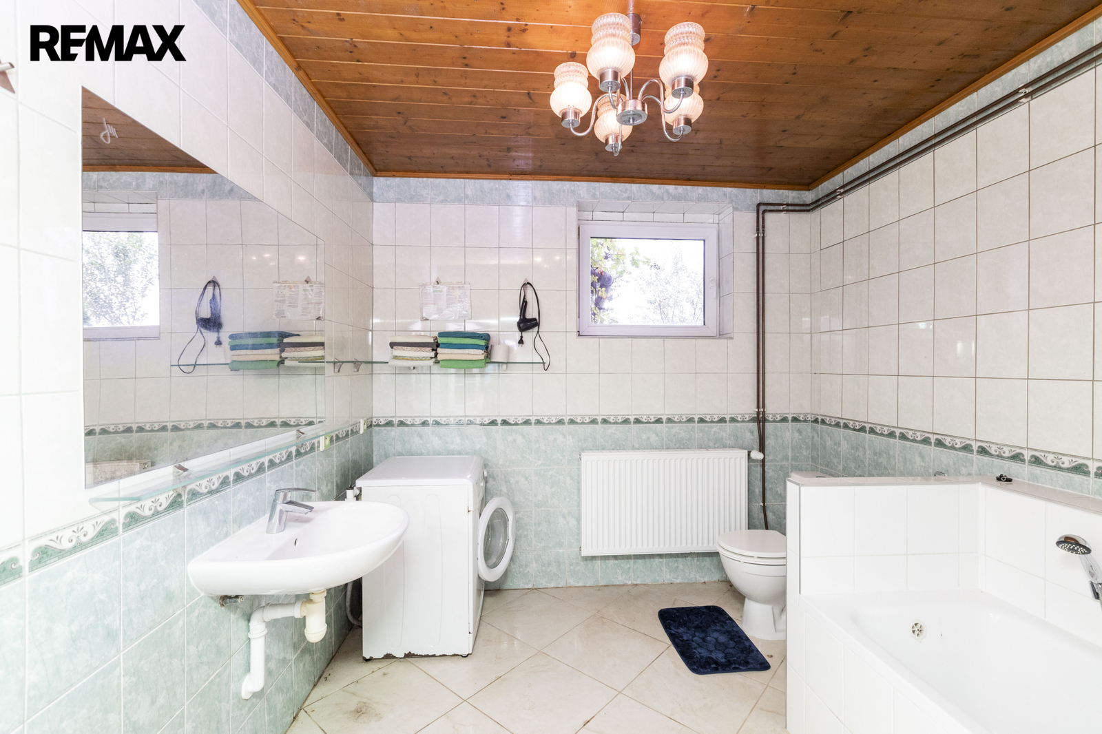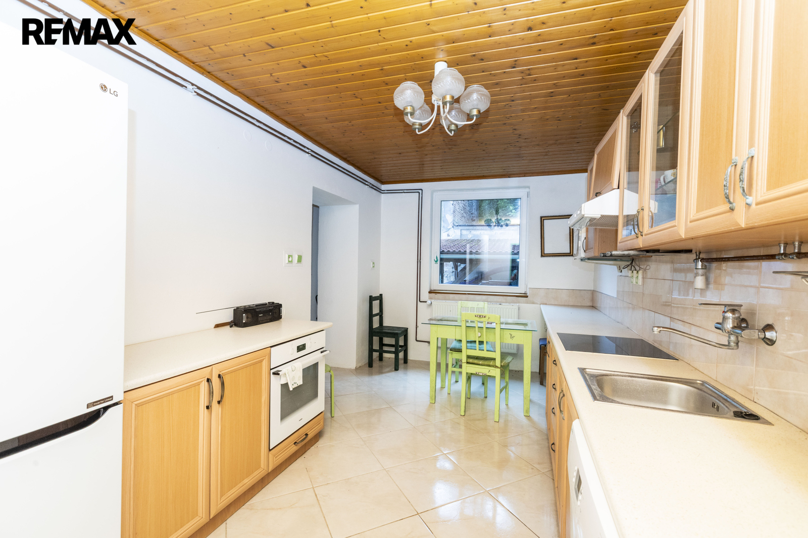 Dispozice domu zahrnuje prostornou kuchyni o velikosti 15 m², která poskytuje dostatek místa jak pro vaření, tak pro společné stolování. Koupelna o výměře 8 m² je vybavena tak, aby odpovídala současným standardům. Dominantou přízemí je velký obývací pokoj o ploše 32 m², ve kterém zaujme kamenná stěna dodávající prostoru osobitý charakter.