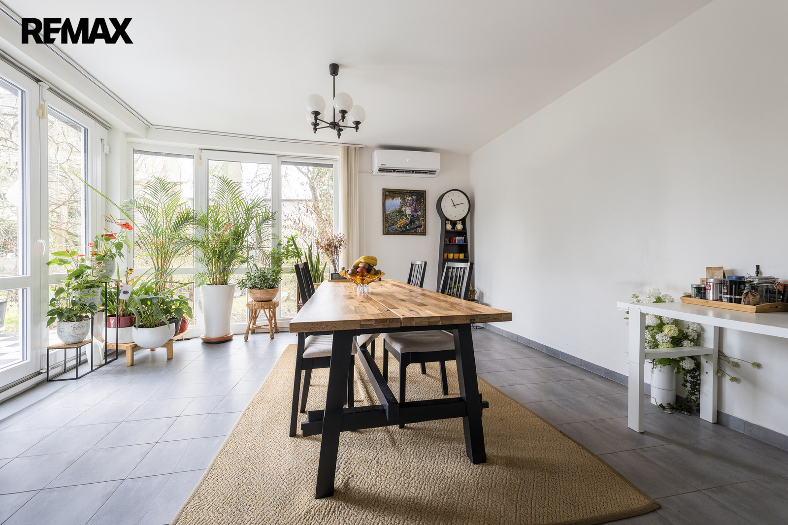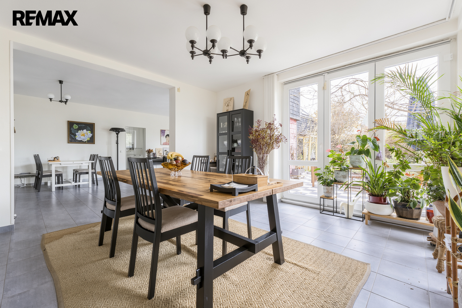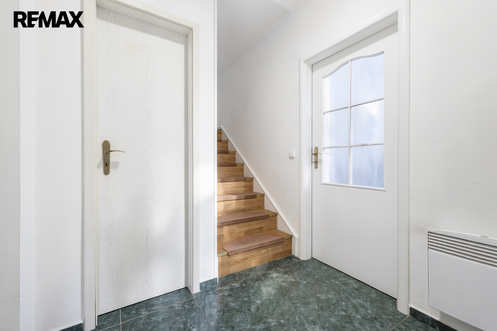 V přízemí se nachází prostorná vstupní předsíň s vestavěnou skříní, ze které vedou vstupy do garáže, na zahradu a do vnitřních částí domu. Na předsíň dále navazuje menší chodba se schodištěm do patra, vzdušný obývací pokoj s krbem, jídelnou, zimní zahradou a několika vstupy na terasu + zahradu, kuchyně s moderní kuchyňskou linkou, technická místnost s přípojkami vody + odpadu pro pračku a samostatná toaleta s umyvadlem.