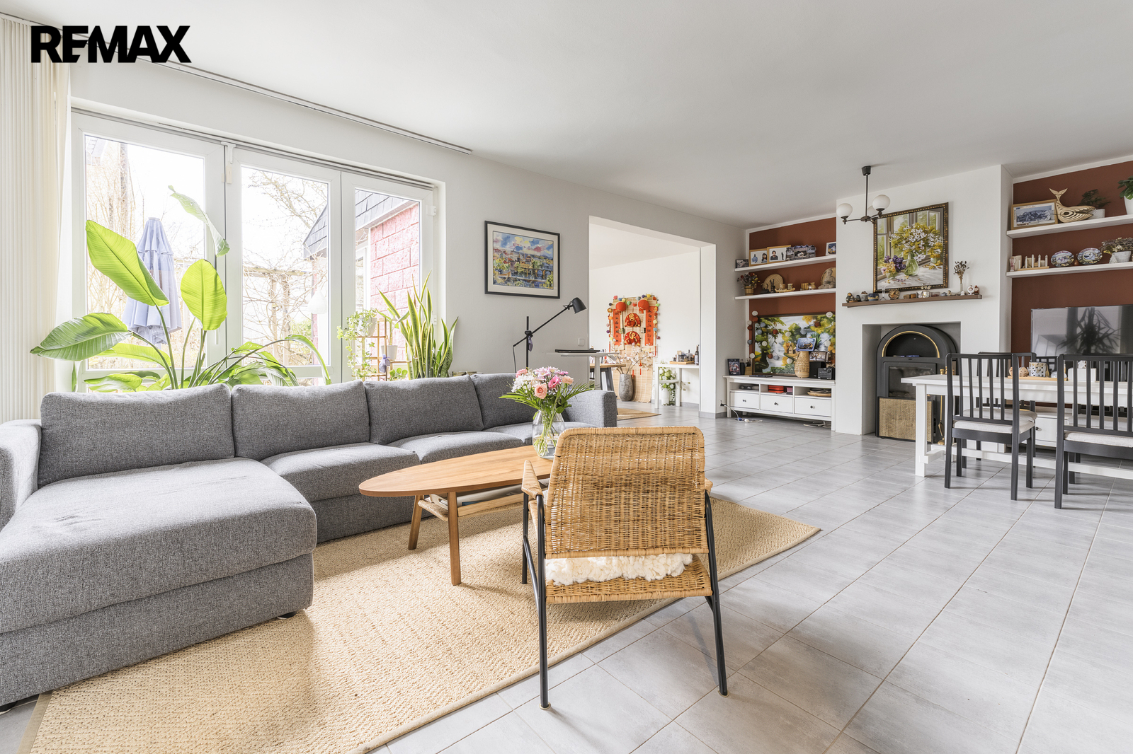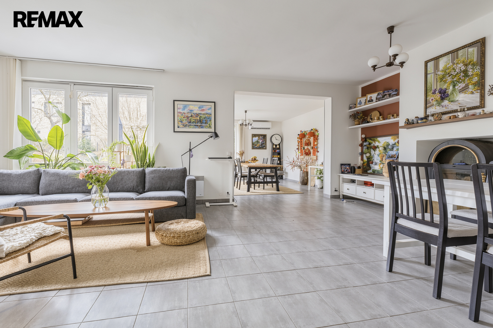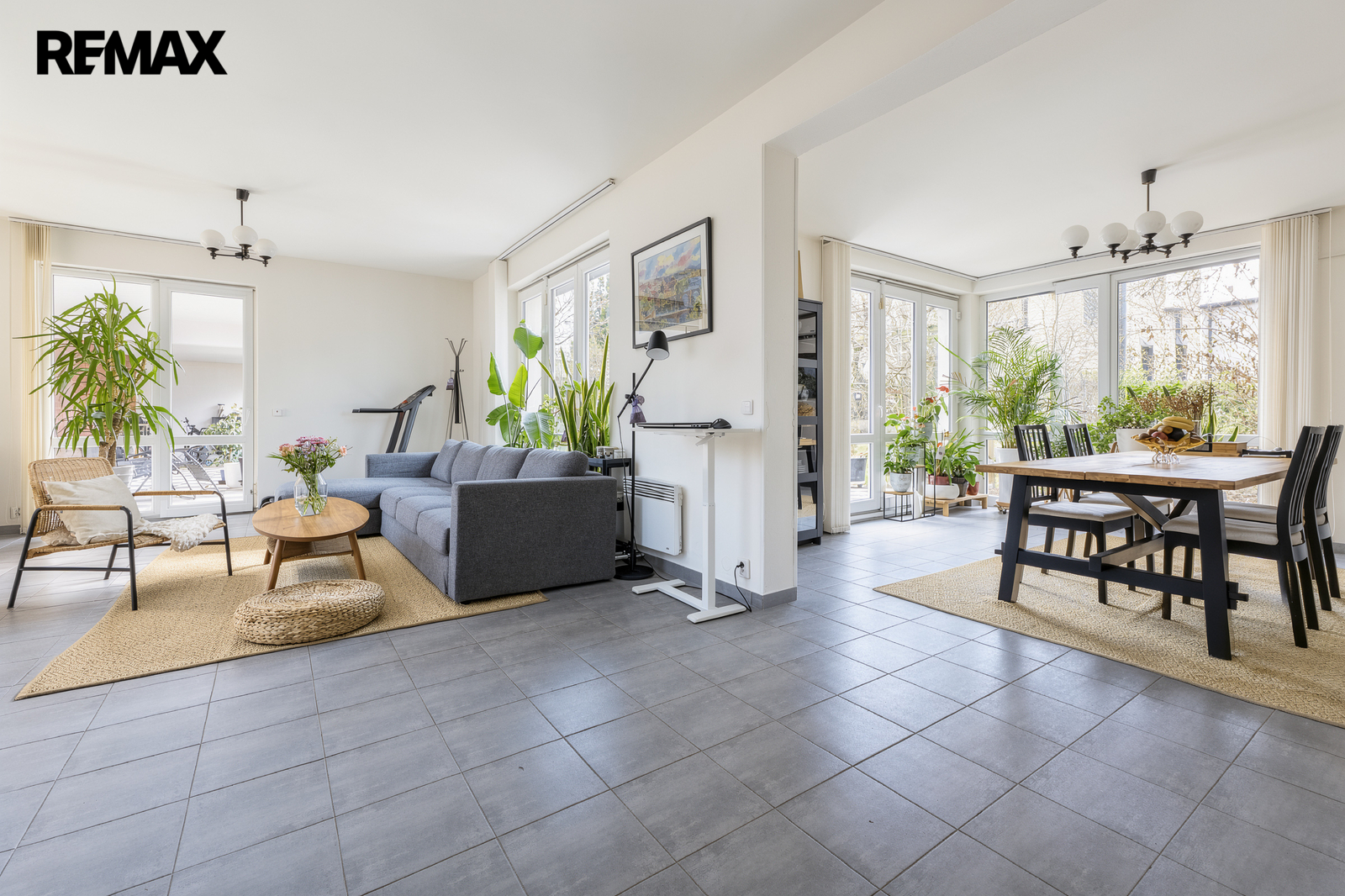 V přízemí se nachází prostorná vstupní předsíň s vestavěnou skříní, ze které vedou vstupy do garáže, na zahradu a do vnitřních částí domu. Na předsíň dále navazuje menší chodba se schodištěm do patra, vzdušný obývací pokoj s krbem, jídelnou, zimní zahradou a několika vstupy na terasu + zahradu, kuchyně s moderní kuchyňskou linkou, technická místnost s přípojkami vody + odpadu pro pračku a samostatná toaleta s umyvadlem.