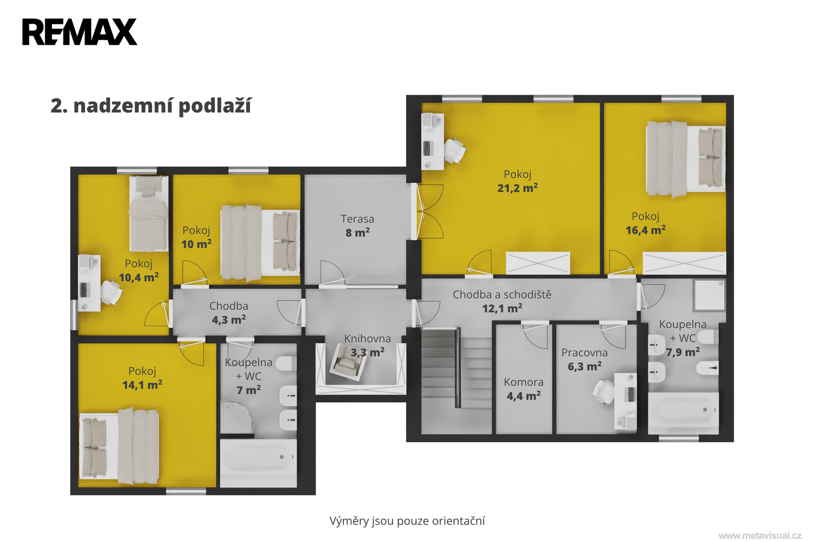 V 1. patře je umístěno 5 samostatných pokojů, 2 koupelny (v obou koupelnách jsou vany i sprchové kouty), galerie s knihovnou, pracovna, komora a terasa. Všechny pokoje jsou spojeny velkou centrální chodbou.