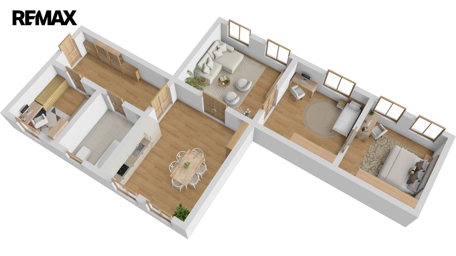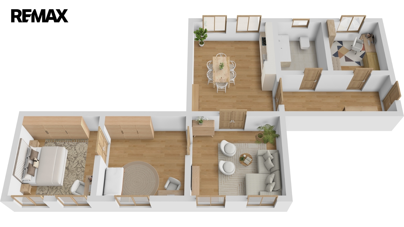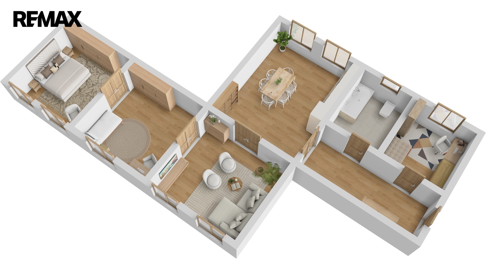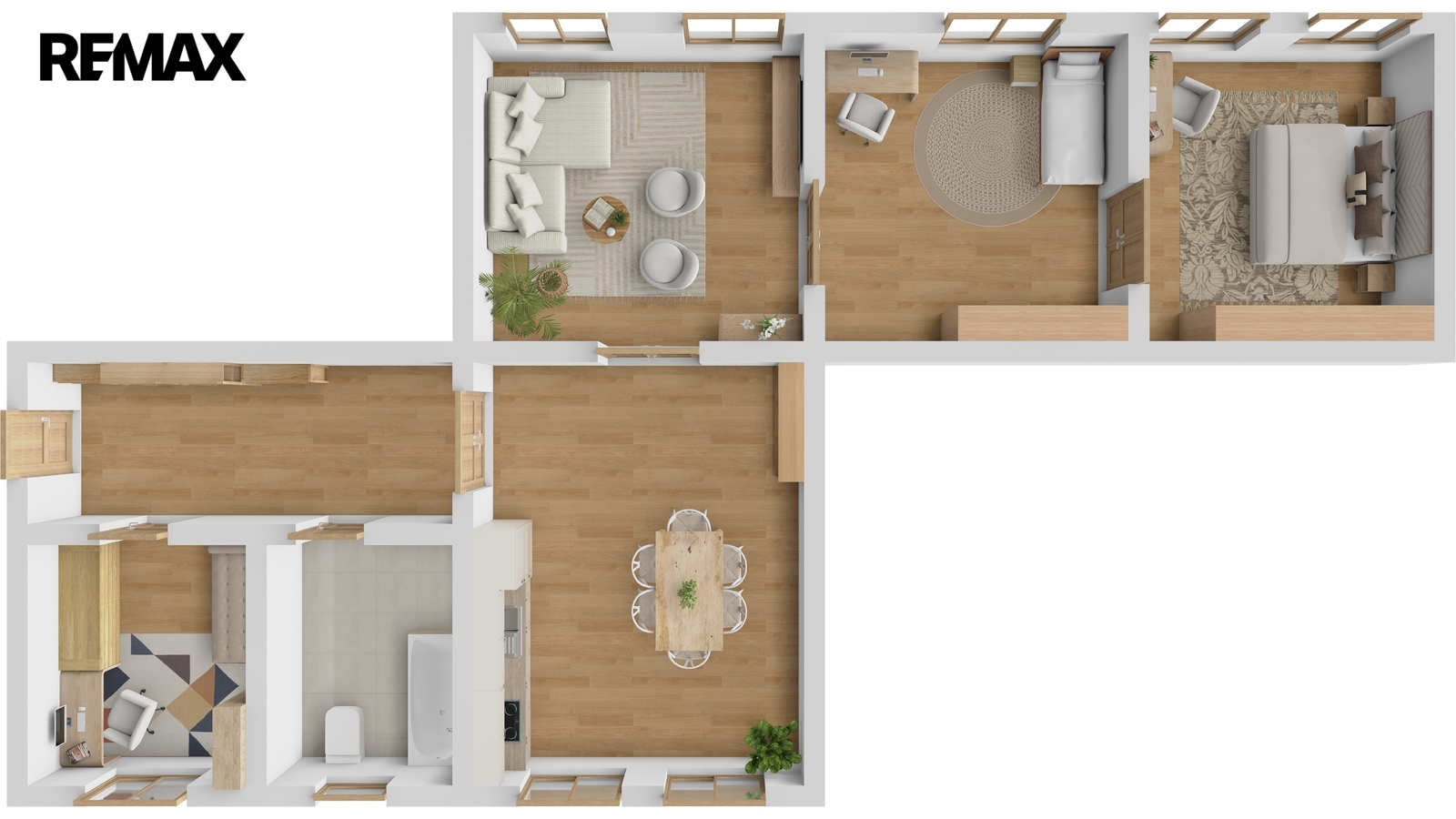 Z prostorné vstupní chodby je samostatný vstup do menšího pokoje, koupelny (určené k rekonstrukci) a kuchyně, která již prošla rozsáhlou modernizací včetně nových elektrických rozvodů. Z kuchyně se plynule dostanete do obývacího pokoje, na který navazují další dva pokoje, ideální jako ložnice či dětské pokoje. V ostatních částech bytu jsou rozvody elektřiny v hliníku.