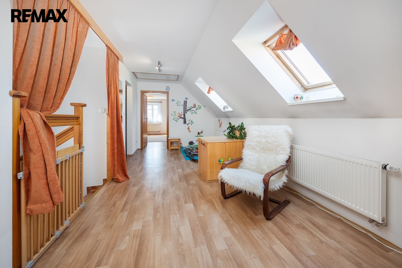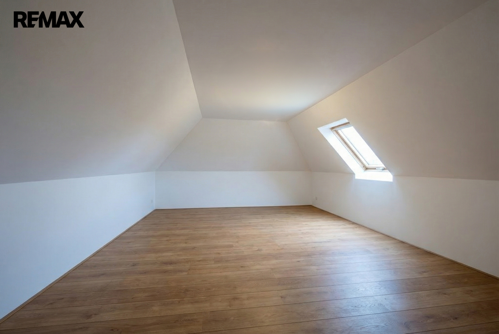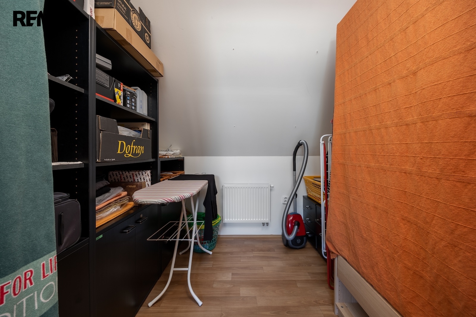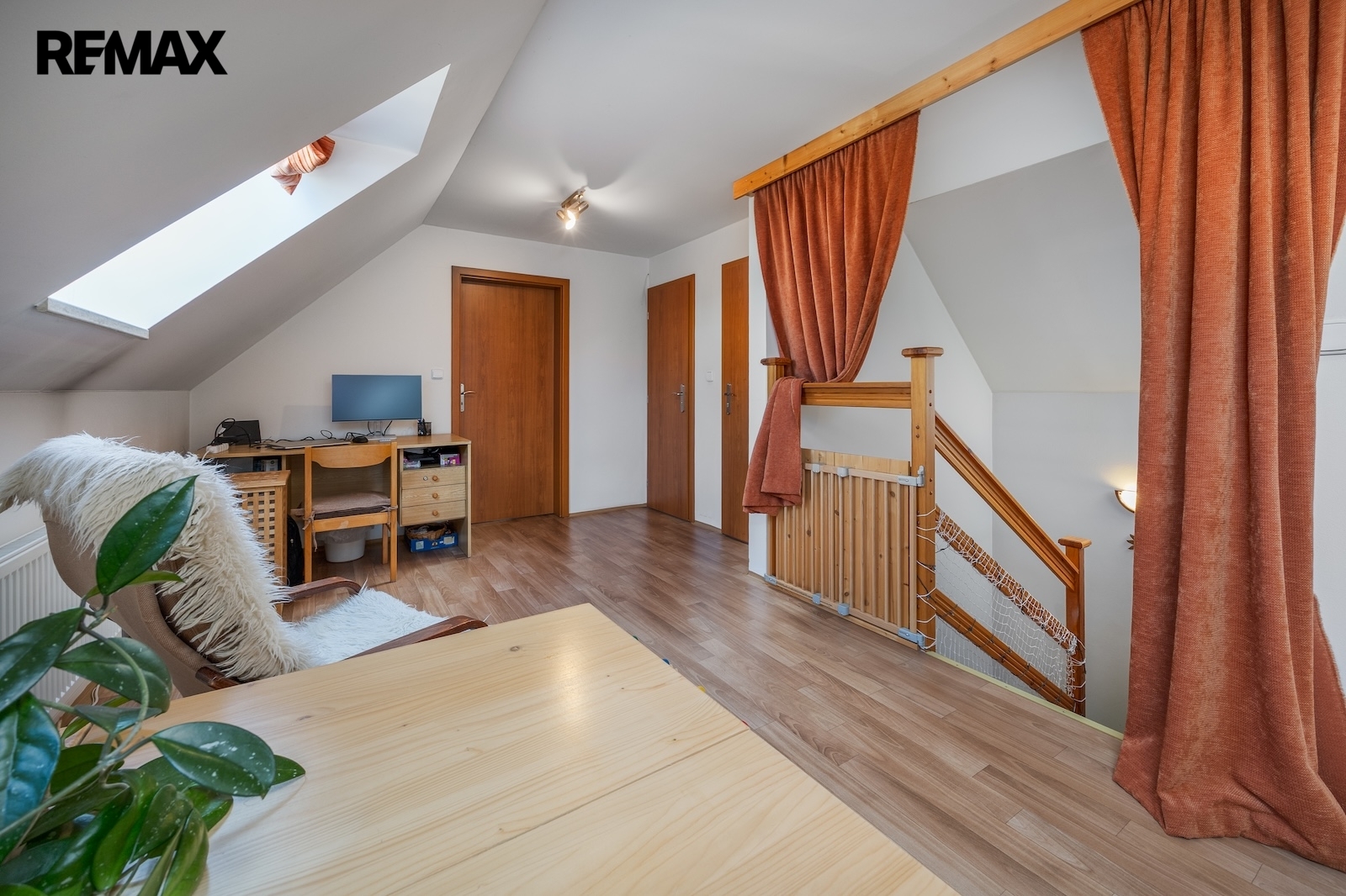 Nabízí hlavní ložnici, dětský pokoj, pracovnu se šatnou/skladem, šatnu, koupelnu s vanou a samostatné WC. Součástí je také půda o výměře 52 m² ve stavu Shell & Core, která nabízí potenciál pro další rozšíření obytné plochy dle vlastních představ.