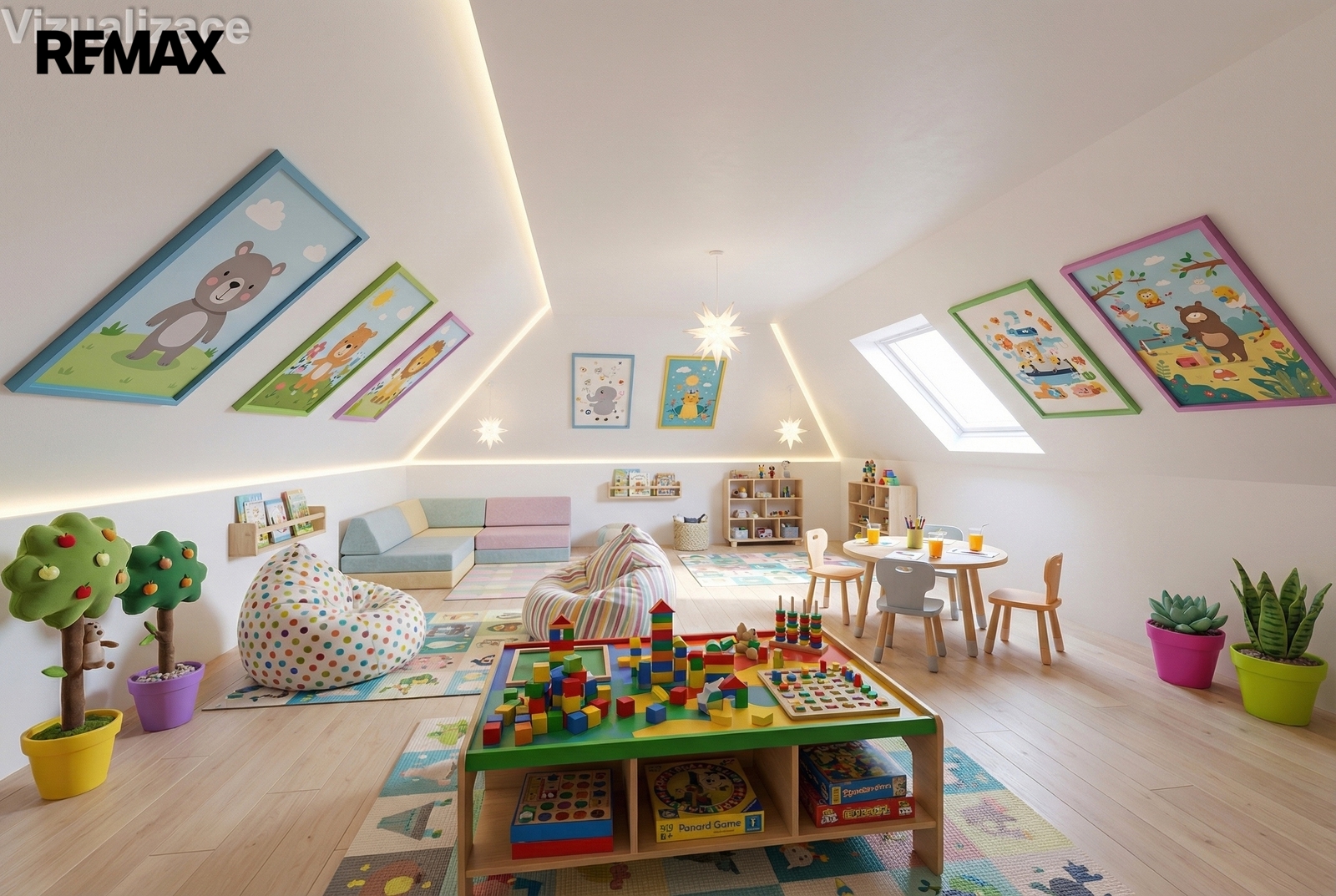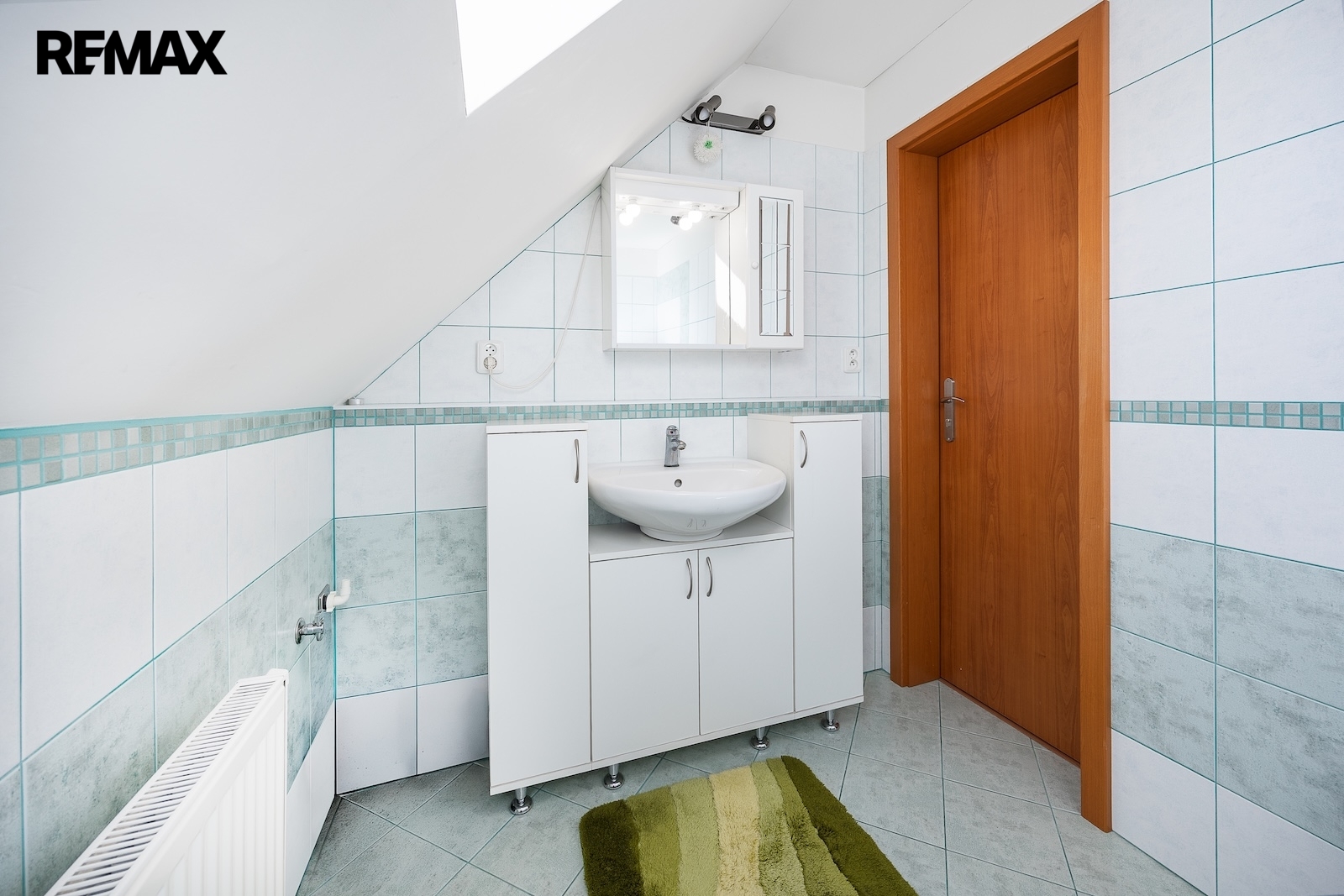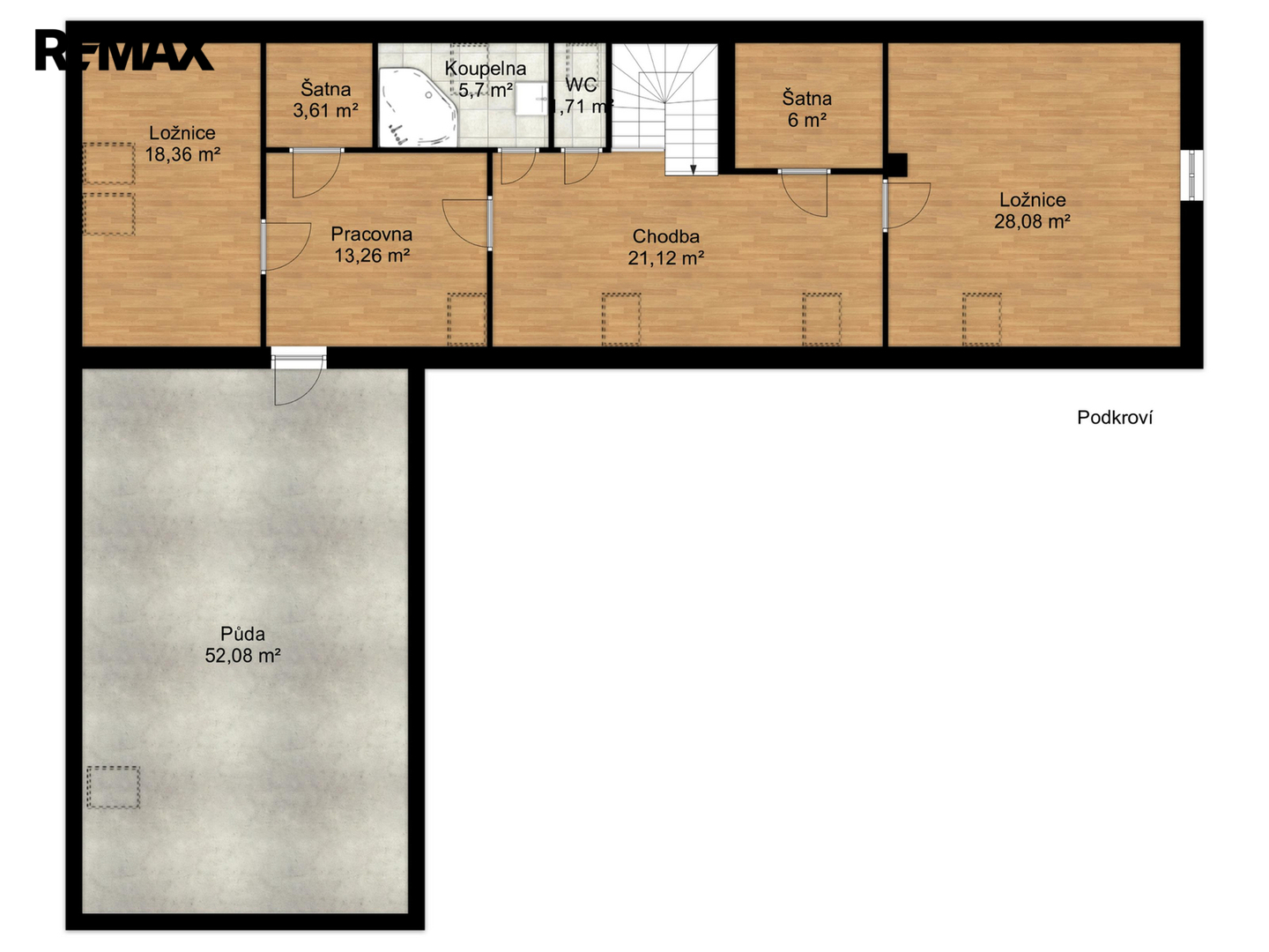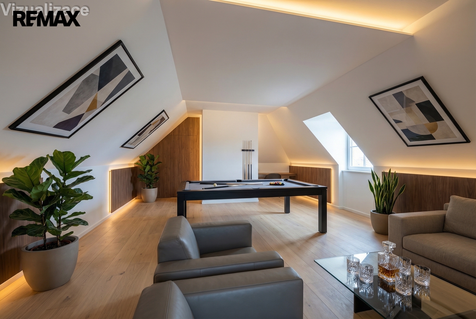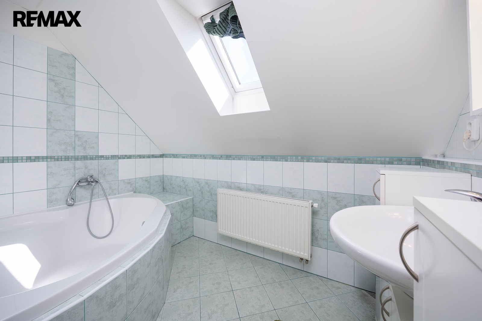 Nabízí hlavní ložnici, dětský pokoj, pracovnu se šatnou/skladem, šatnu, koupelnu s vanou a samostatné WC. Součástí je také půda o výměře 52 m² ve stavu Shell & Core, která nabízí potenciál pro další rozšíření obytné plochy dle vlastních představ.
