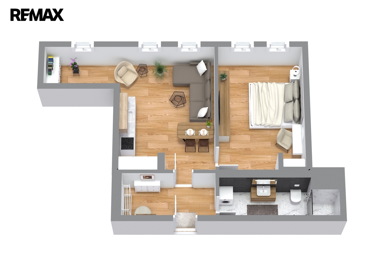 • Dispozice: 2+kk, 61 m² podlahové plochy