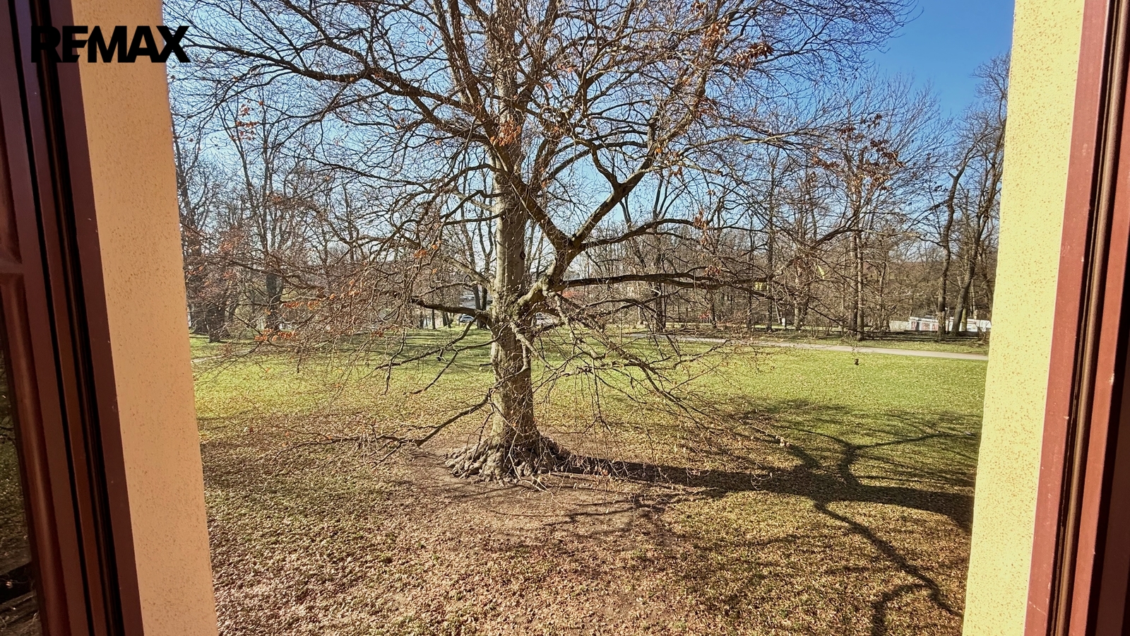 Výhled z bytu je přímo do zeleně přilehlého parku s rybníky.