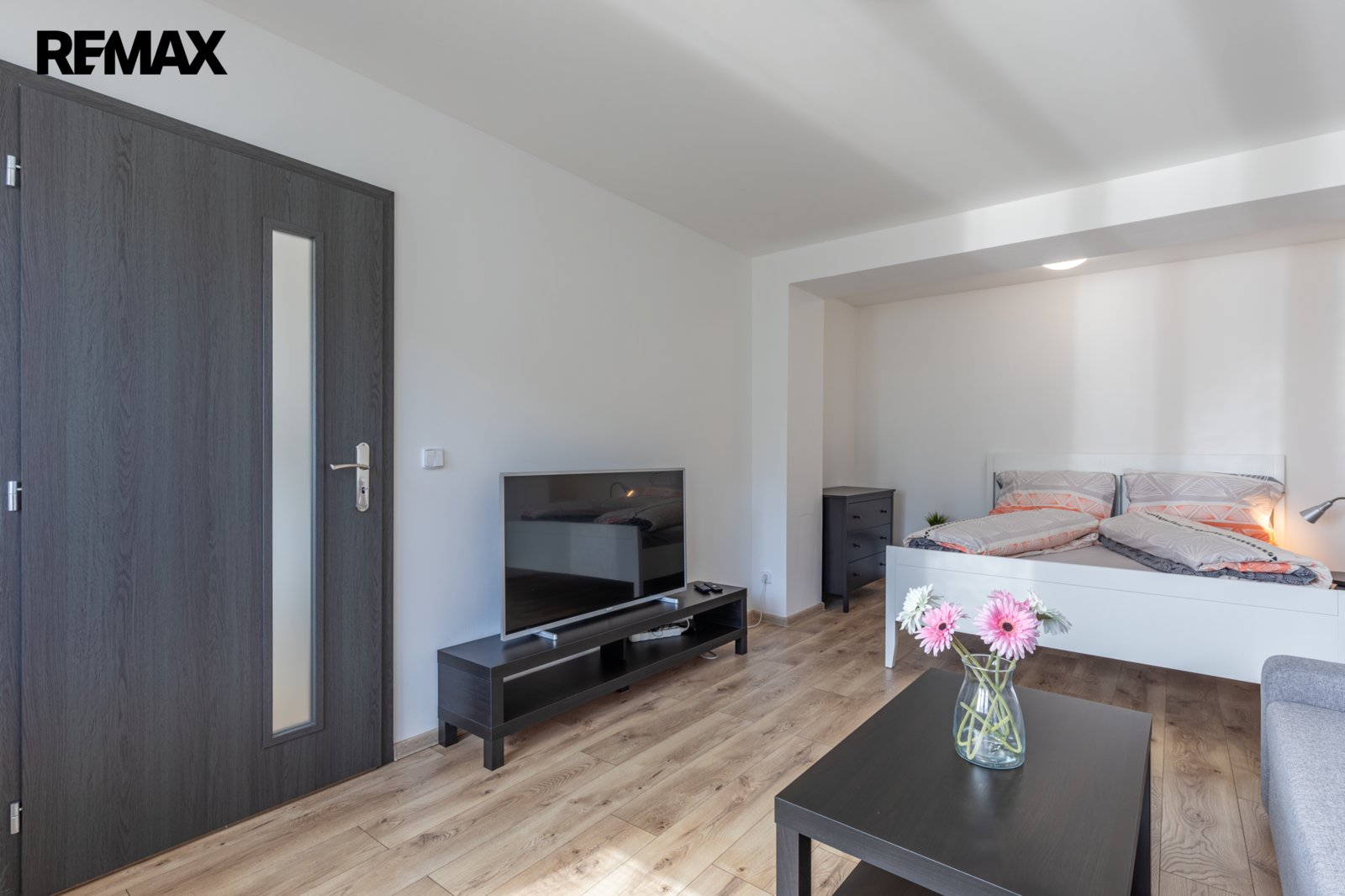 Byt zajišťuje nájemcům komfortní bydlení v příjemném novém interieru s novým vybavením: kuchyňská linka v praktickém rovném tvaru s volně stojíícm plynovým sporákem, digestoří, volně stojící MW troubou, v pokoji šatní skříň, pohodlné dvojlůžko, odkládací stolky, TV stolek s televizí, komoda, sedačka v šedé barvě, béžová koupelna se sprchovým koutem pro pohodlnou koupel, umývadlová skrříňka pro ukládání toaletních potřeb, na oknech žaluzie, podlahy - v pokoji plocoucí, v kuchyni a v předsíni dlažba. Vše zánovní, čisťoučké, voňavé, ihned k nastěhování. Součástí pronájmu je sklepní kóje hned za bytem.