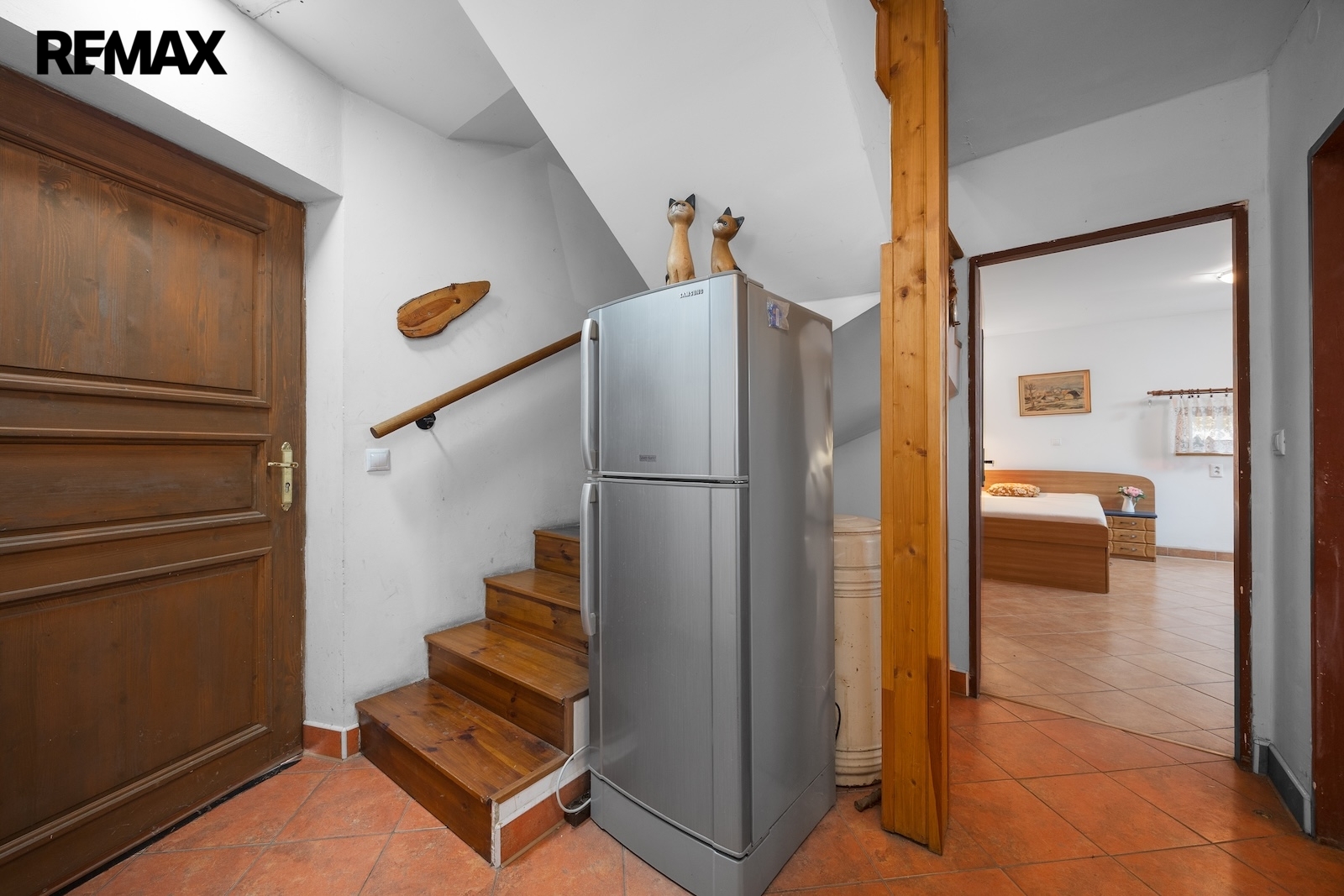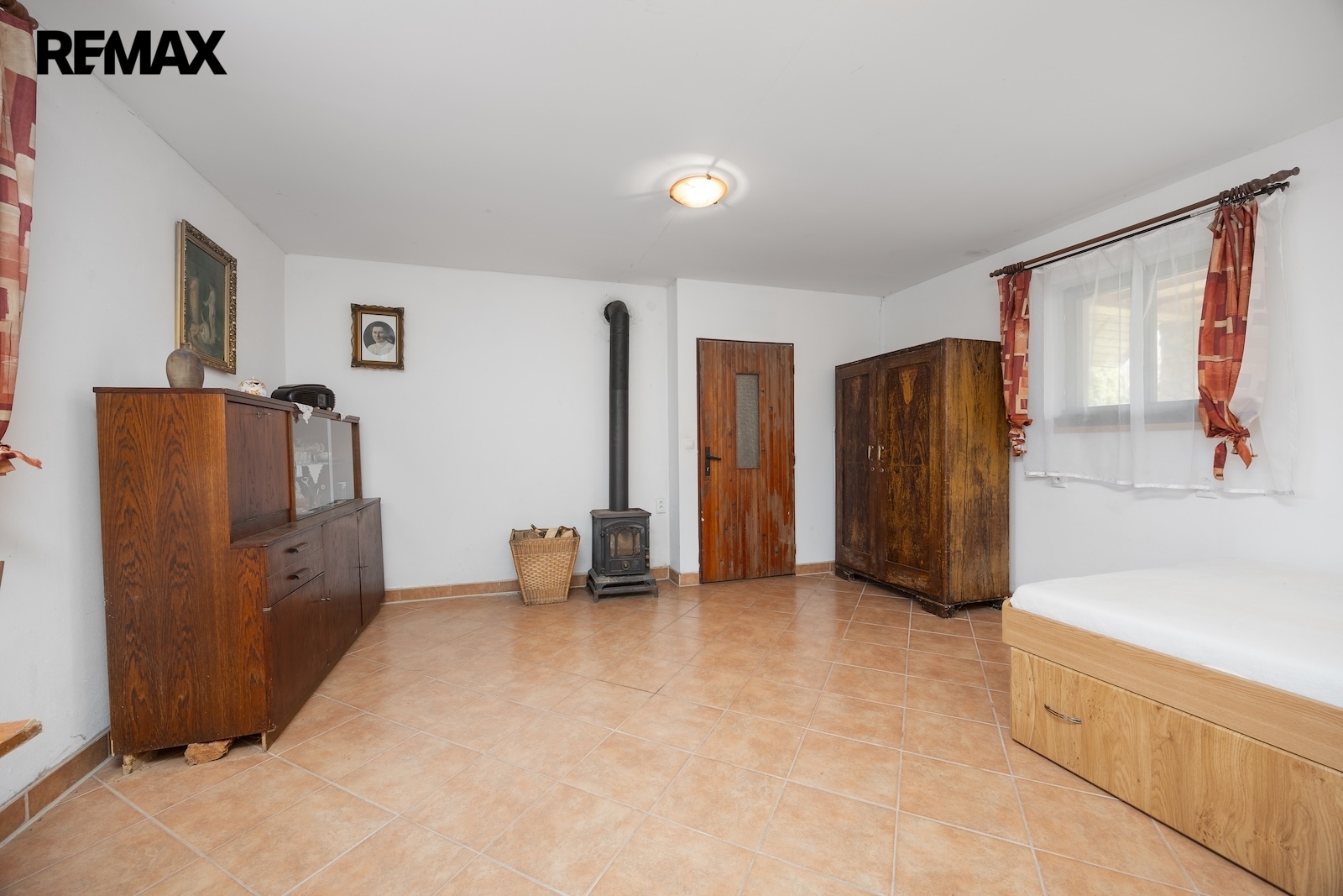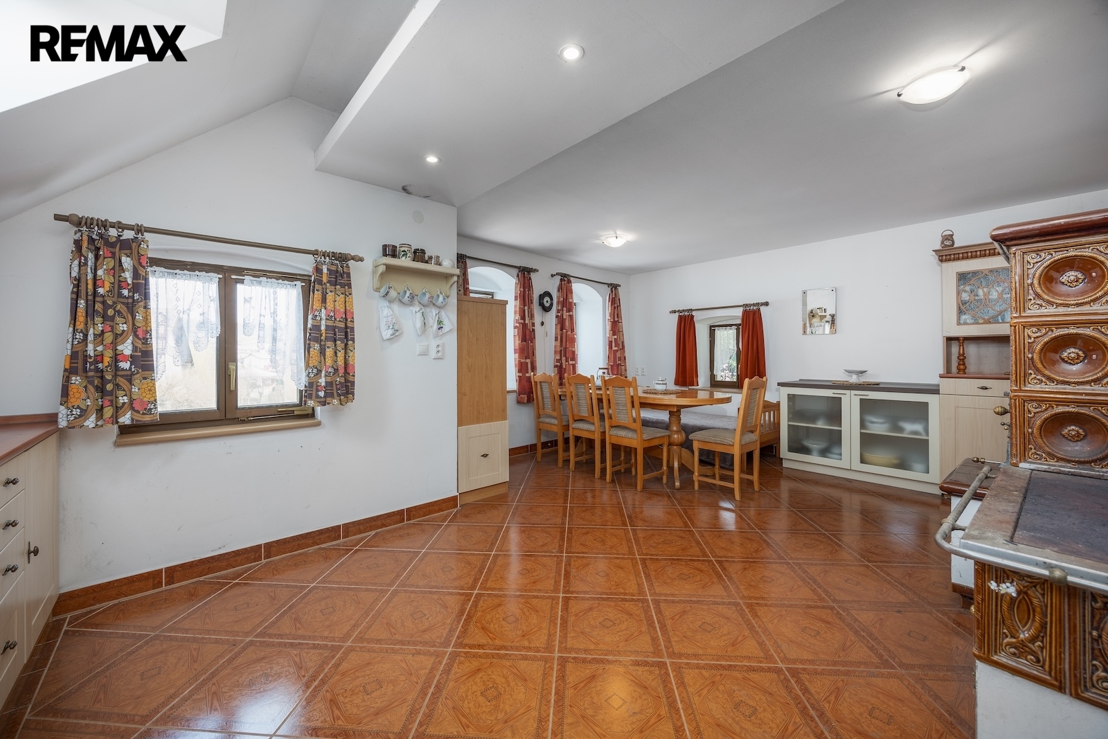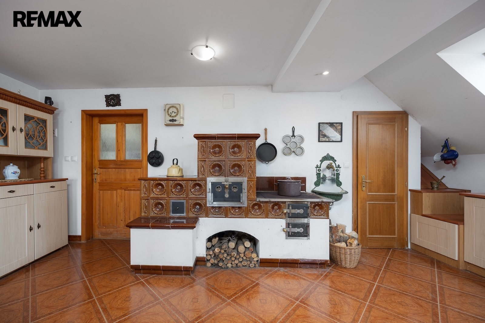 V přízemí se nacházejí dvě prostorné místnosti, které tvoří srdce celé chalupy. Hlavní obytný prostor, tradiční světnice, slouží jako místo pro vaření, stolování i odpočinek. Dominantou této místnosti jsou stylová kachlová kamna, ve kterých je možné nejen topit, ale i vařit nebo péct, což podtrhuje autentickou venkovskou atmosféru. Druhá místnost v přízemí je využívána jako ložnice s pracovním koutem, vytápěná klasickými kamny, a nabízí příjemné zázemí pro spaní i klidnou práci.