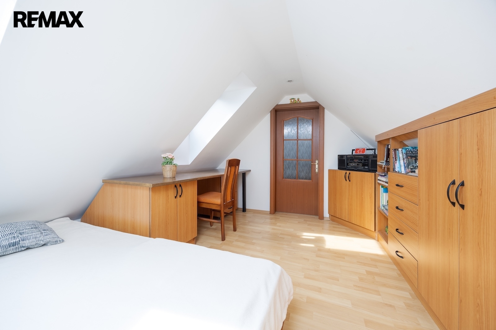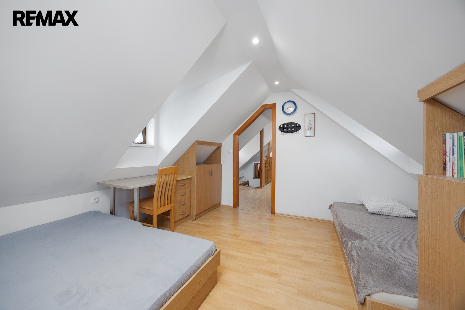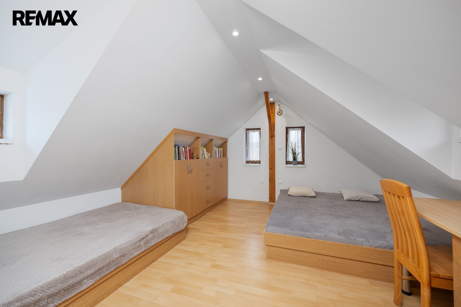V podkroví se nacházejí další dva pokoje. Jeden z pokojů je vytápěn přímotopem, druhý je bez vlastního zdroje vytápění. Na chodbě v podkroví je navíc příjemné posezení, které vytváří další prostor pro relaxaci. Komfort užívání zvyšuje skutečnost, že jak v přízemí, tak i v podkroví je k dispozici koupelna se sprchovým koutem a toaletou.