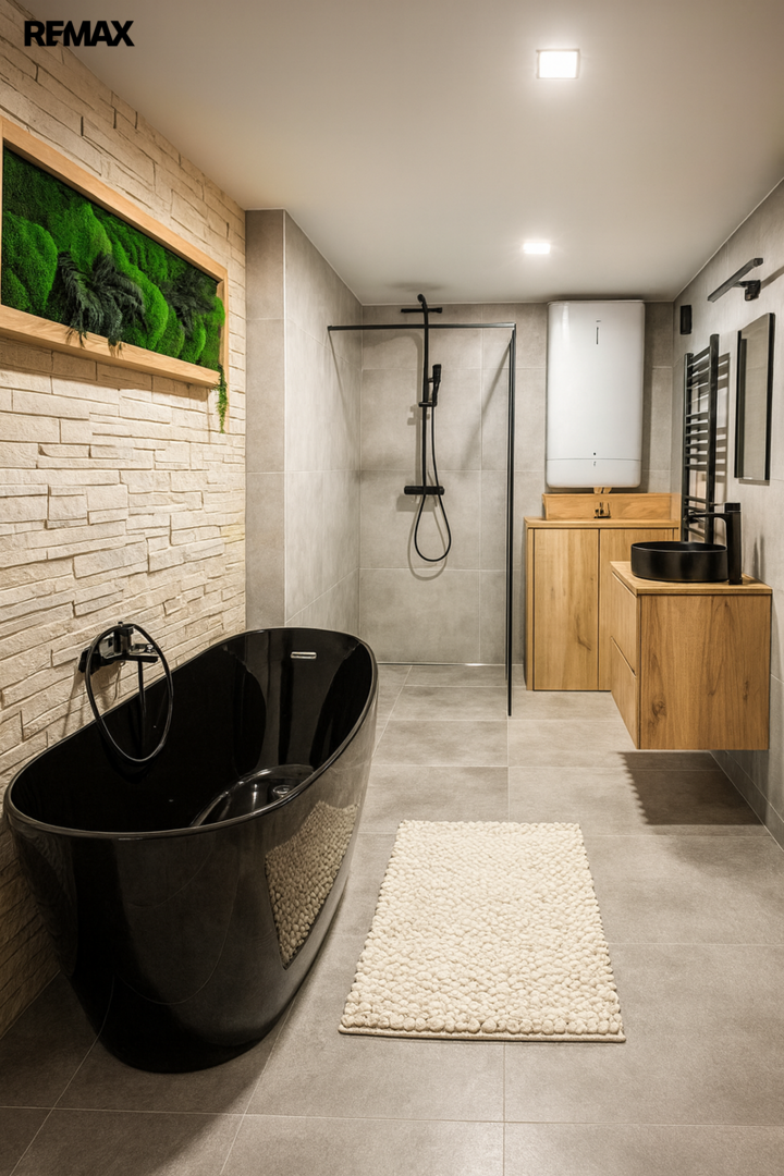 Vytápění zajišťuje kotel na pelety, ohřev vody úsporný elektrický bojler. Odpady jsou svedeny do septiku s přepadem, voda je čerpána z místního pramene. Kotel i bojler lze ovládat pohodlně na dálku přes Wi-Fi.