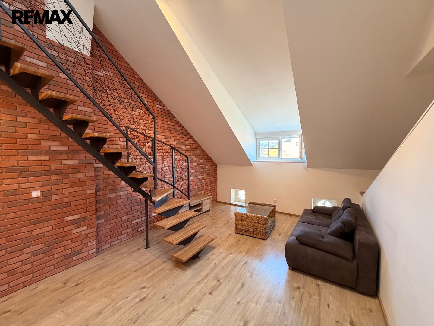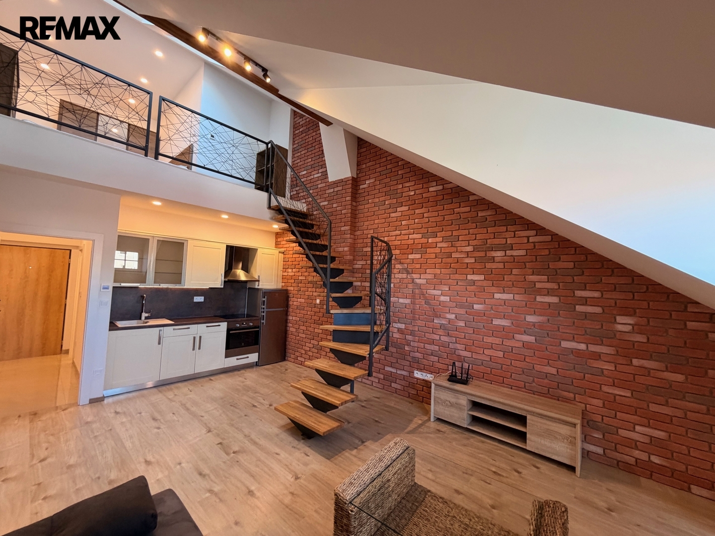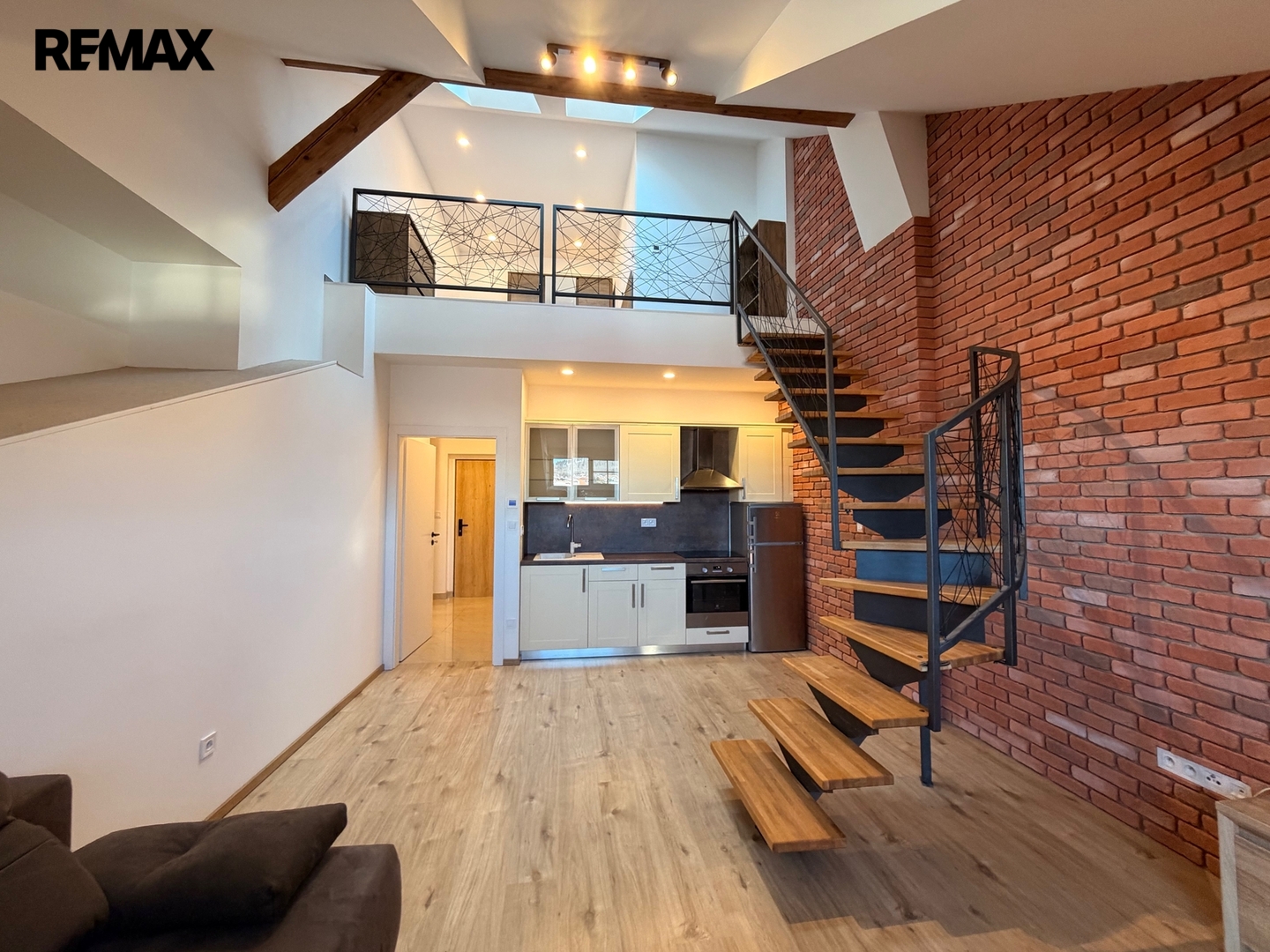 Dispozice bytu je 2+kk, plocha 45 m2 - obývací pokoj + kuchyňská linka včetně spotřebičů, ložnice na galerii, předsíň, koupelna.