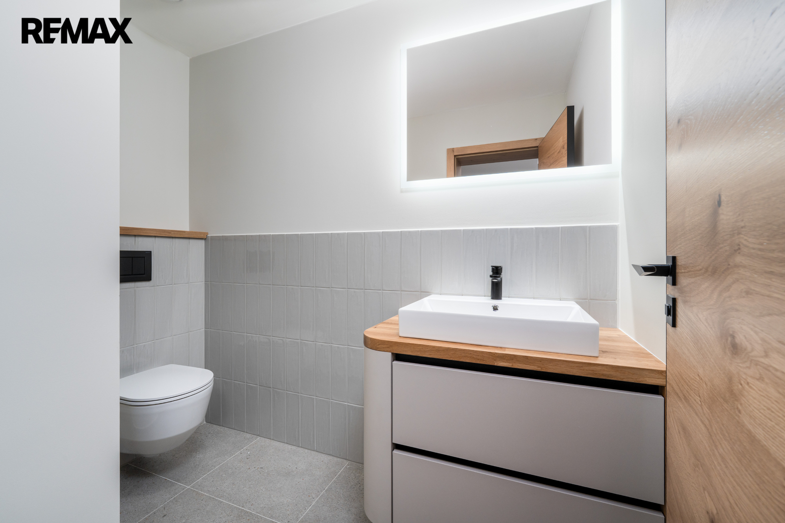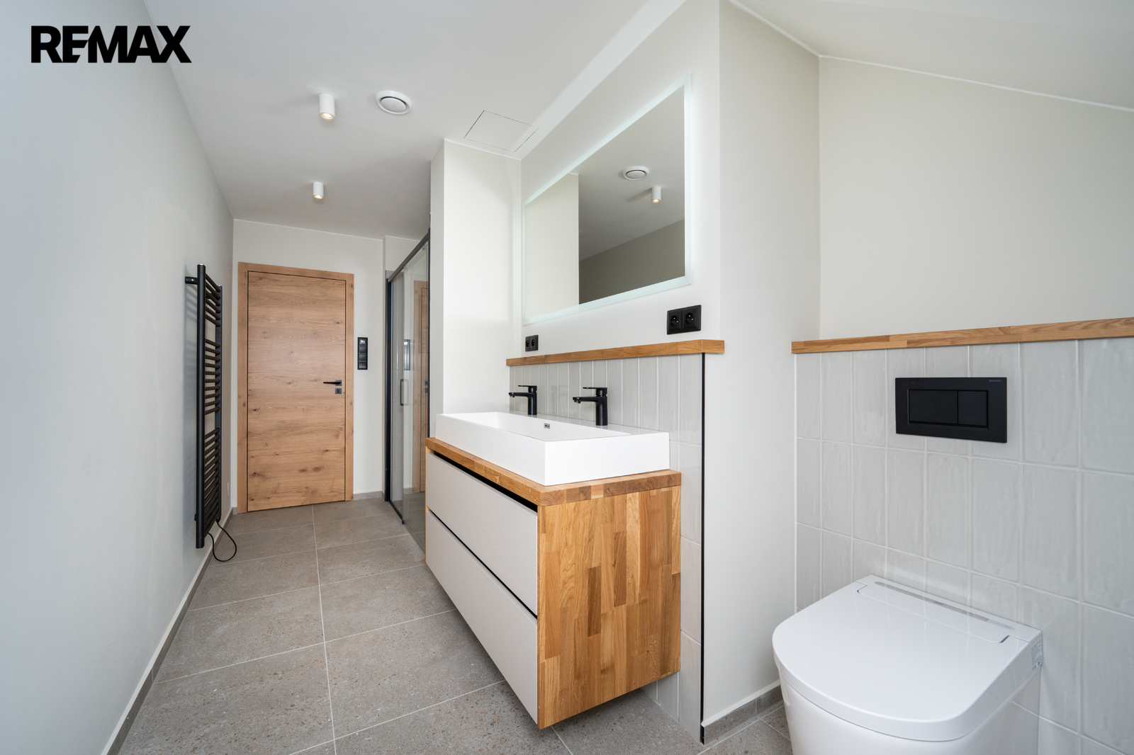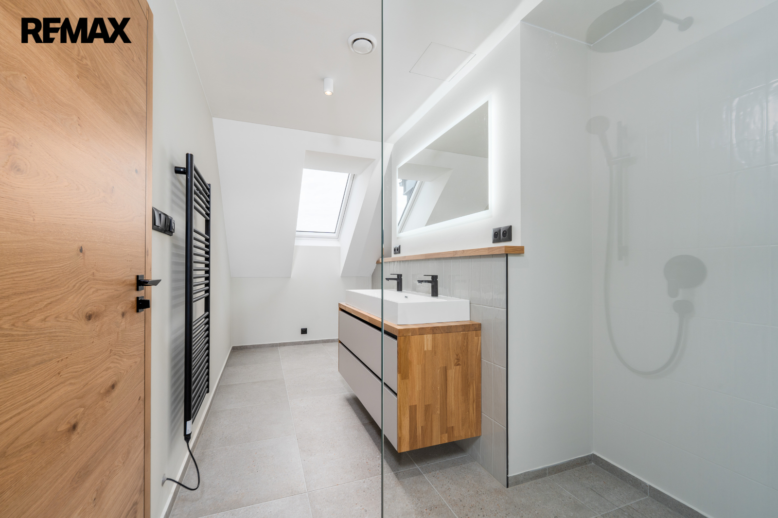 Samozřejmostí jsou dvě koupelny a další oddělené WC, kvalitní sanita Hansgrohe, sprchové zástěny Hüppe a precizní obklady RAKO.
