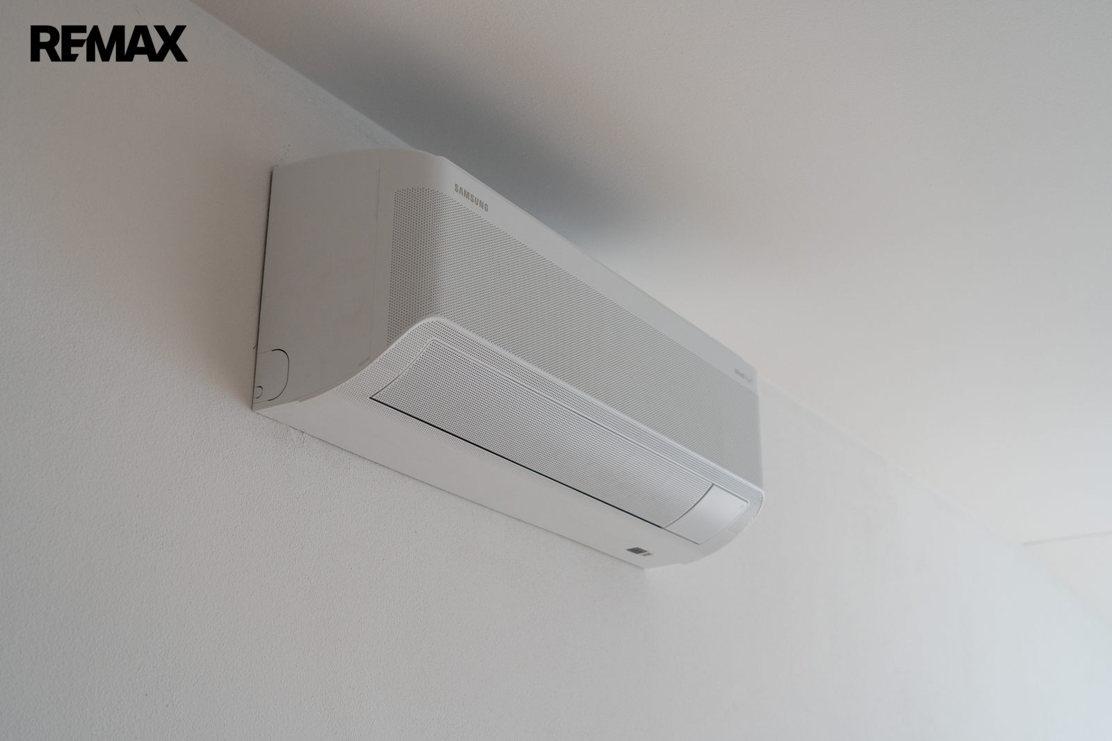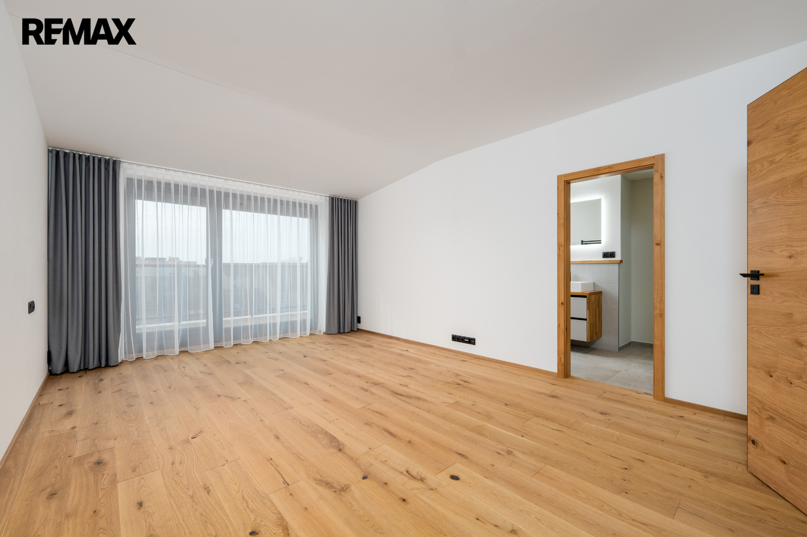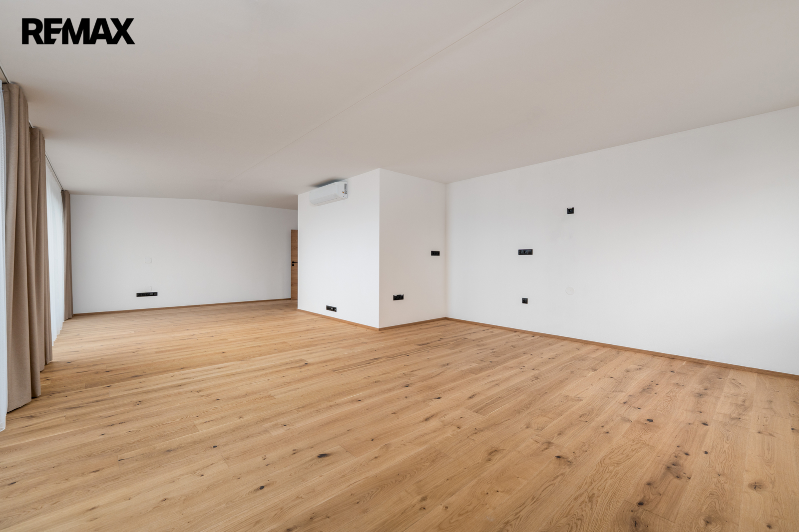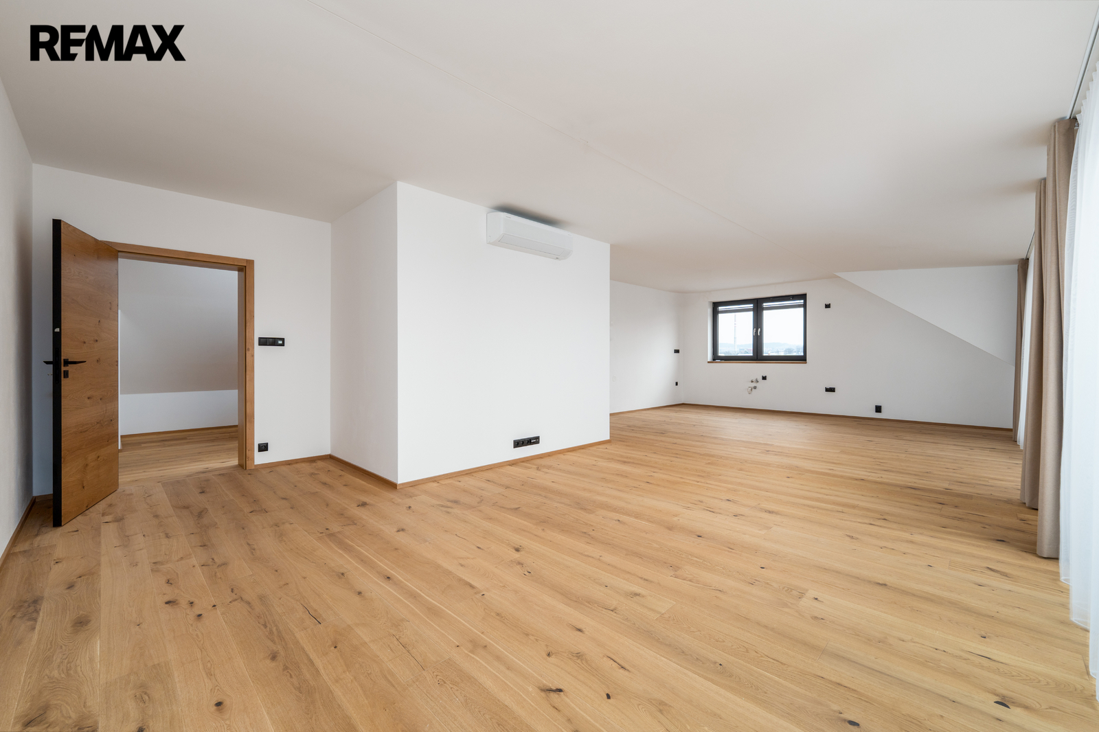 Dřevěné podlahy, podlahové vytápění a klimatizace v obytných místnostech podtrhují vysoký standard celého bytu.