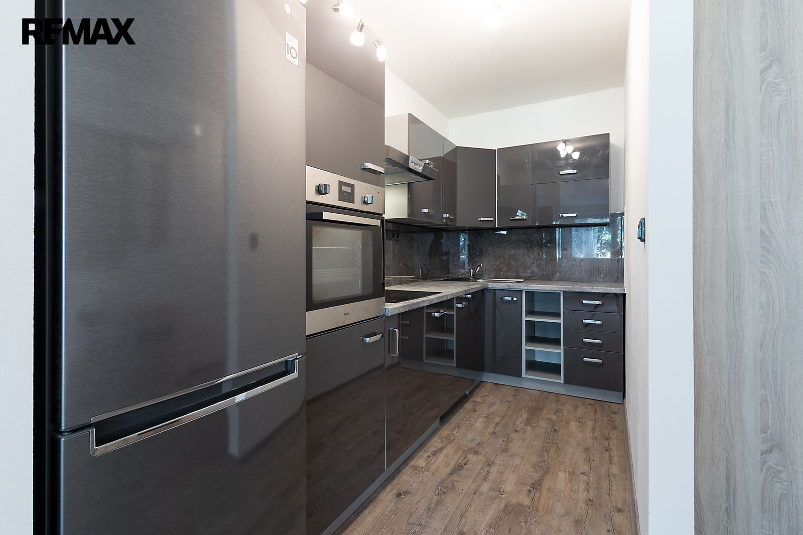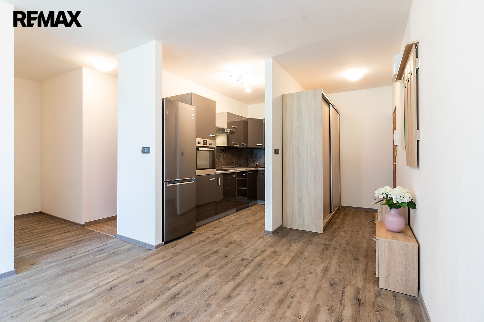 Byt je částečně vybavený – kuchyňská linka s vestavěnými spotřebiči (lednice, mrazák, trouba, varná deska, digestoř a myčka), velká šatní skříň, botník, věšák, pračka. Na oknech jsou namontovány venkovní žaluzie.