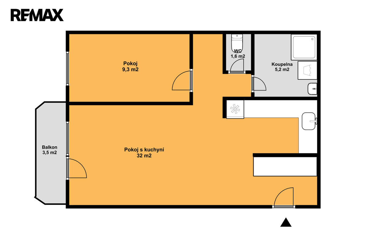 Byt se sestává z obývacího pokoje s kuchyní, ložnice, chodby, koupelny a WC.