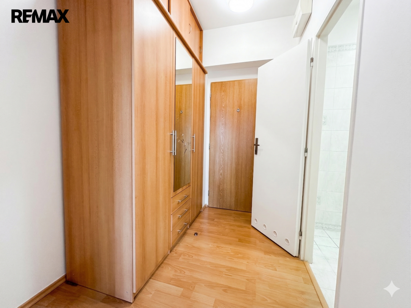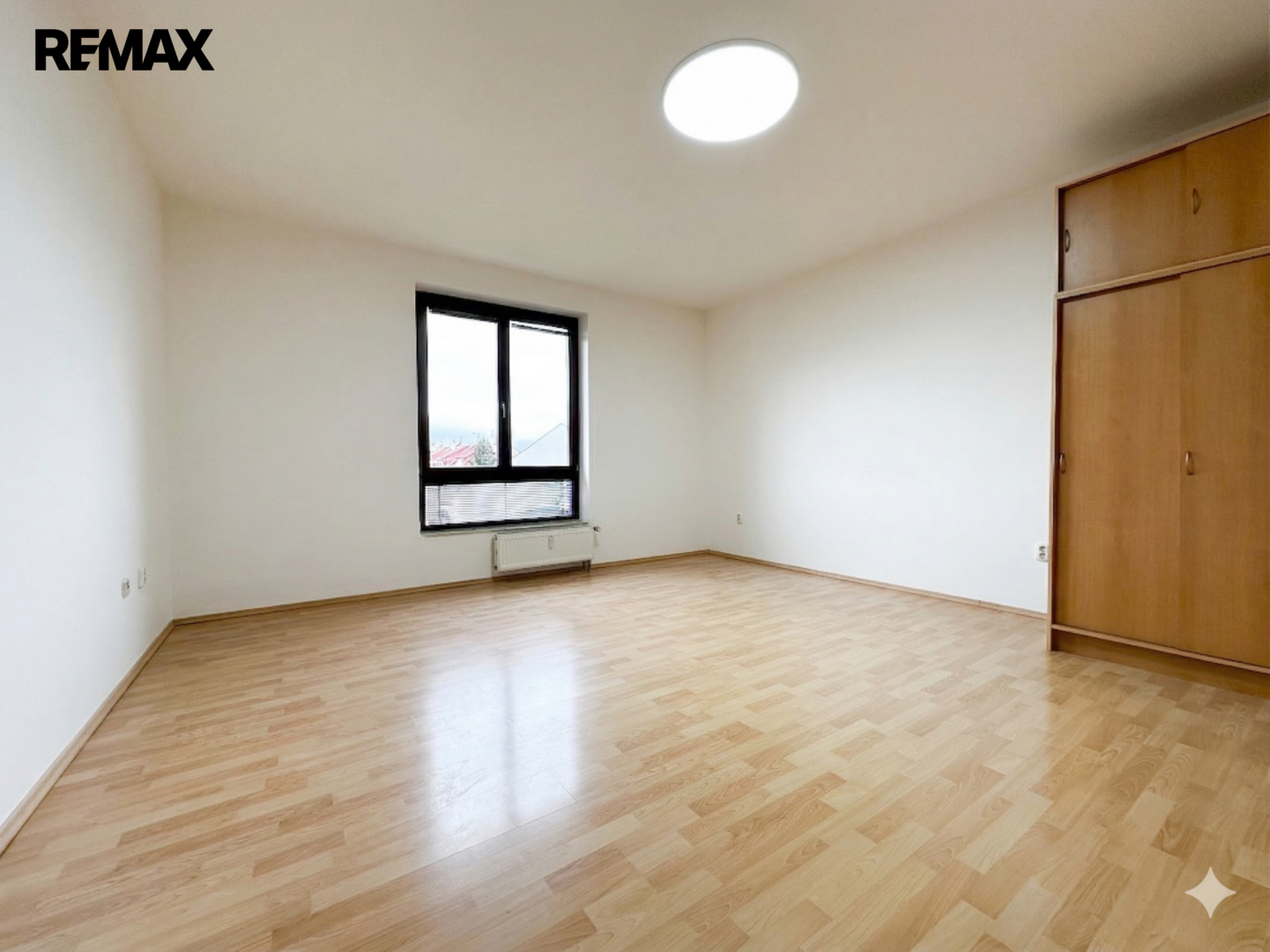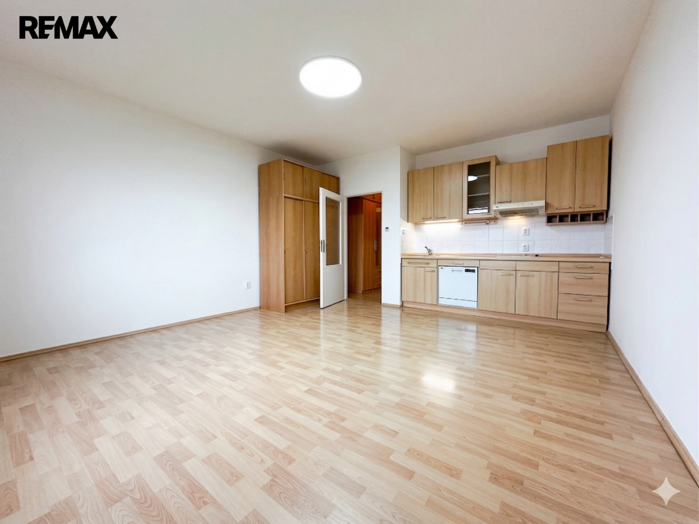 Byt sestává z prostorného obývacího pokoje s moderním kuchyňským koutem, koupelny se sprchovým koutem a toaletou a vstupní chodby s velkorysými vestavěnými úložnými prostory. Byt se pronajímá jako nevybavený, součástí vybavení je kuchyňská linka s vestavěnými spotřebiči (včetně myčky nádobí) a šatní skříň v předsíni. Interiér je ve velmi dobrém stavu, s plovoucími podlahami a plastovými okny se žaluziemi.