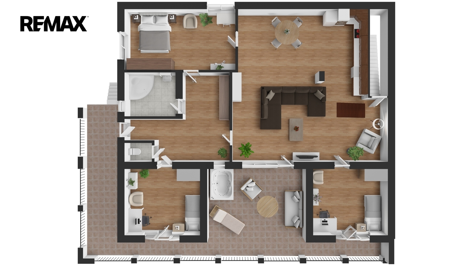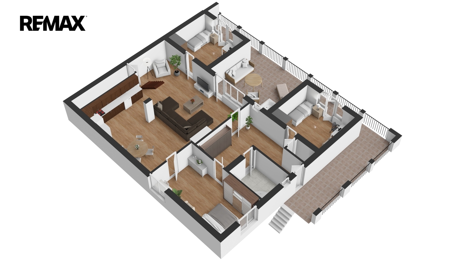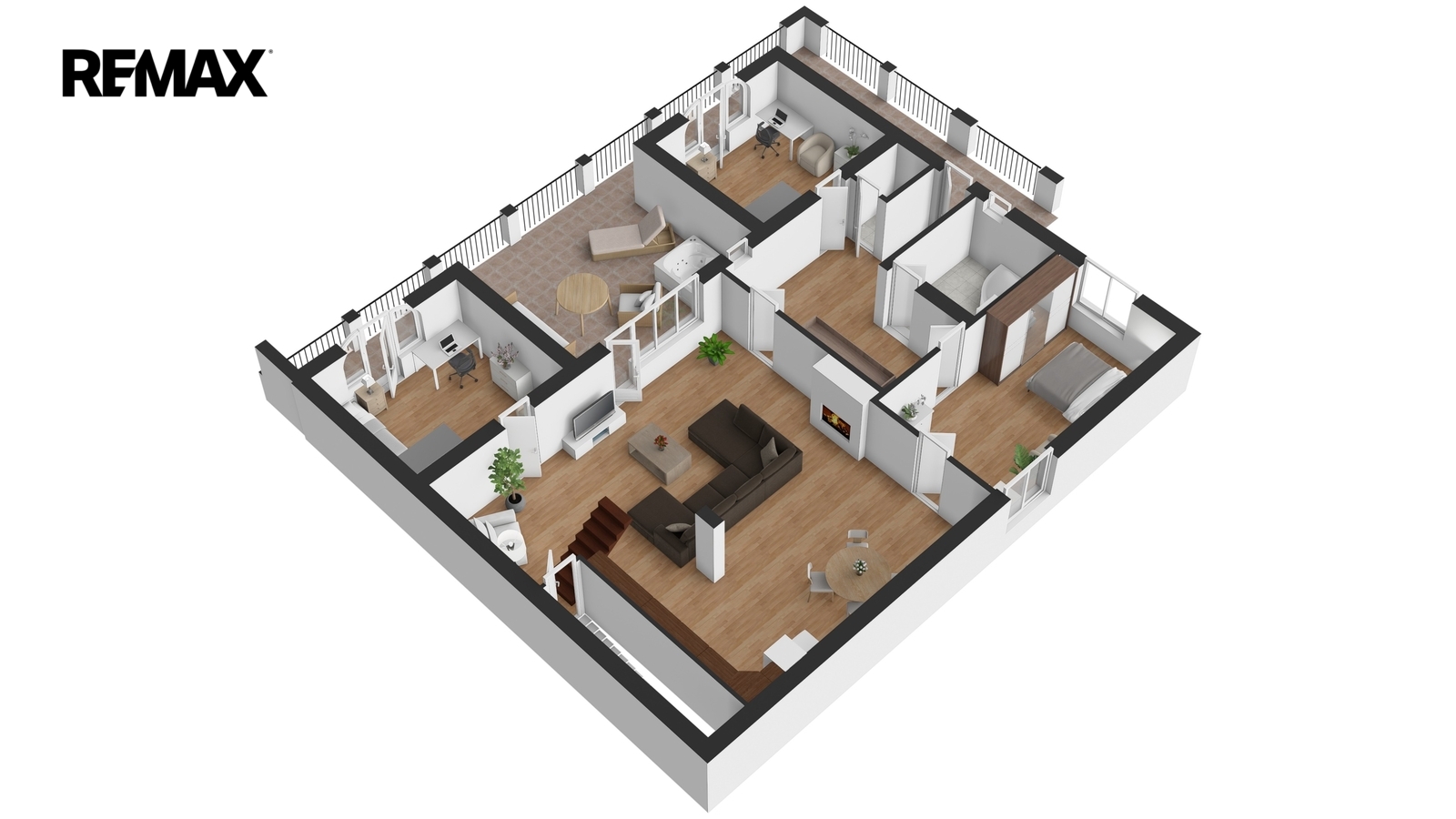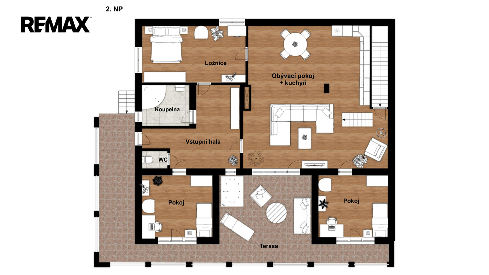 Horní podlaží tvoří klidná obytná část. Dominantou je světlý obývací prostor s možností vybudovat kuchyni a jídelní kout, který přirozeně propojí celou rodinu. Navazuje na něj terasa s výhledem do zeleně – ideální pro ranní kávu i večerní odpočinek. Dále zde najdete ložnici a dva samostatné pokoje (dětské pokoje, pracovna či pokoj pro hosty), koupelnu s rohovou vanou a samostatné WC. Dispozice je přehledně zpracována v 2D/3D půdorysech a vizualizacích.