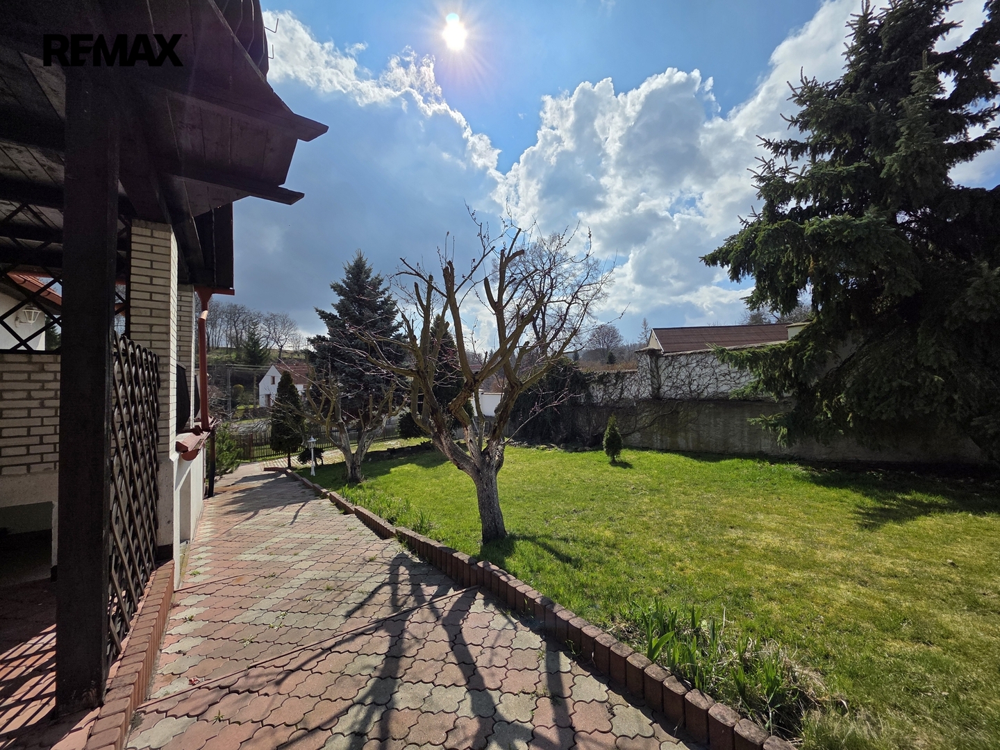 Oplocený pozemek je prakticky rozdělen na zpevněnou plochu pro parkování a práci a klidovou zahradu pro odpočinek. Najdete zde ovocné stromy, prostor pro pěstování i dětské hry. Součástí zpevněné plochy je podzemní nádrž na dešťovou vodu.