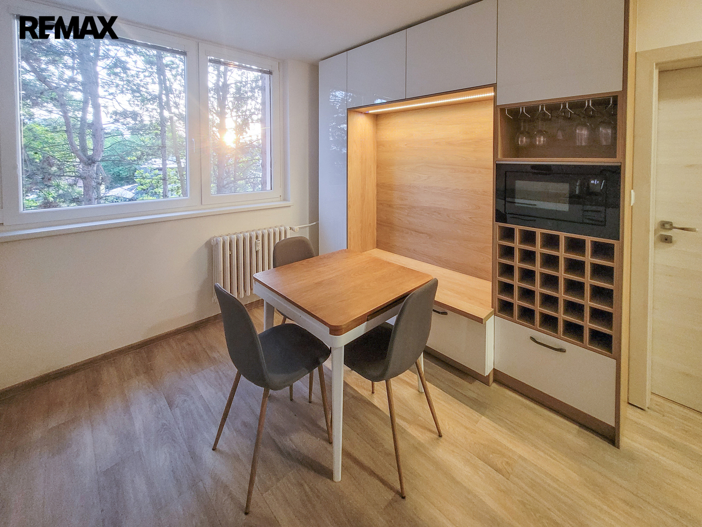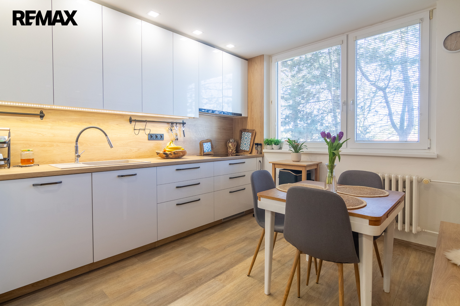 Byt prošel v nedávné době rekonstrukcí. Má nové rozvody elektřiny, zděnou koupelnu s vanou, plovoucí podlahy a hlavně na míru zhotovenou kuchyňskou linku s vestavěnými spotřebiči - myčka, indukce, lednice s mrazákem, mikrovlnka, trouba, digestoř, která je chloubou celého bytu. Byt nabízí také dostatek úložného prostoru - vestavěné skříně v pokojích, na chodbě. Byt se nabízí pouze částečně zařízený - jídelní stůl s židlemi, komoda v ložnici, knihovnička a police v dětském pokoji.