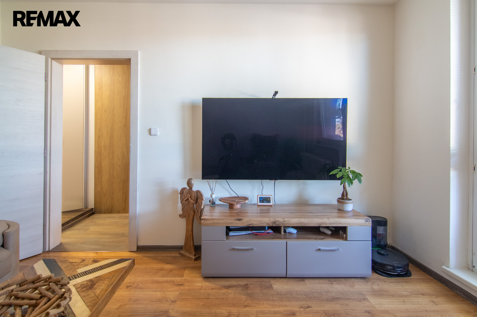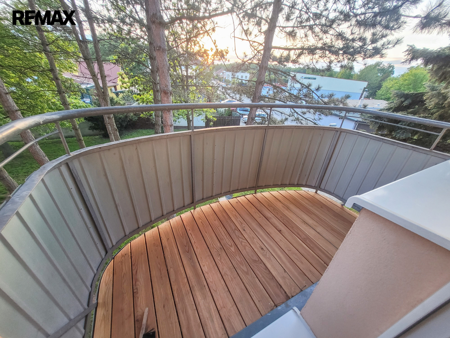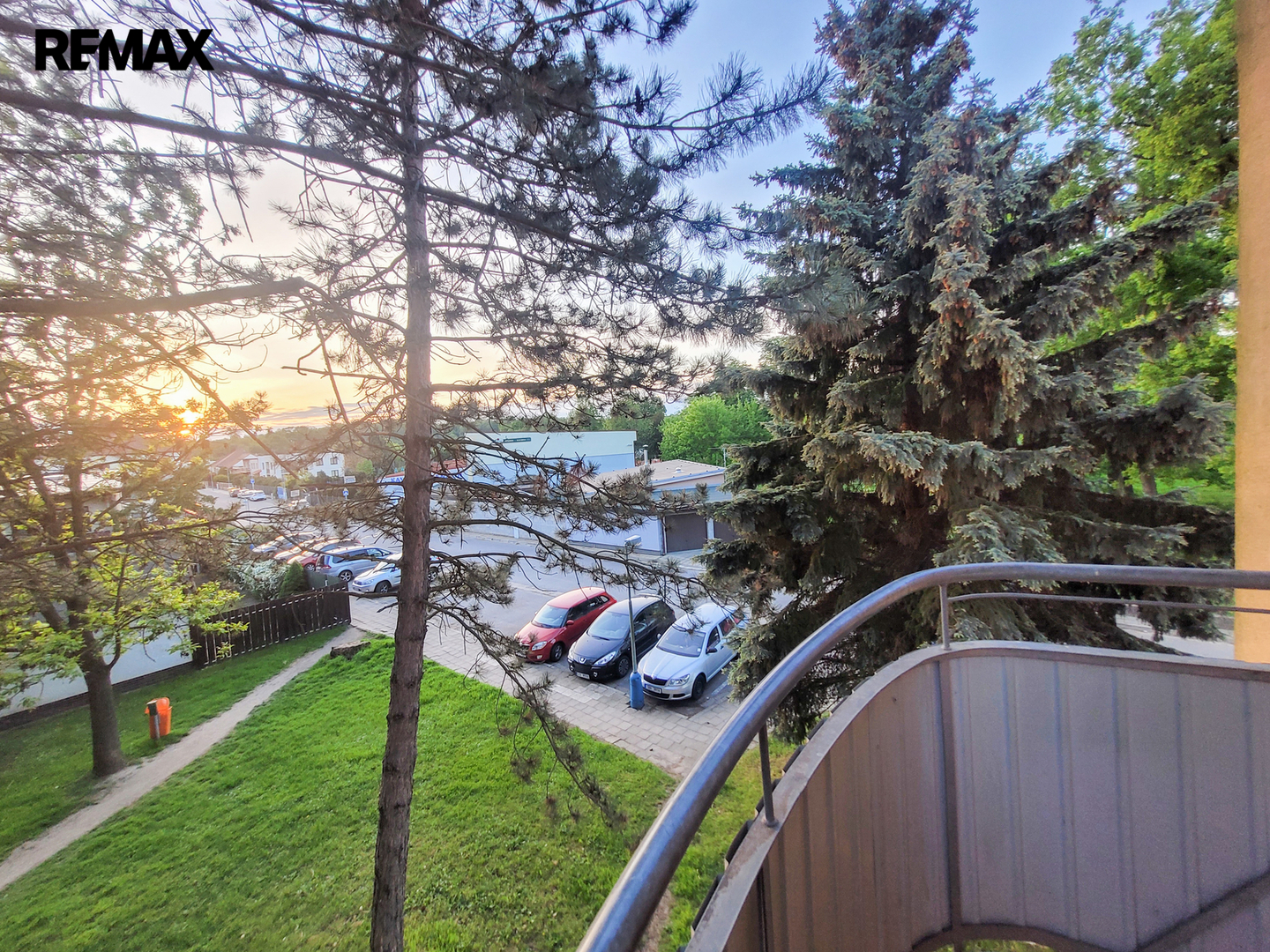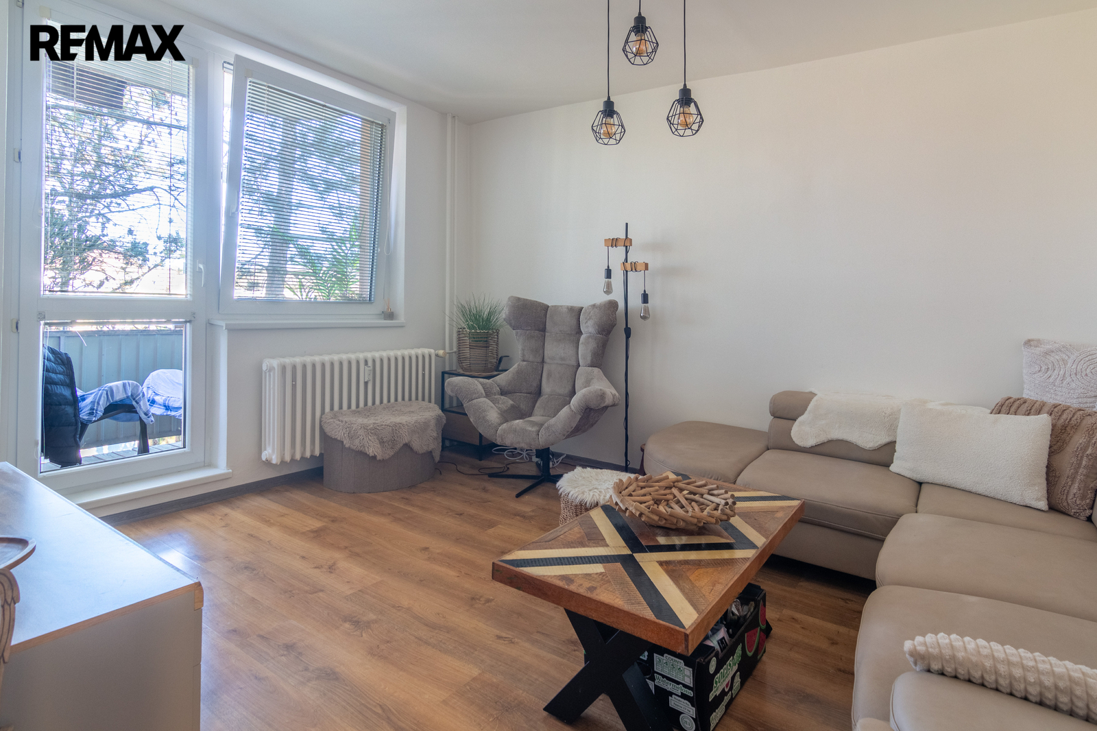 Z obývacího pokoje vedou dveře na balkón orientovaný do zeleně.
