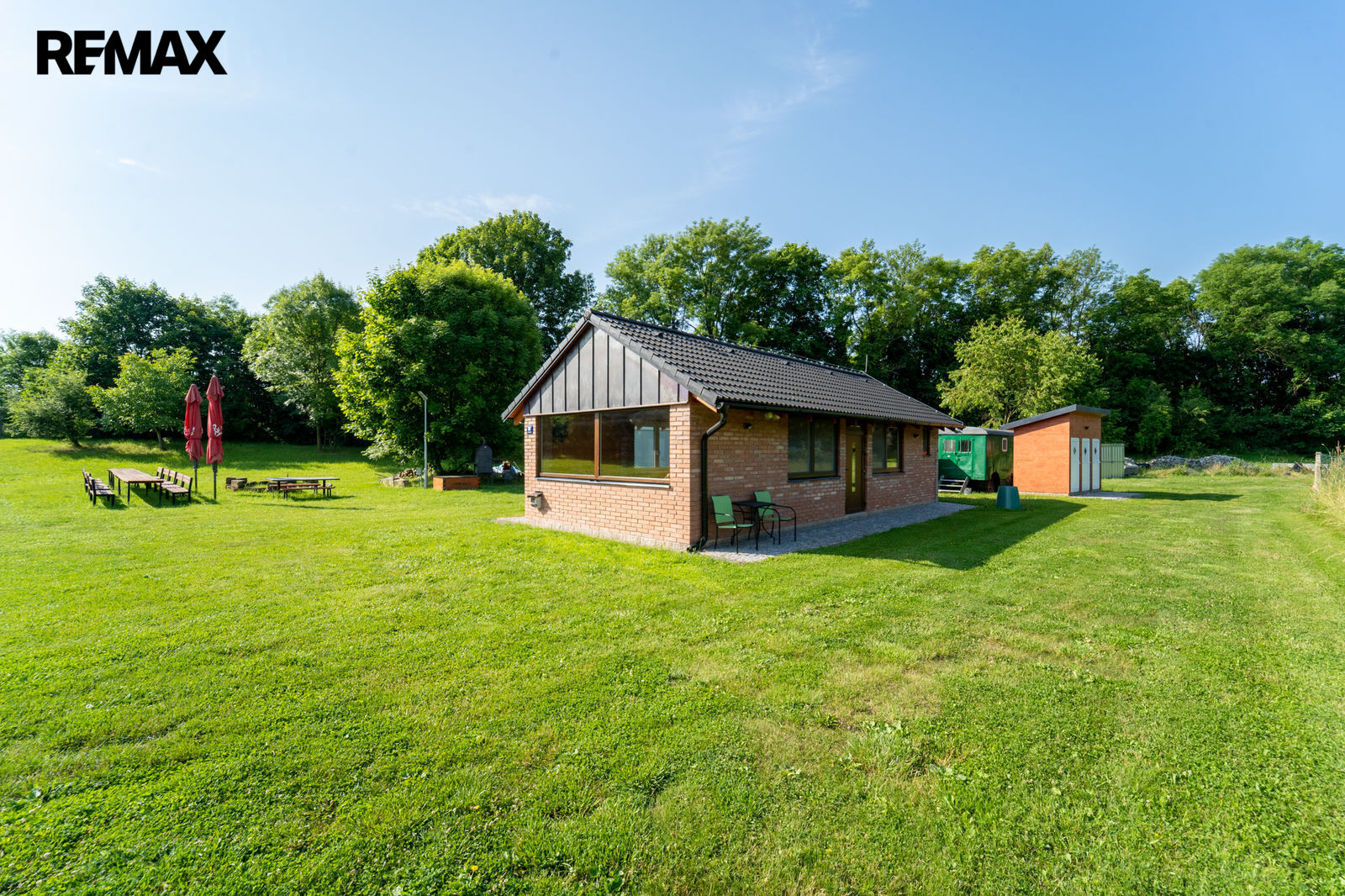 Resort je oplocený s příjezdovými vraty připravenými na dálkové ovládání. Na pozemku je hlavní společenská cihlová budova 60m2 zkolaudovaná v roce 2019. Budova je plně vybavená - výčepním zařízením, klimatizací (teplo-chlad), vodou, elektřinou, TV, plátnem s projektorem, zvukový audio systém, stoly, židle, WC a ostatní. Na pozemku je nadstandardně rozvedená elektřina 230V, 400V – 40A. Voda je z vlastní vrtané studně a rozvedená po pozemku ohřev je zajištěn průtokovým ohřívačem Stiebel Eltron. Na pozemku je přípojka na veřejnou kanalizaci, plyn není.
