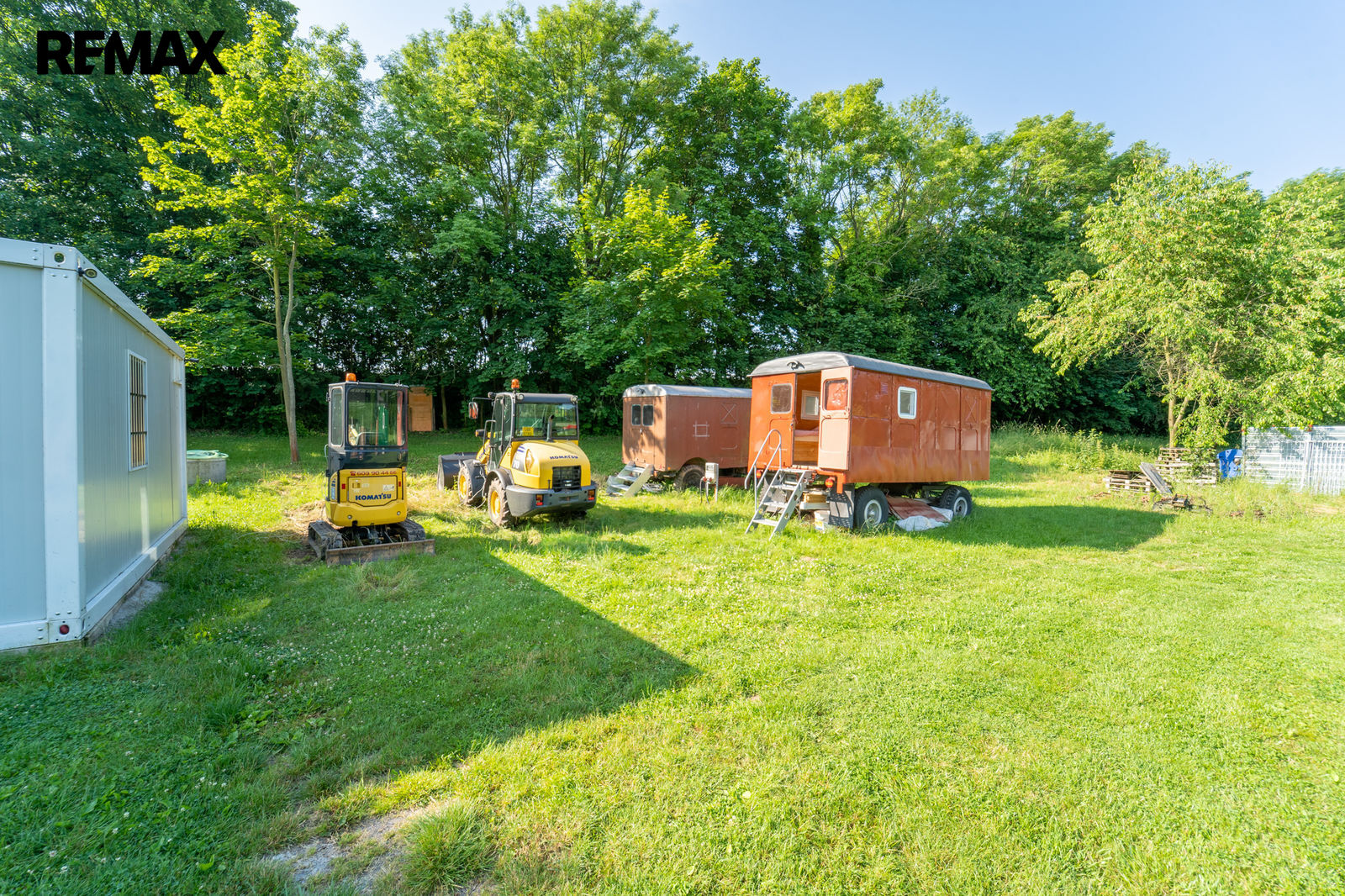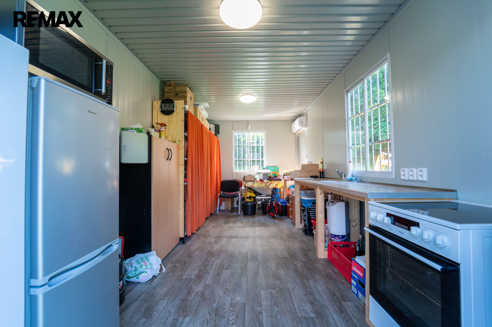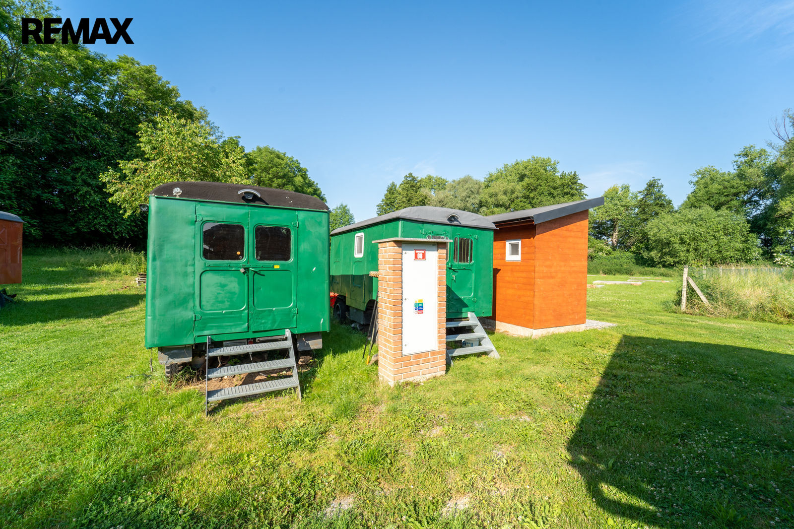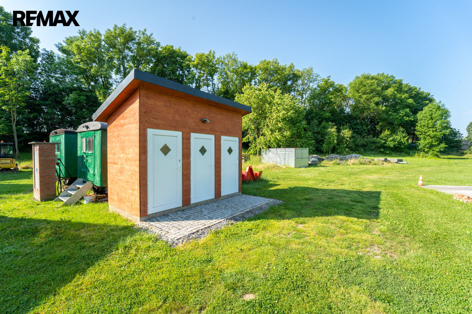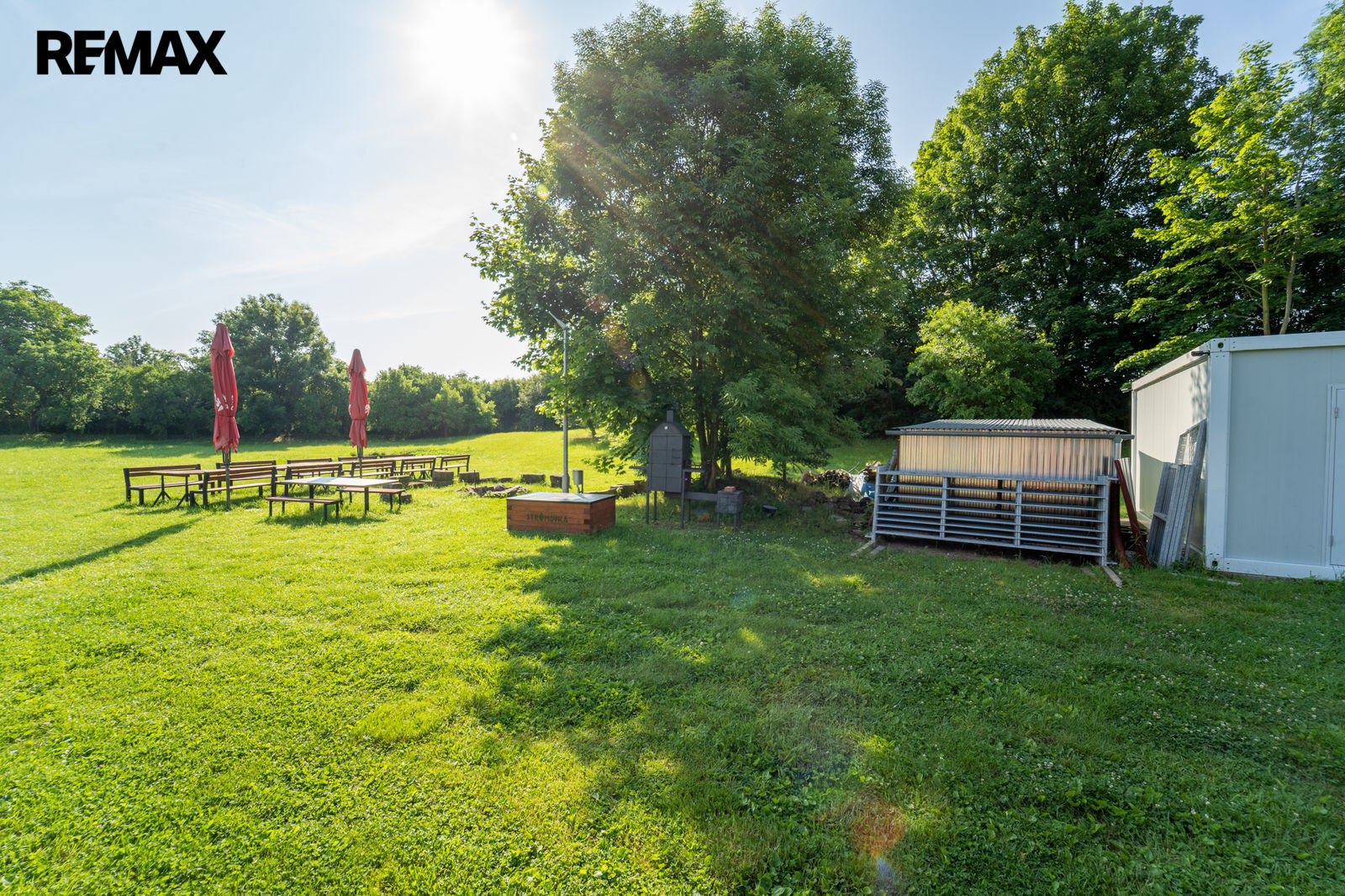 Na pozemku je vybavená kuchyně v kontejneru a sklad potravin s regály, pultem na připravu jídel, lednicí, mrazákem, mikrovlnou troubou, el. sporákem s troubou, vodou s průtokovým ohřívačem a klimatizací, atd.