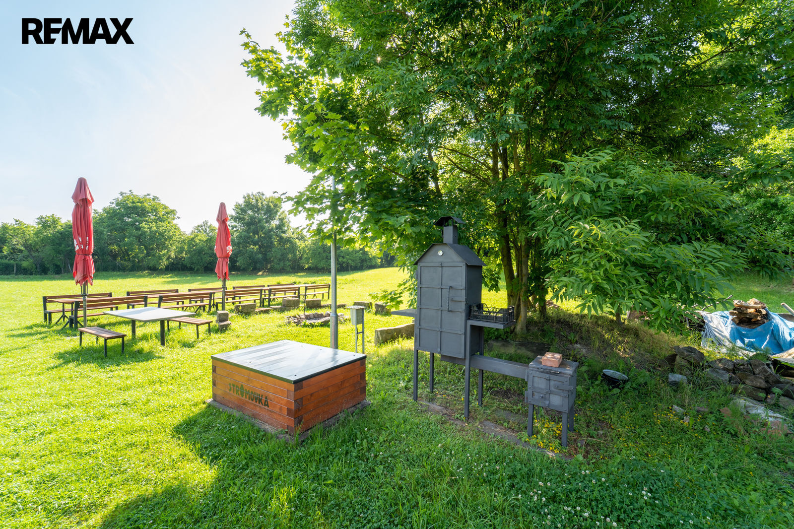 Venkovní posezení má přivedenou elektřinu na gril, součástí je udírna, venkovní ohniště vše je osvětleno solární lampou.