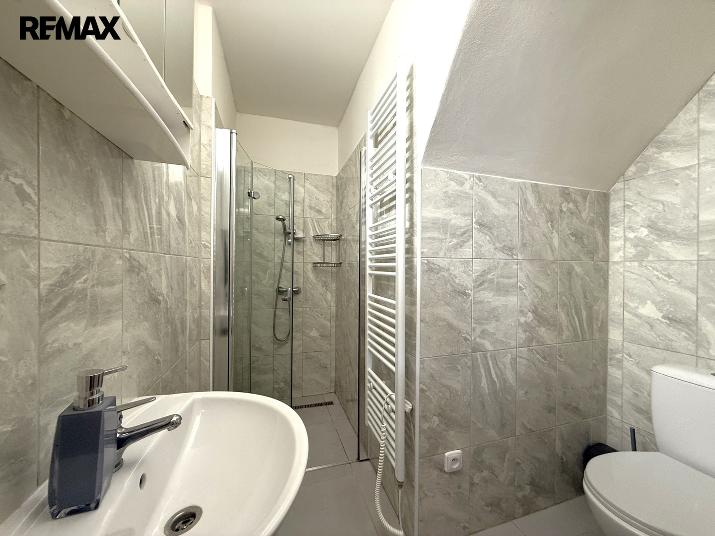 V patře jsou bytové prostory – jednotka 2+1 (cca 98 m²), další prostor (cca 48 m²) bez sociálního zázemí a rozvodů vody a vstup na prostornou půdu (cca 150 m²) vhodnou k dalšímu využití.