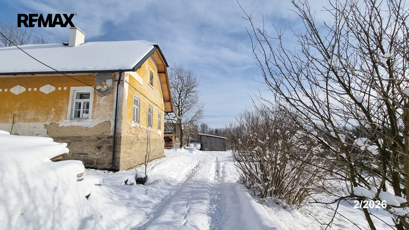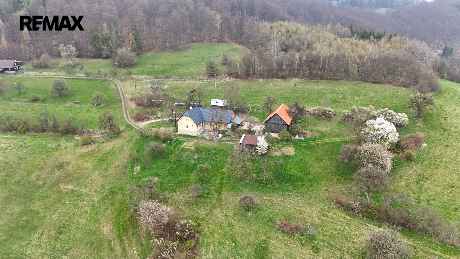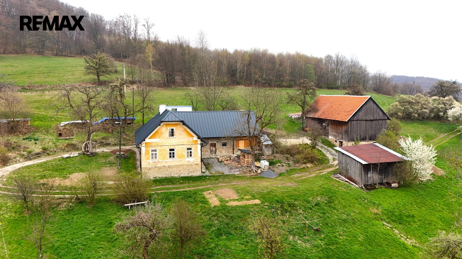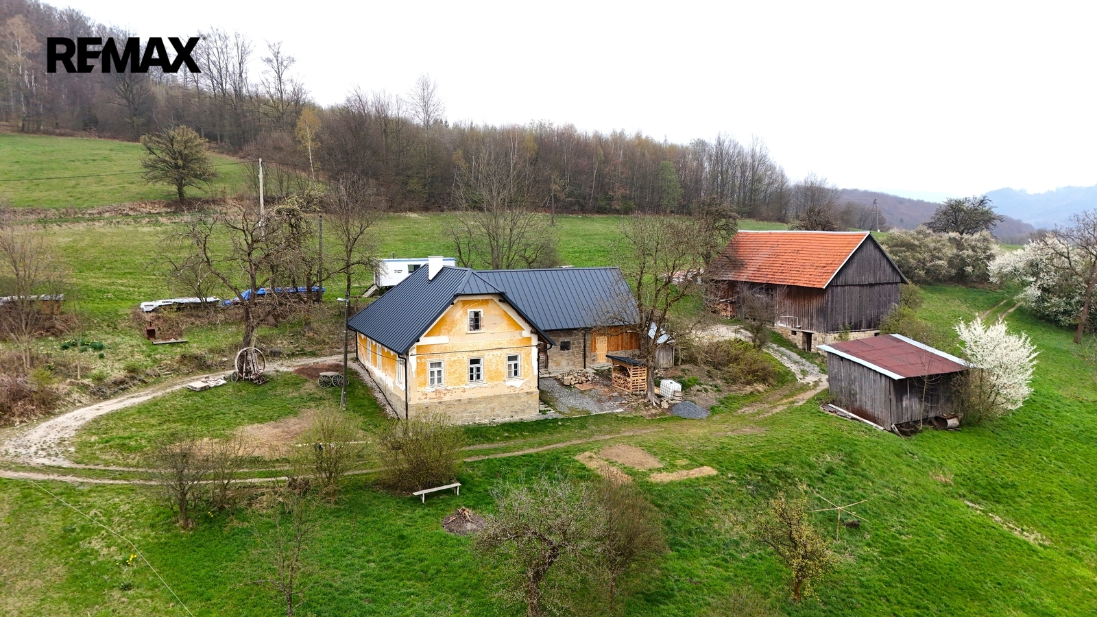 Kolem domu jsou stavby, stodola, bývalé chlévy.