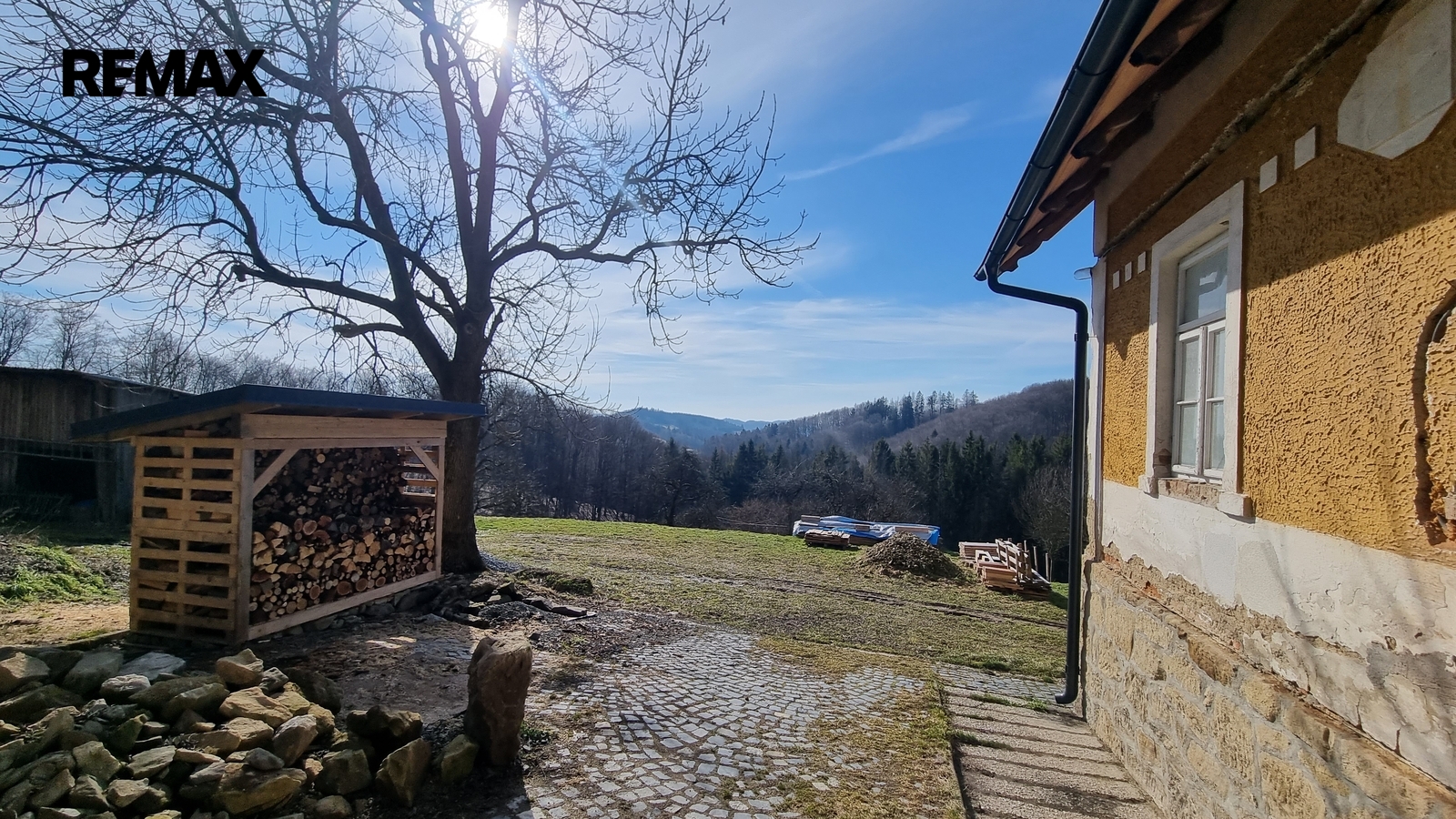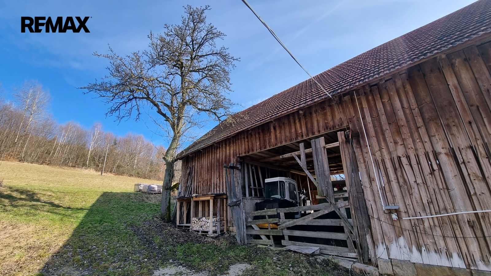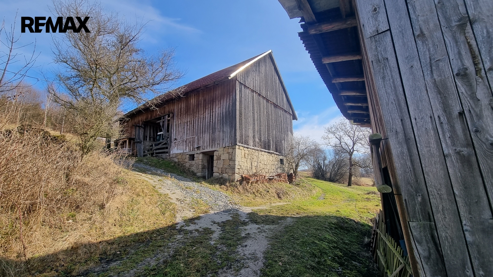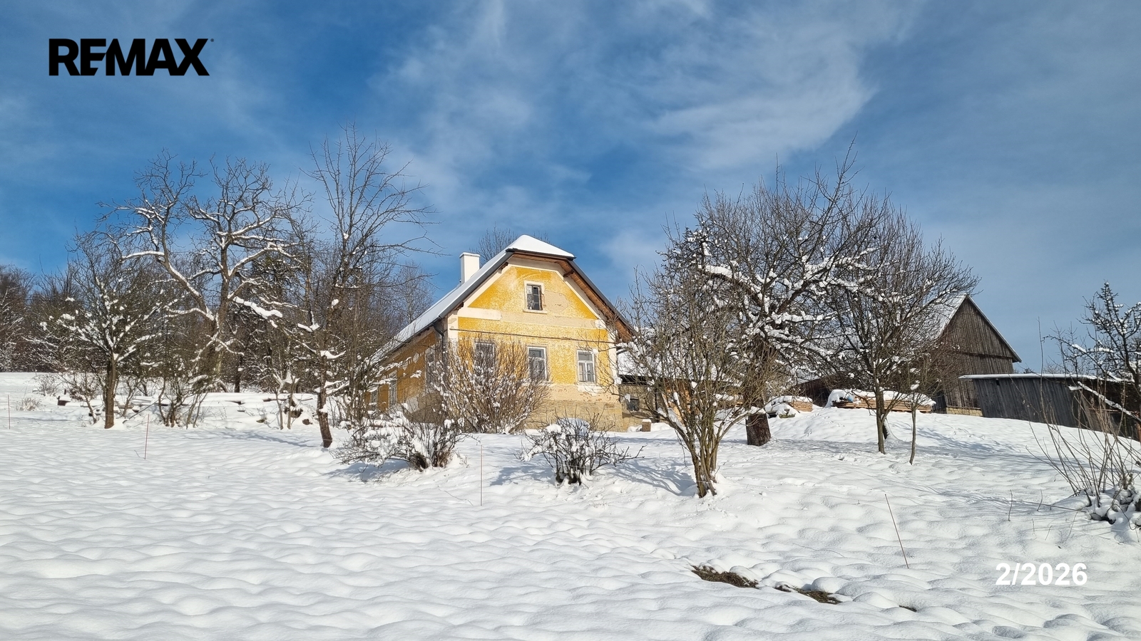 Kolem domu jsou stavby, stodola, bývalé chlévy.