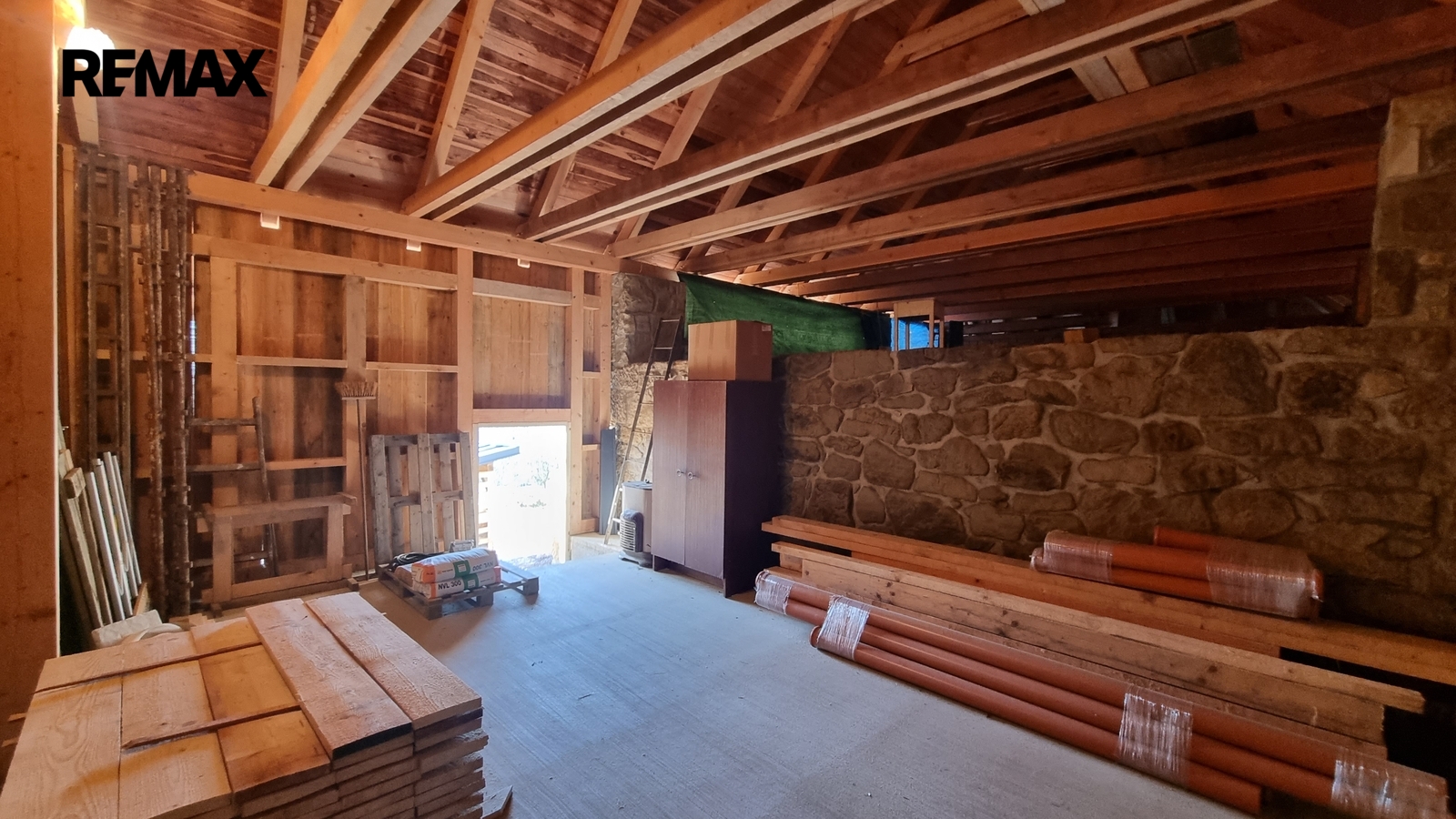 Pravá strana domu slouží jako garáž. V zadní části je samostatný vstup do malebného prostoru, kde je možné vybudovat např.saunu, nebo jinému využití. Bývalé chlévy jsou napojeny dveřmi na obytný prostor také s možností dalšího rozšíření.