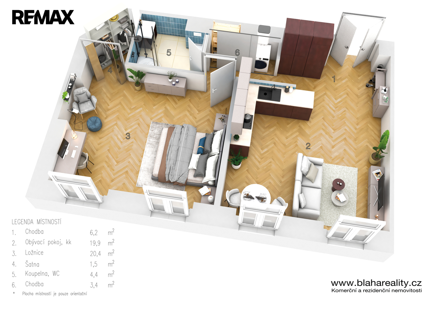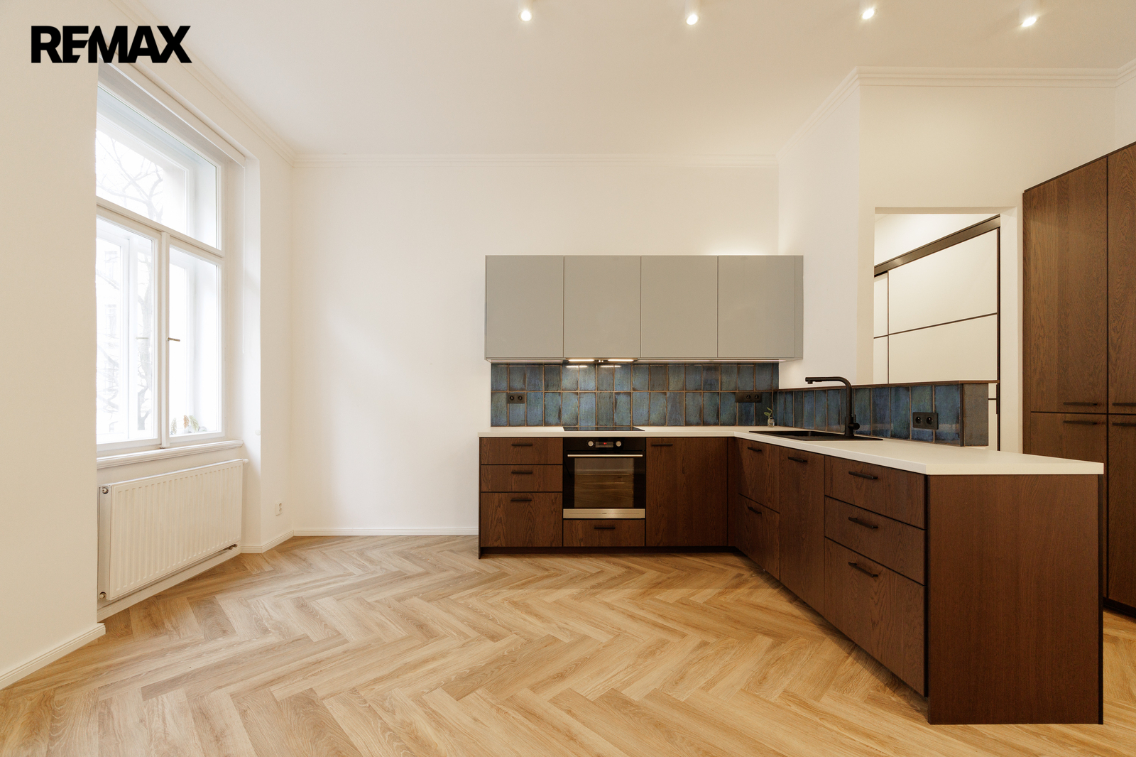 Byt je vybaven designovou kuchyní s myčkou nádobí, varnou deskou a troubou, doplněnou o kvalitní detaily včetně španělských obkladů. Součástí vybavení je také pračka, vestavěné skříně a velmi praktická šatna, která v bytech této kategorie bývá spíše výjimkou. V rámci rekonstrukce byl instalován také nový úsporný bojler na ohřev vody. Dispozice je navržena promyšleně a prostor využívá skutečně efektivně.