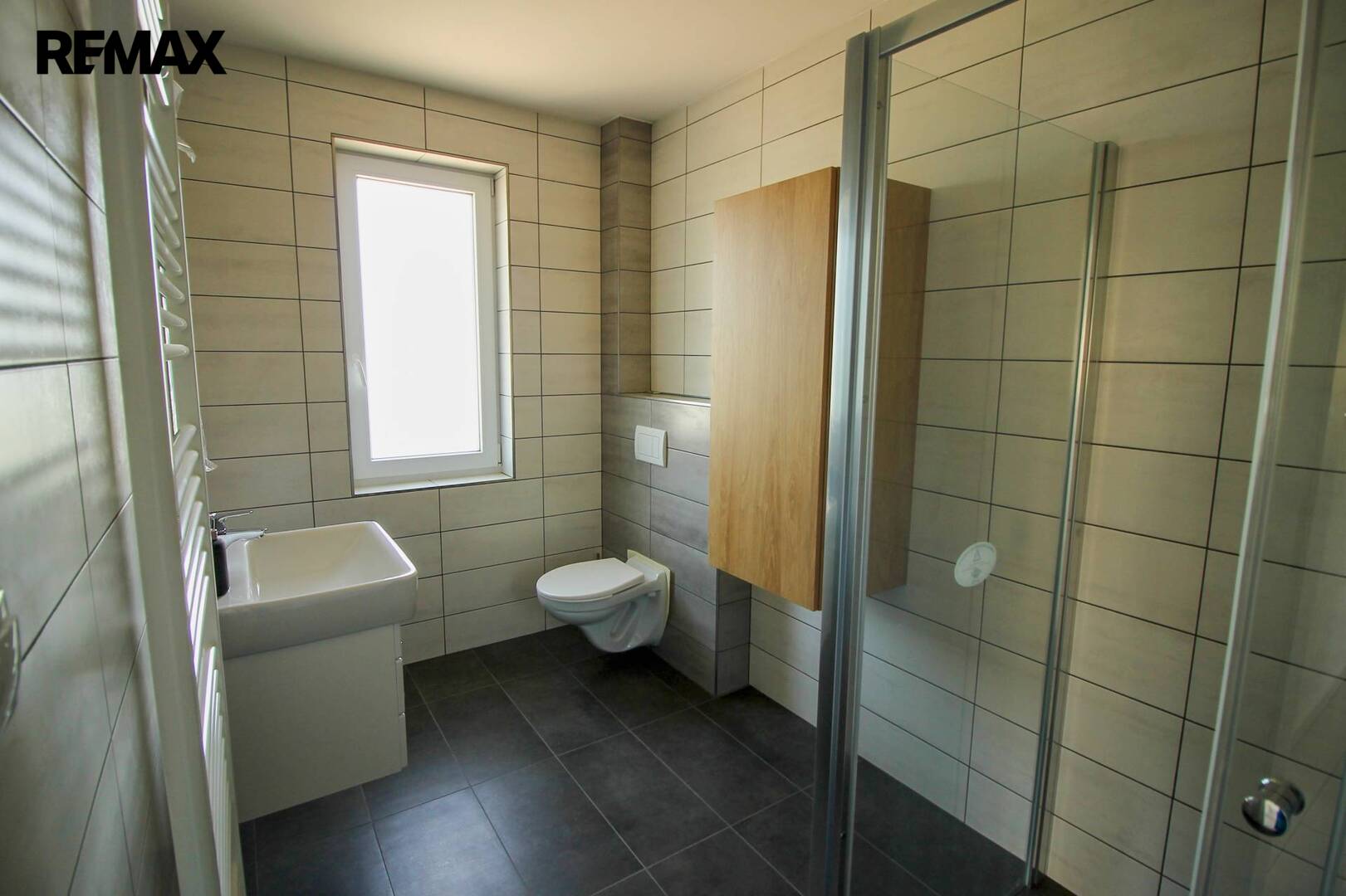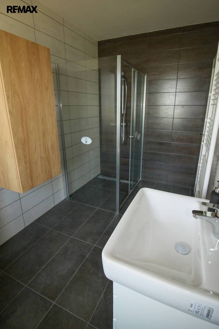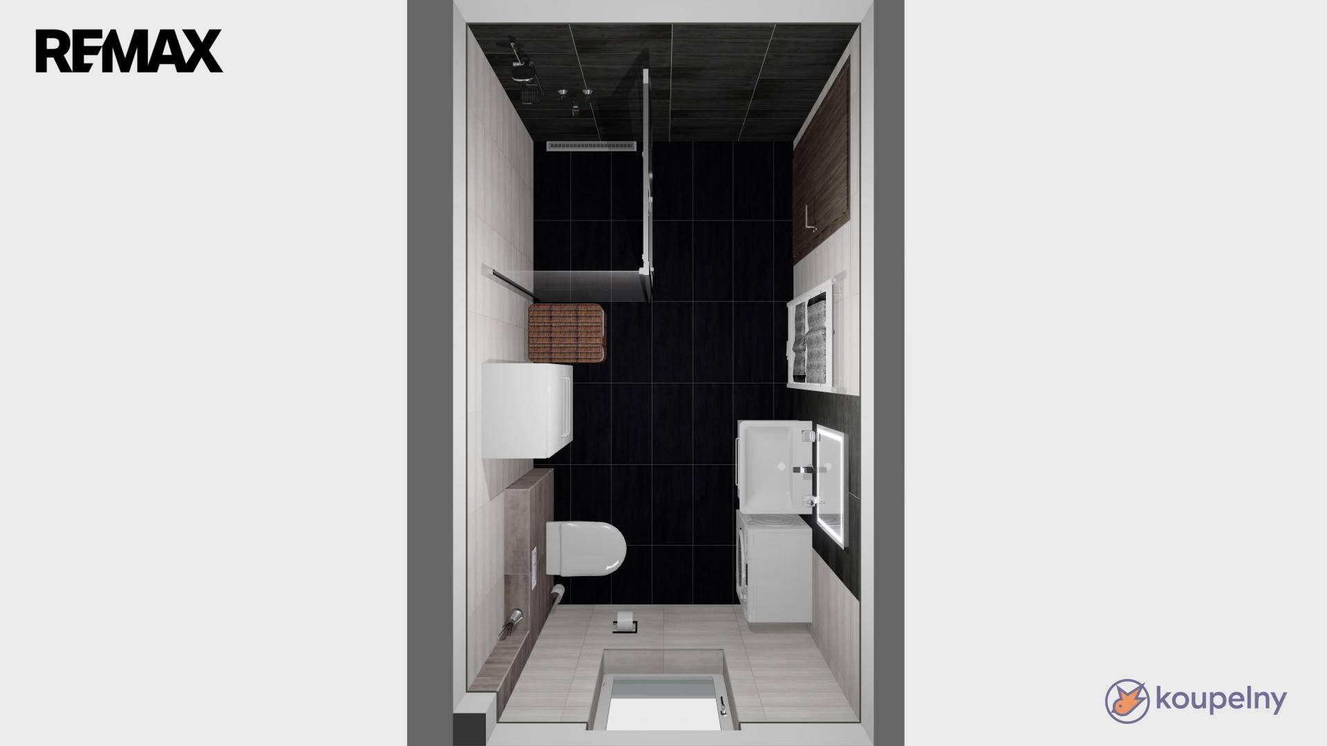 V koupelně osazen sprchový kout 120x90cm, WC, umyvadlo, zrcadlo s LED osvětlením, otopný žebřík a příprava na pračku příp. sušičku.