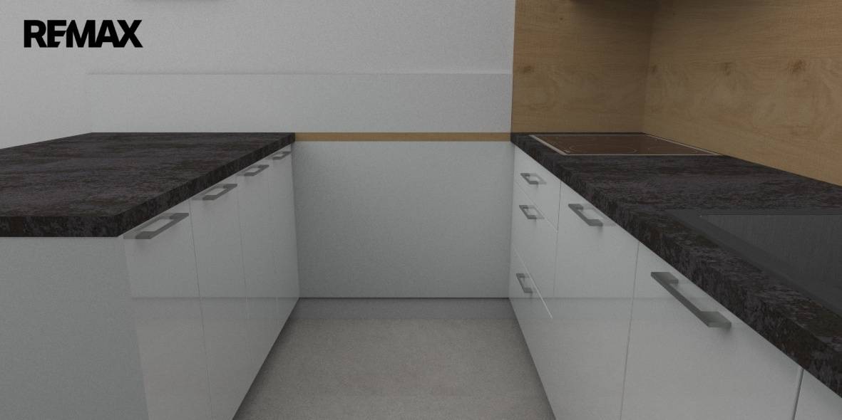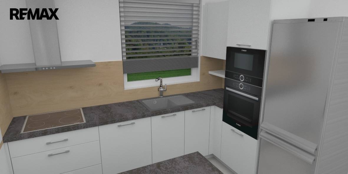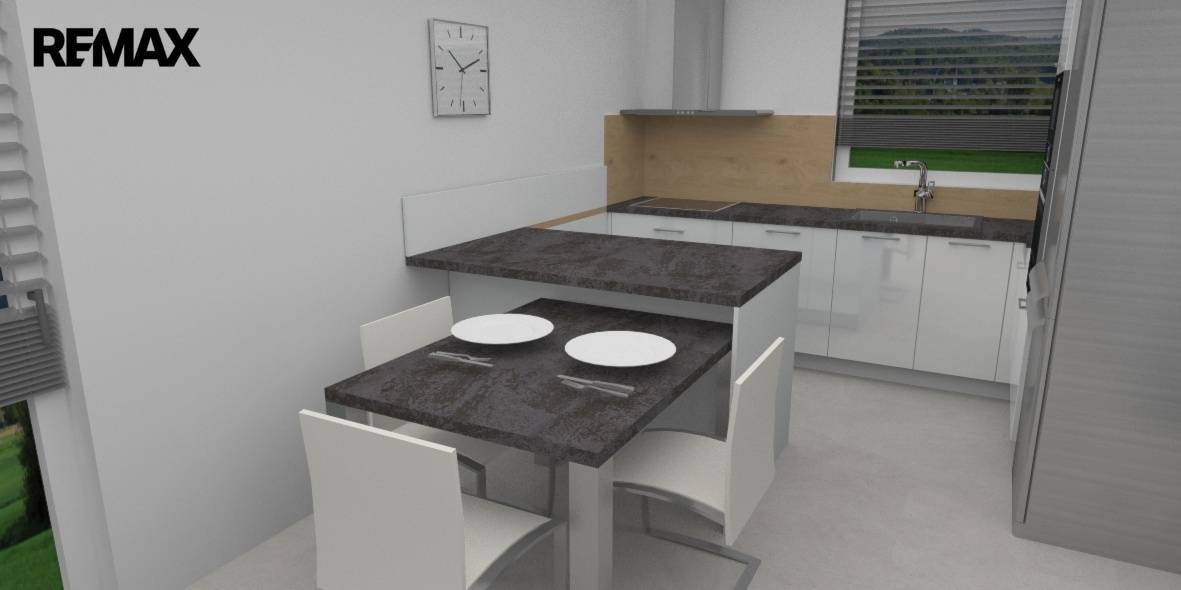 Kuchyňská linka osazena spotřebiči Elektrolux – sklokeramická deska + trouba, mikrovlnka, digestoř, osazen dřez s baterií, dále je součástí linky ostrůvek i samostatný jídelní stůl.
