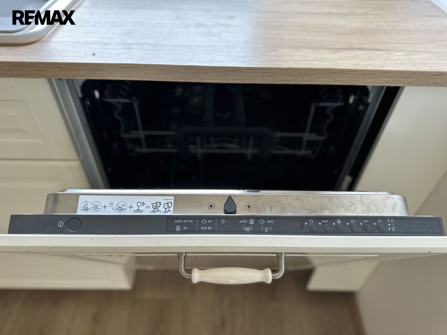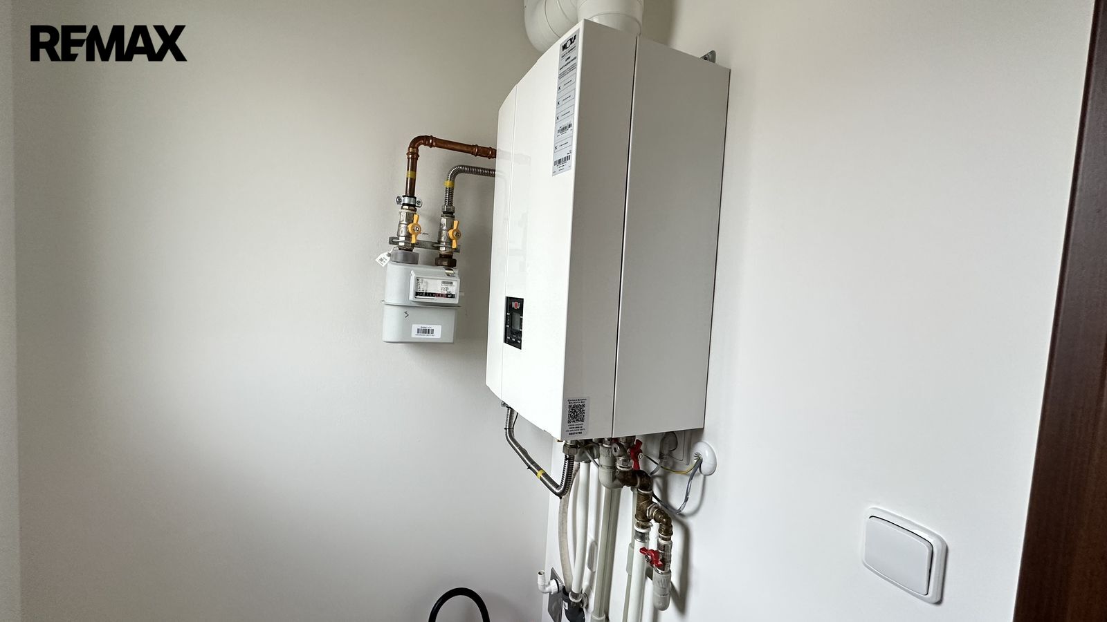 Dispozice bytu pak nabídne v 1. NP obývací pokoj, jenž je plynule propojený s prostorem kuchyně. Ta je vybavena kuchyňskou linkou s vestavnými spotřebiči. Dále vstupní chodbu, technickou místnost s plynovým kondenzačním kotlem (topení je podlahové), wc s umyvadlem a komoru.