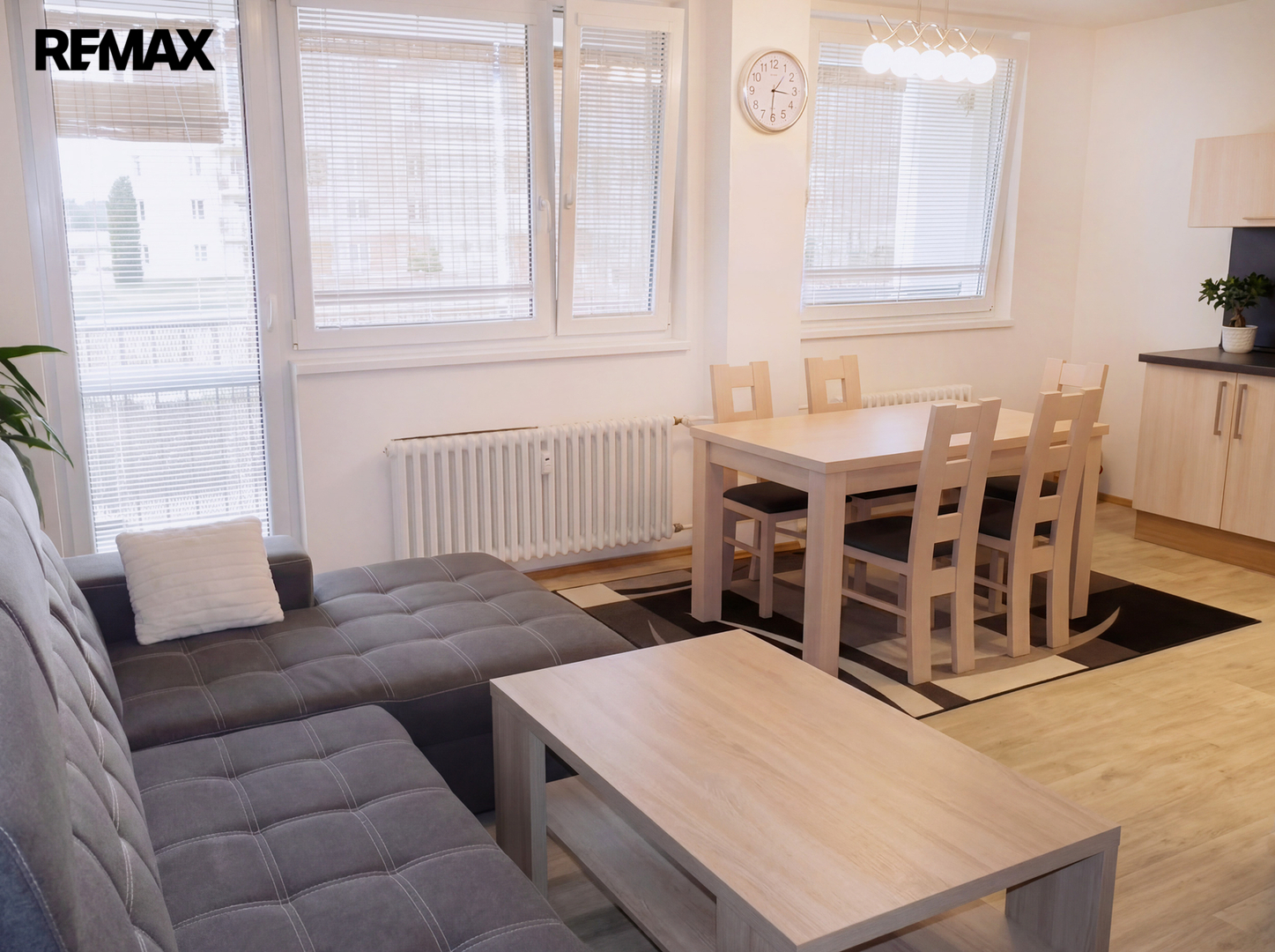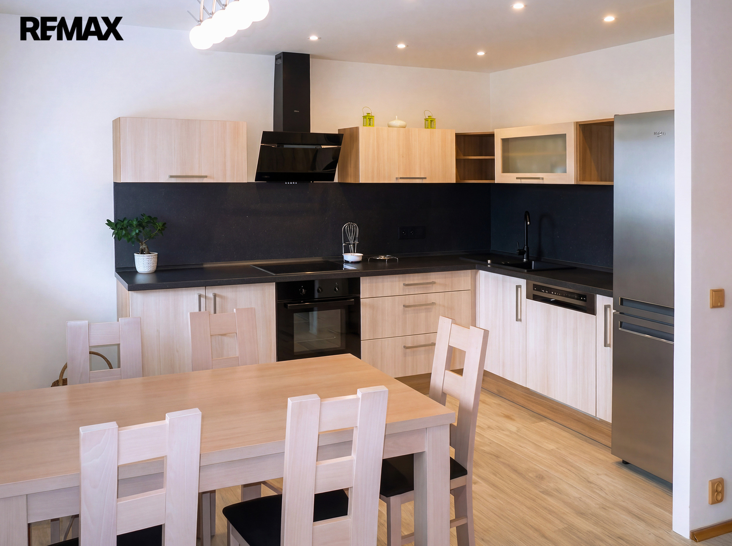 Dominantou bytu je obývací pokoj propojený s kuchyňským koutem, který je vybaven moderní kuchyňskou linkou se spotřebiči (varná deska, trouba, myčka, lednice). Z obývací části je přímý vstup na lodžii o velikosti 7,2 m², orientovanou na jihozápad, která nabízí příjemné místo pro relaxaci i posezení.