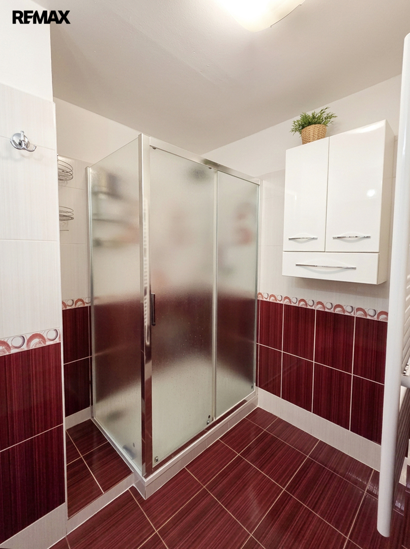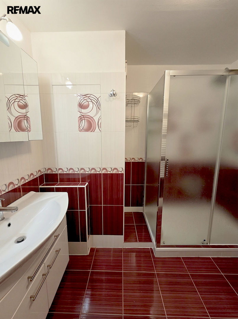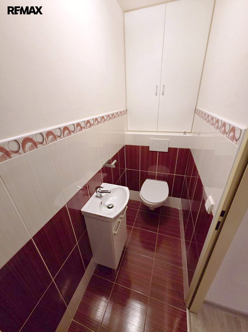 Součástí bytu je koupelna se sprchovým koutem a umyvadlem a samostatné WC s dalším umyvadlem.