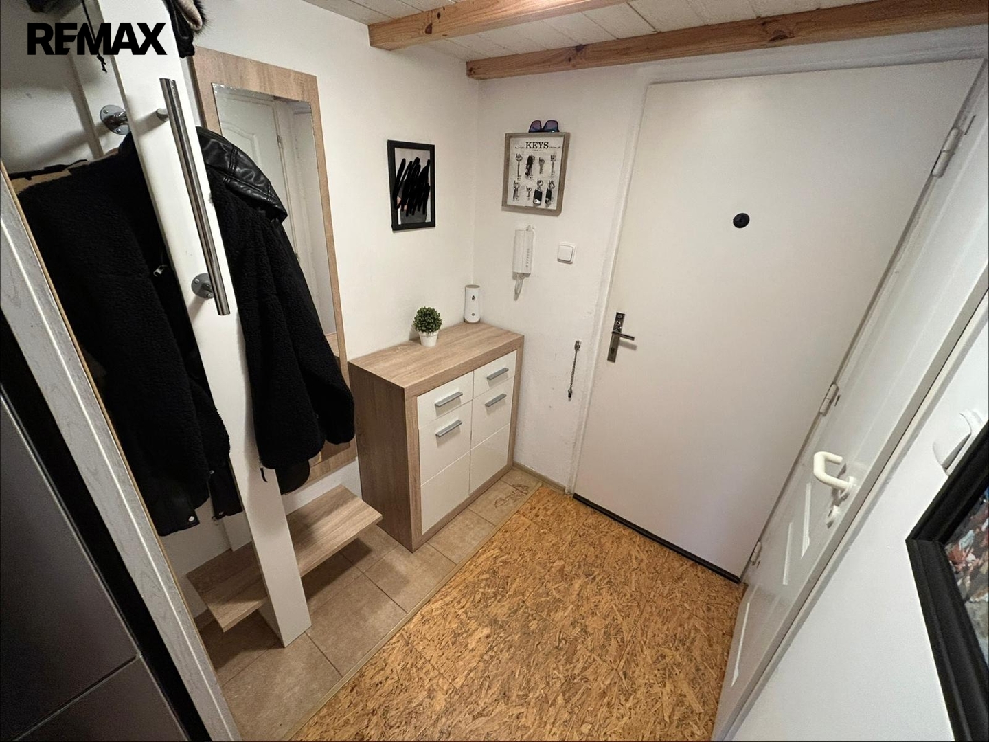 Byt je částečně vybavený, v ložnici se nachází vestavěná skříň, která nabízí dostatek úložného prostoru, kuchyně je vybavena jídelním stolem a čtyřmi židlemi, chodba je prakticky zařízená. Dispozice bytu působí vzdušně a nabízí komfortní bydlení jak pro pár, tak i menší rodinu.