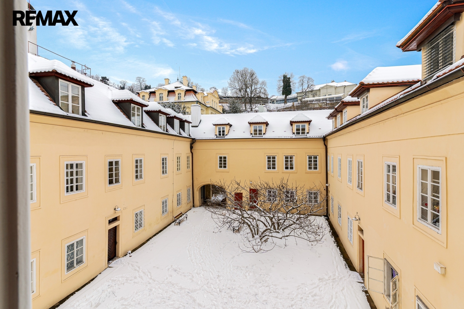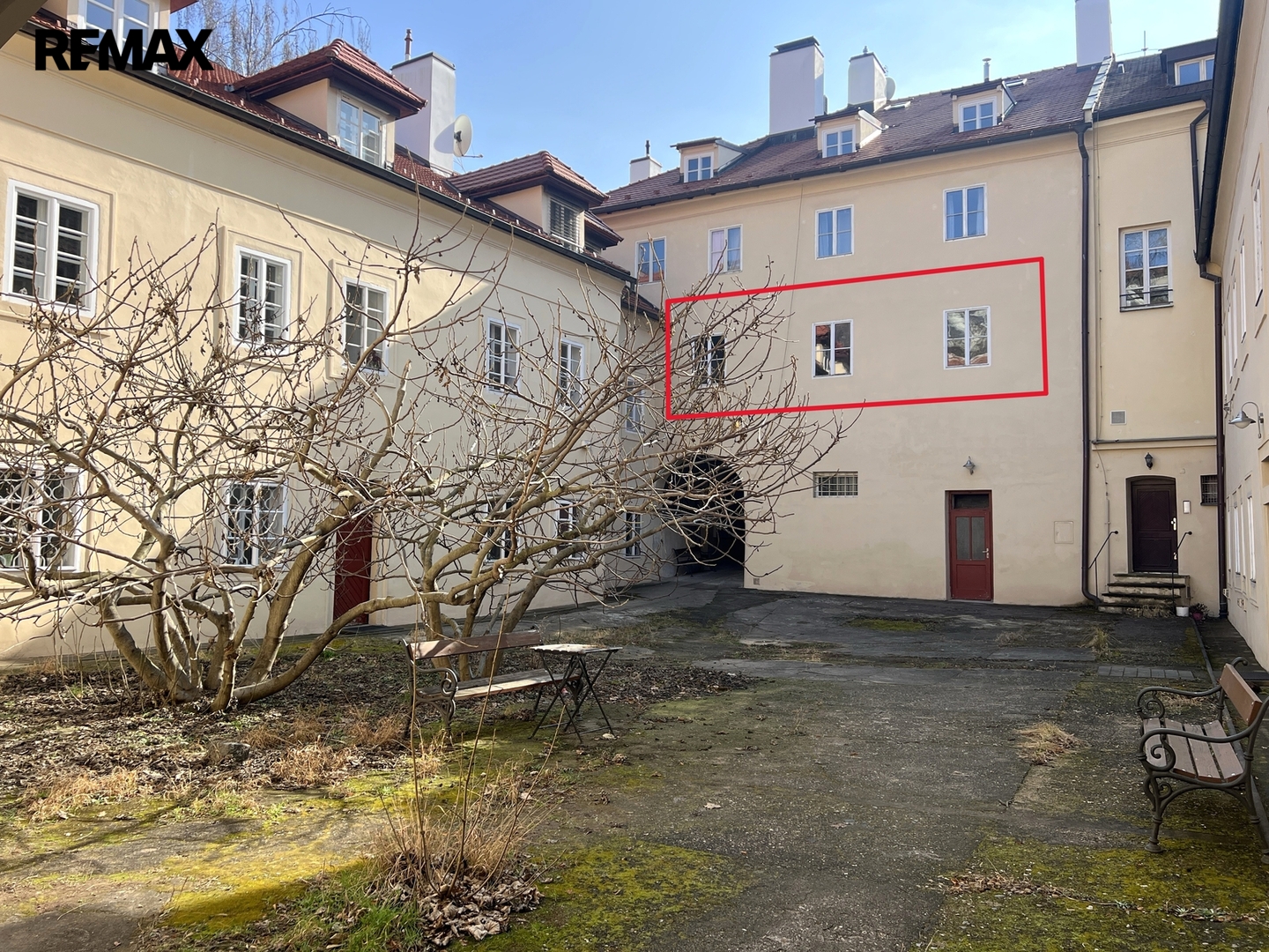 Byt se nachází v prvním patře, dům je bez výtahu. Okna vedou do ulice i do klidného dvora, ve kterém roste velký plodící fíkovník.