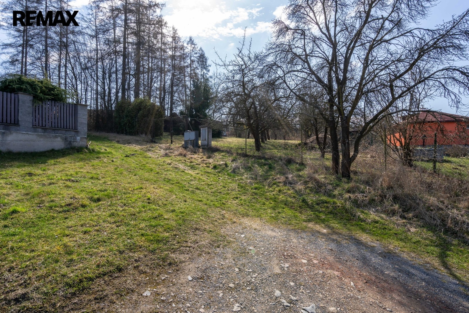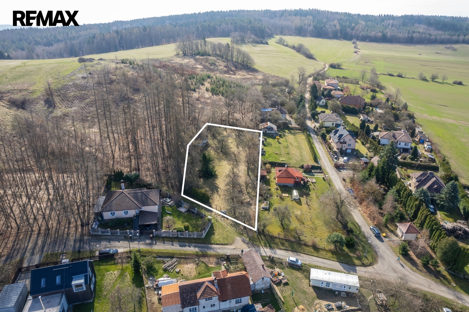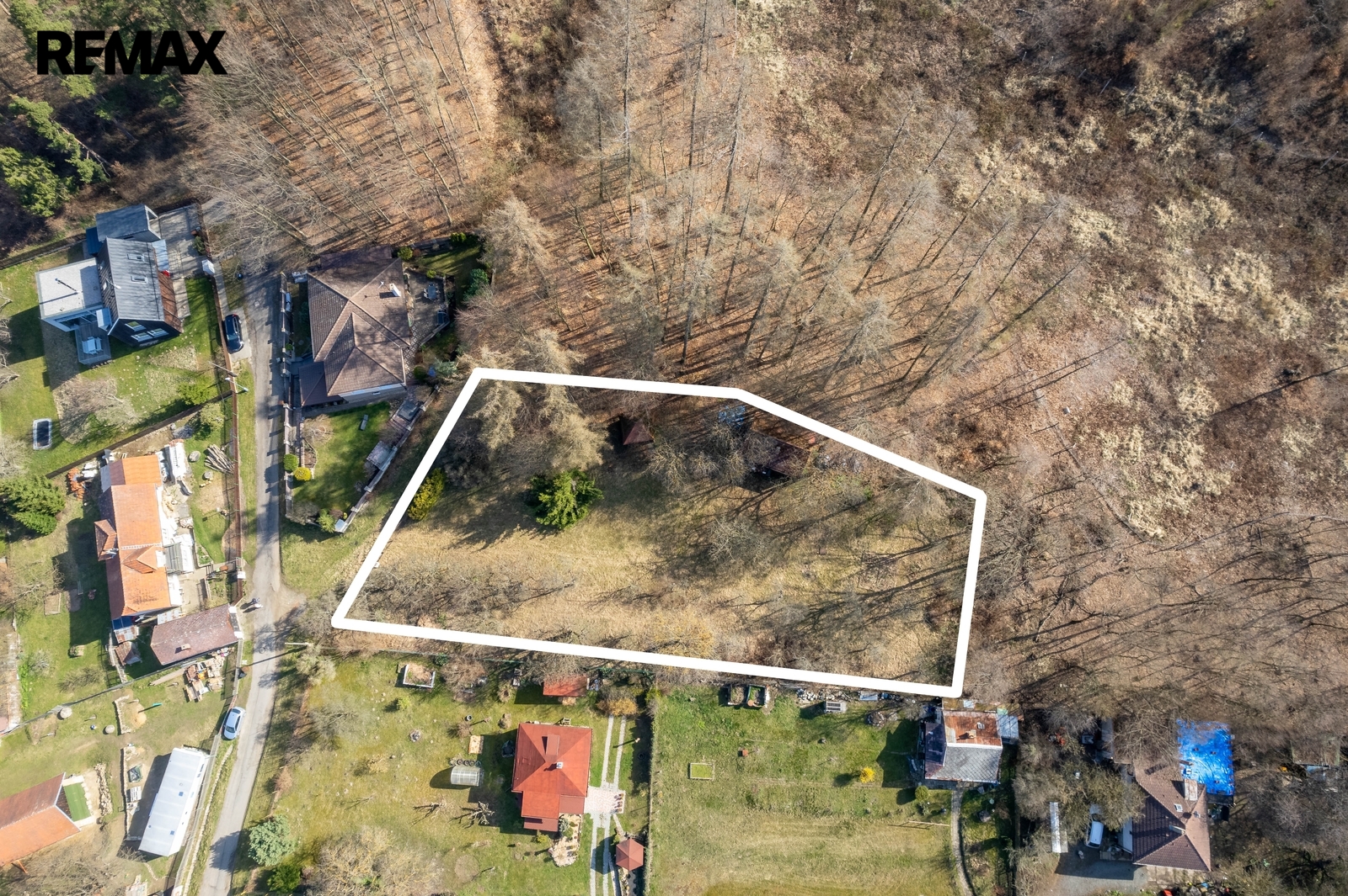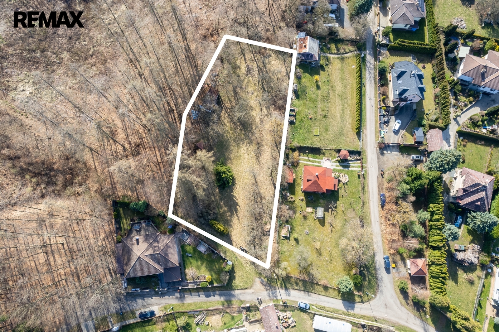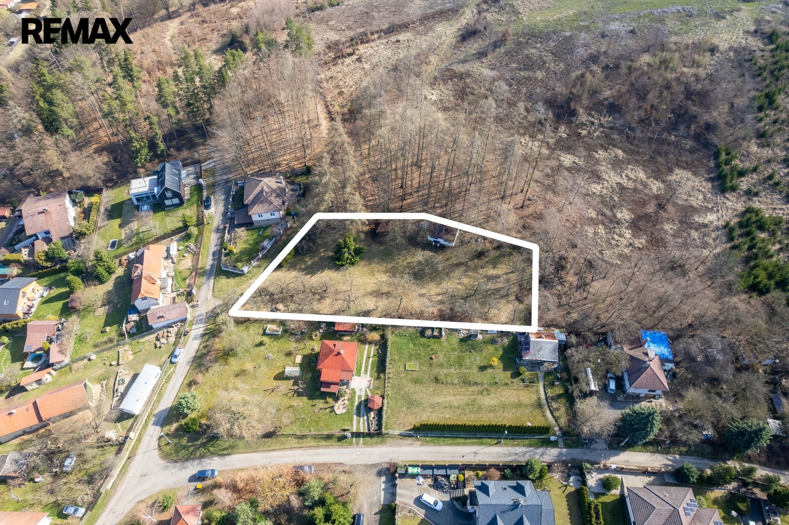 Pozemek je oplocený, sousedí se zahradami a malým hájkem, je přístupný vjezdem z ulice Na Boučí.