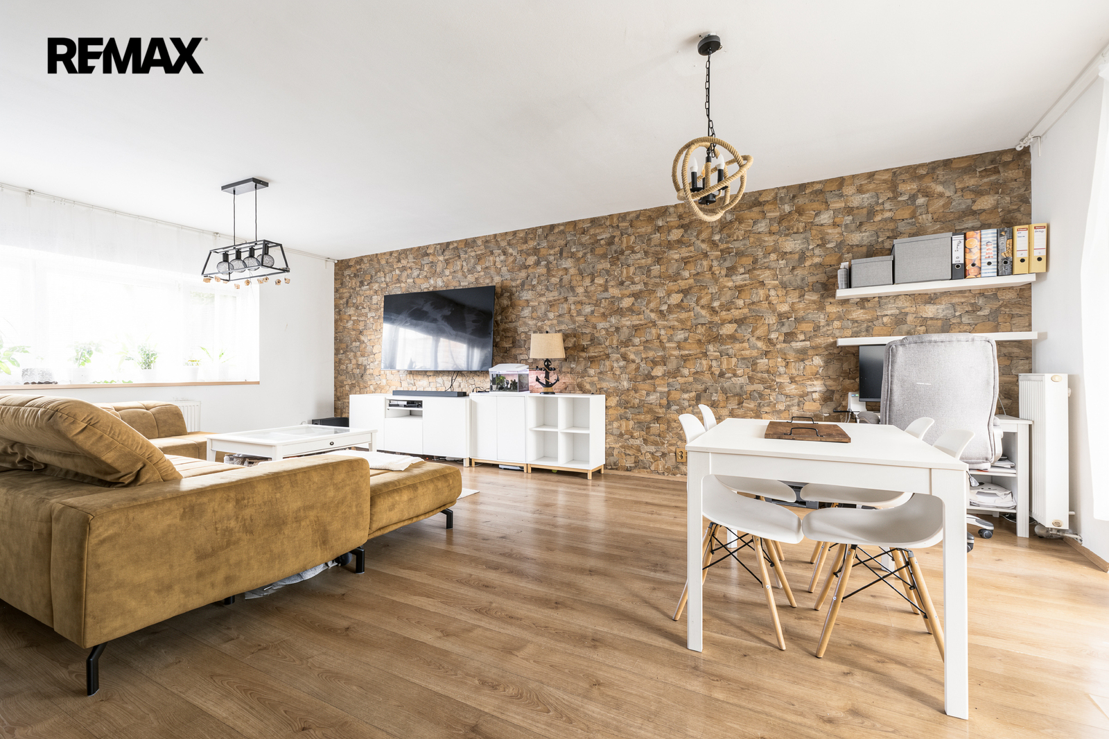 Dům je řešen jako dvoupodlažní a nabízí komfortní bydlení pro rodinu. V přízemí se nachází vstupní předsíň, technická místnost, samostatná toaleta a prostorný obývací pokoj s kuchyňským koutem. Dominantou této části je přímý vstup z obývacího pokoje na zahradu, která poskytuje ideální zázemí pro relaxaci, posezení s rodinou či přáteli nebo dětské hry.