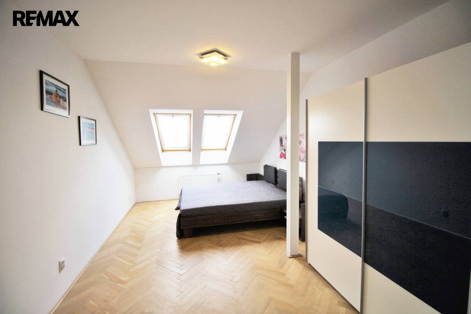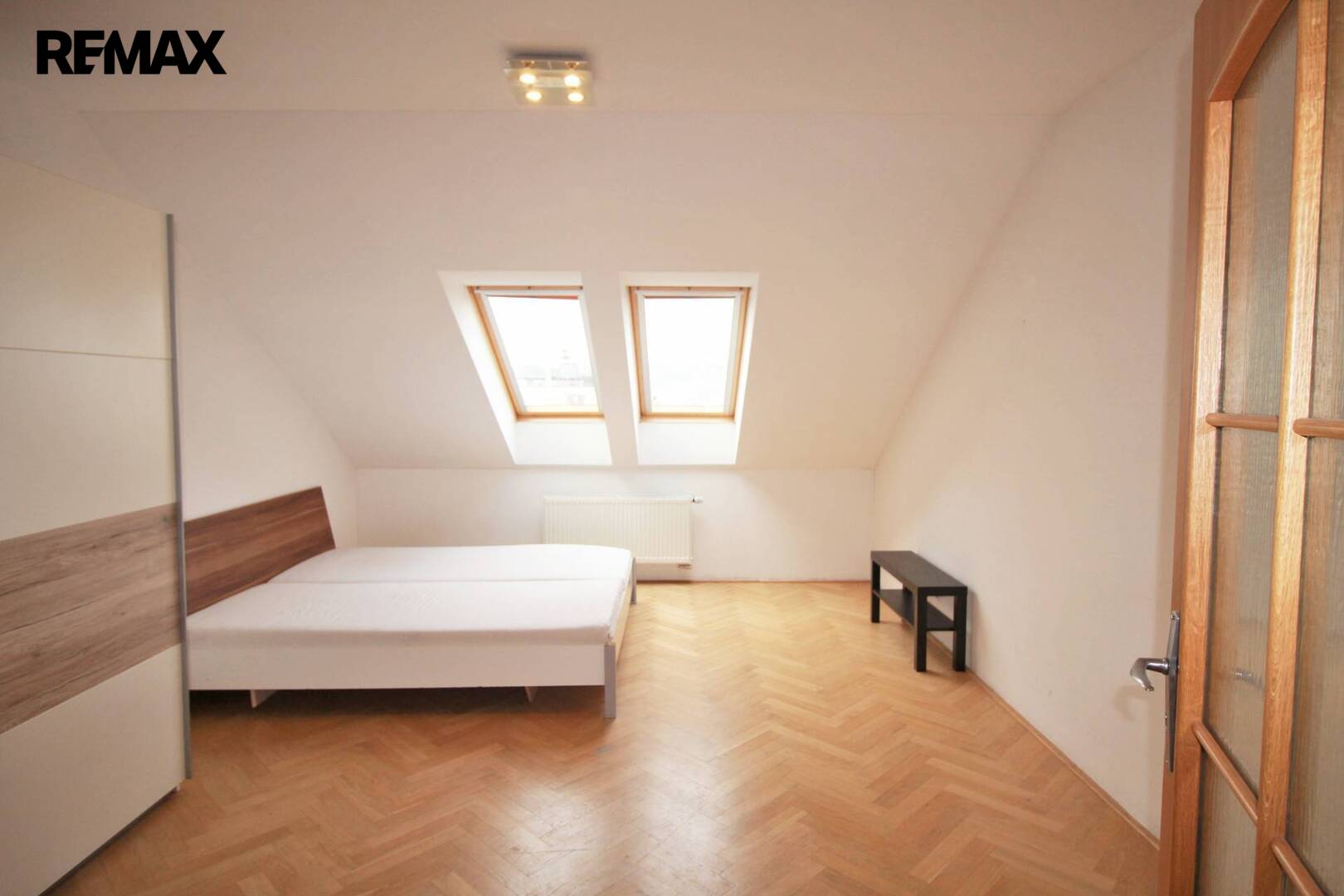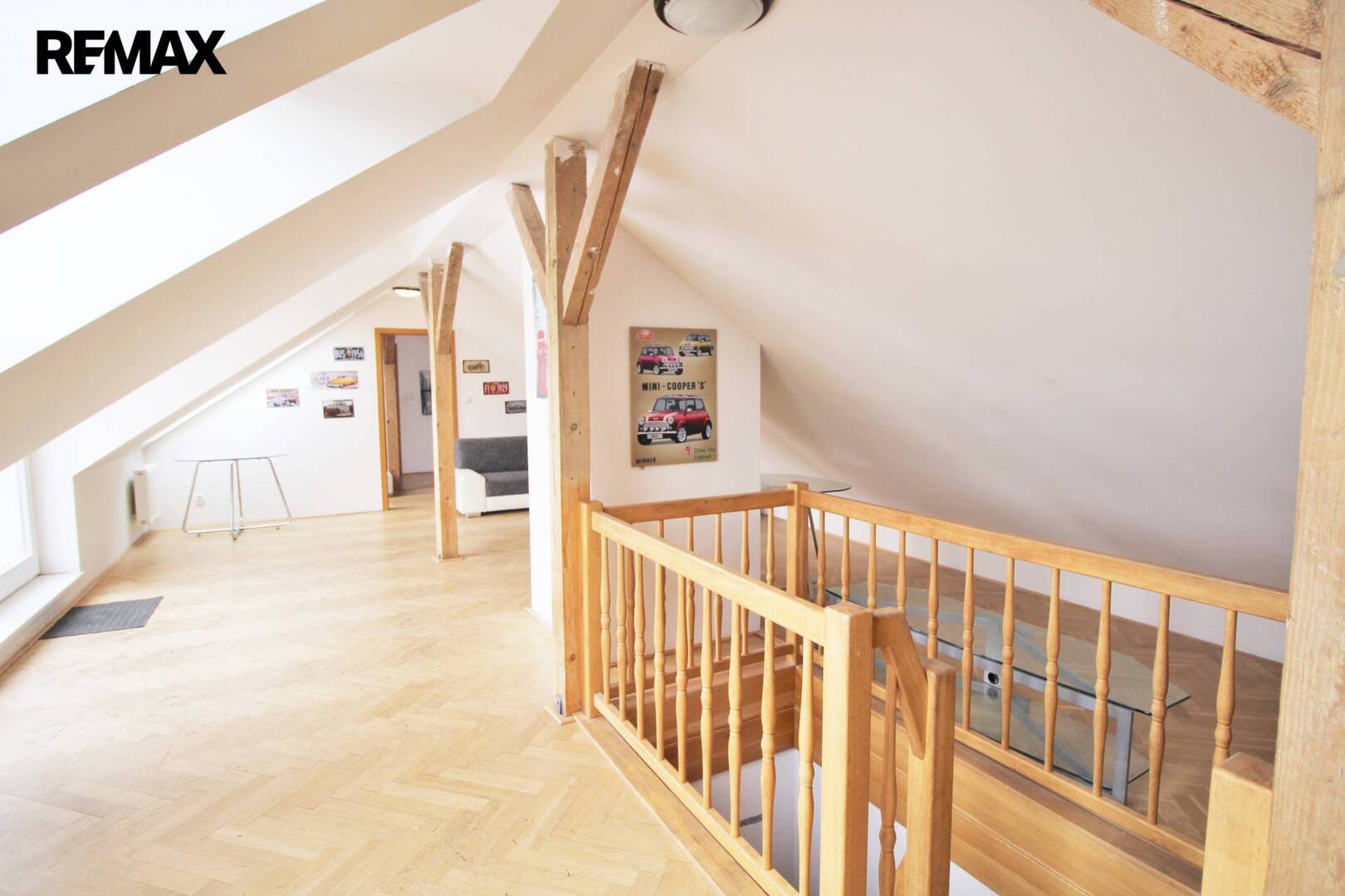 Ve všech prostorách jsou okna, která poskytují dostatek světla v místnostech. Nachází se zde i praktická komora. Ve vstupní hale je točité dřevěné schodiště, které vede do horní části prostor s velkou otevřenou místností s kuchyňským koutem a místností s vlastní koupelnou.
