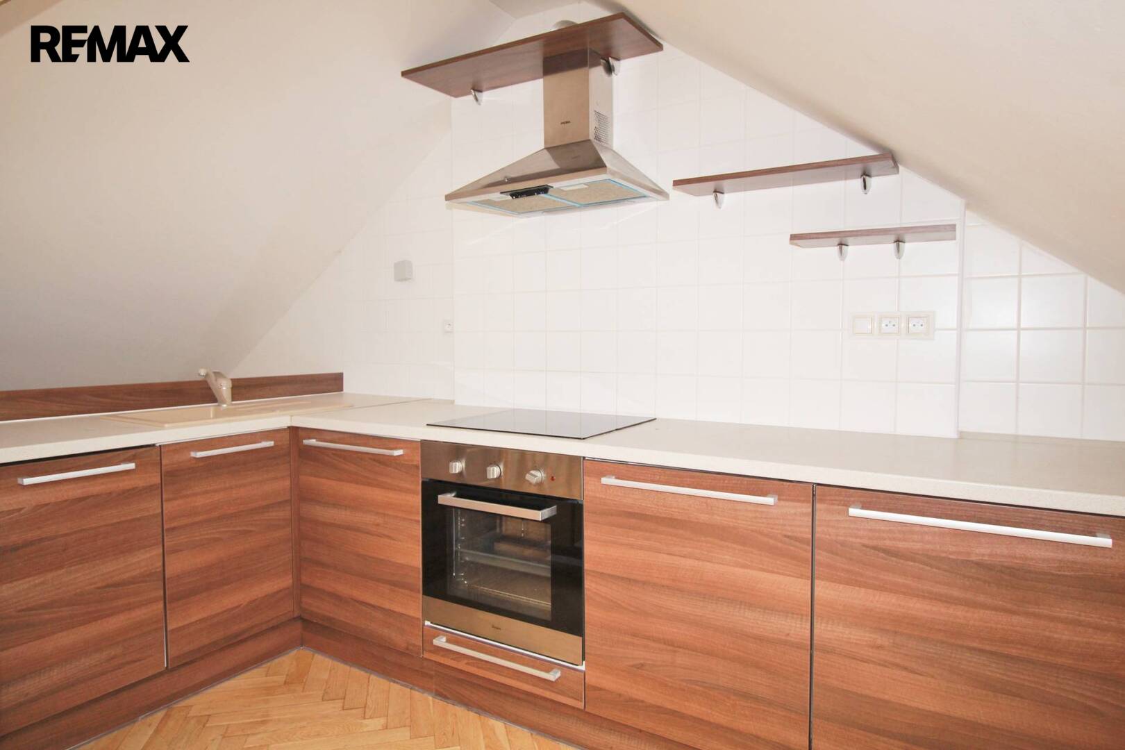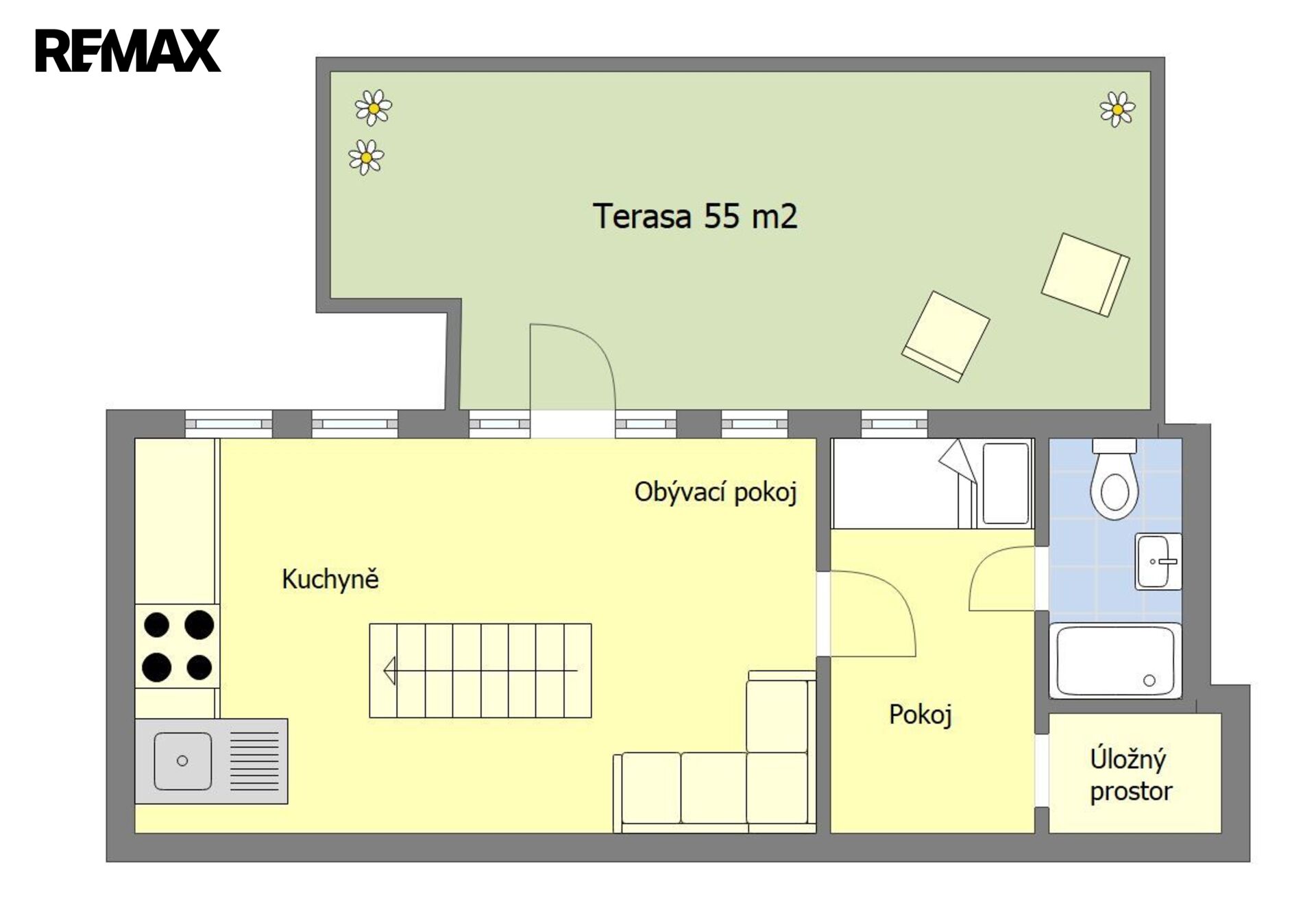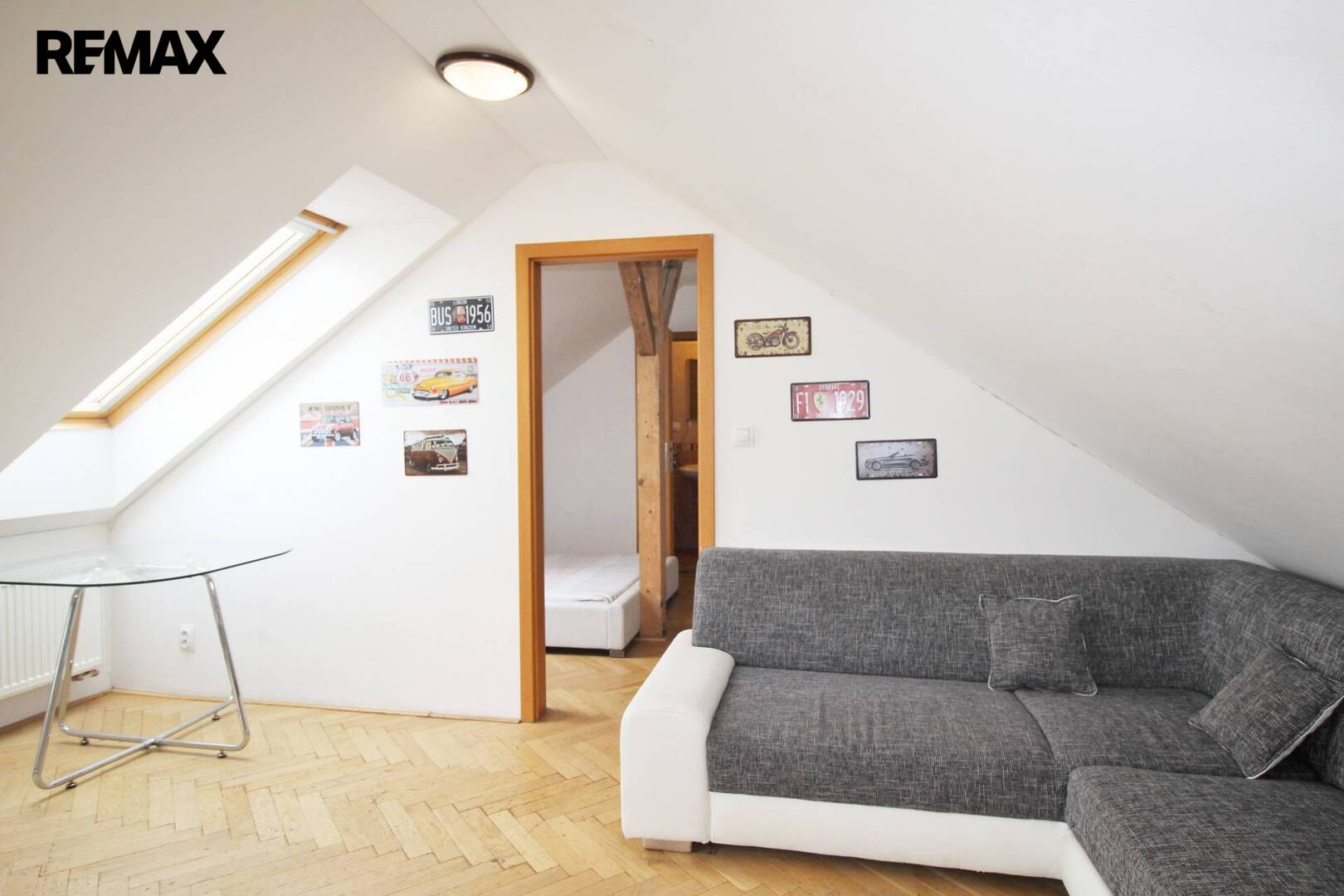 Ve všech prostorách jsou okna, která poskytují dostatek světla v místnostech. Nachází se zde i praktická komora. Ve vstupní hale je točité dřevěné schodiště, které vede do horní části prostor s velkou otevřenou místností s kuchyňským koutem a místností s vlastní koupelnou.