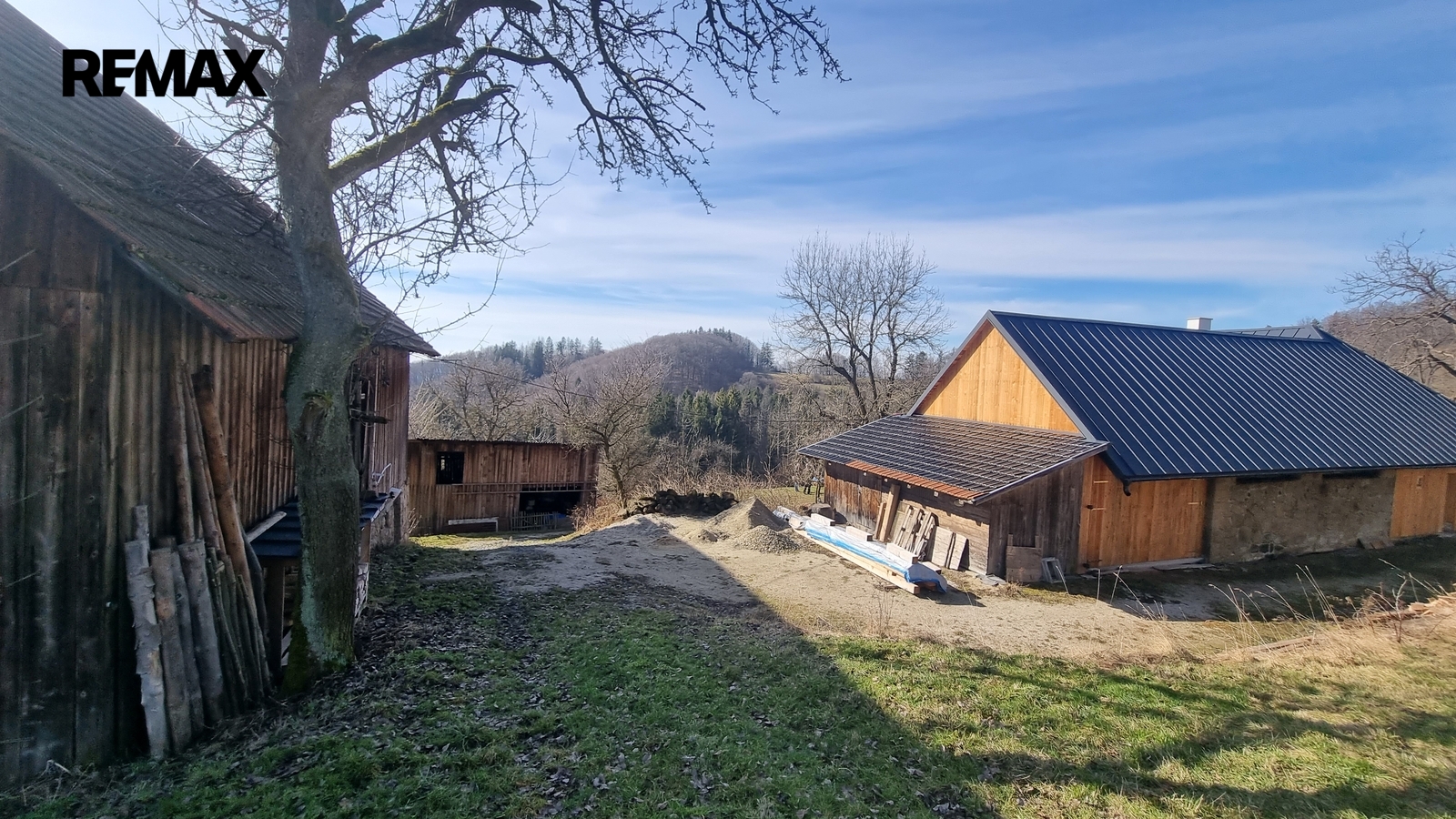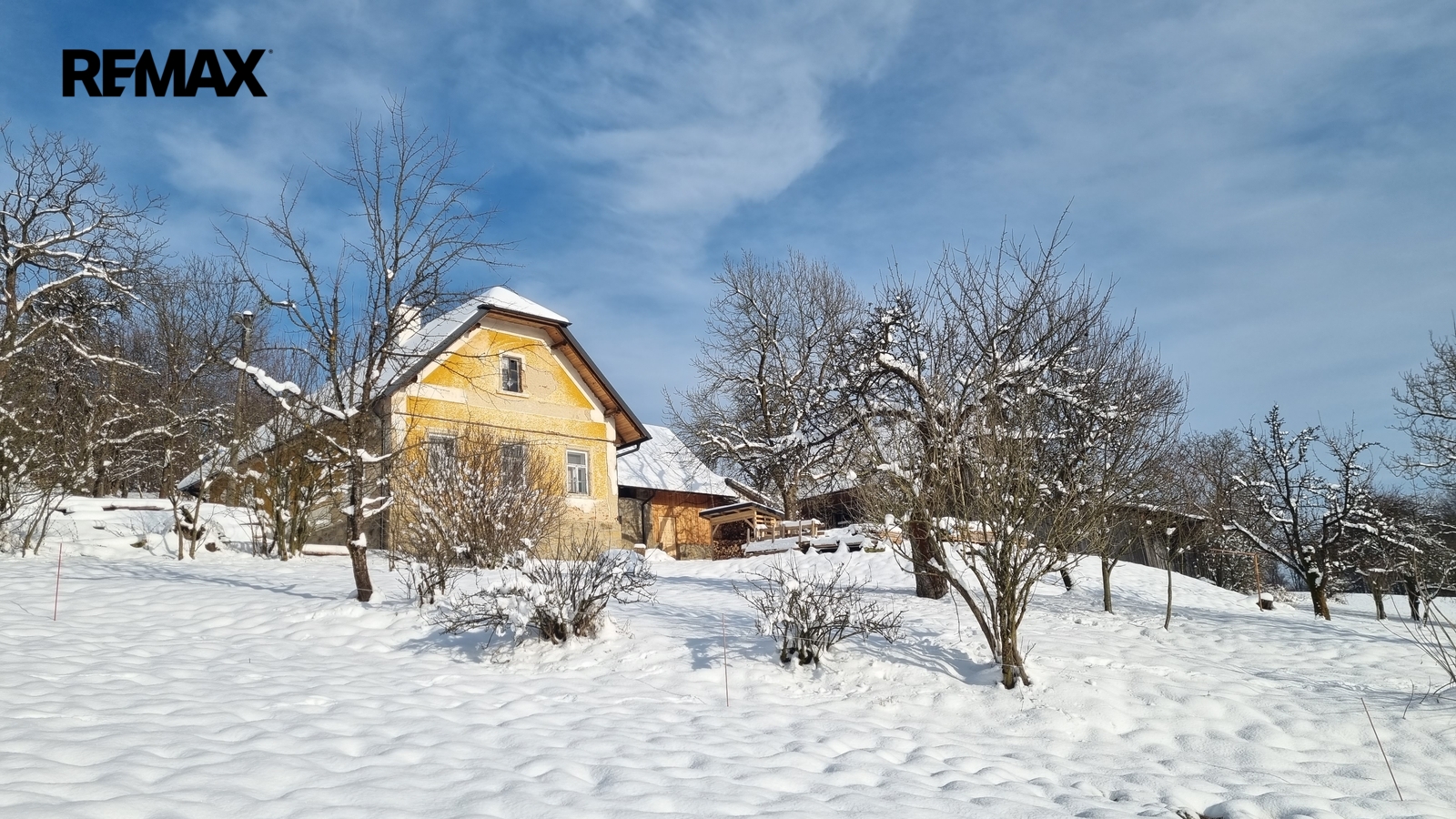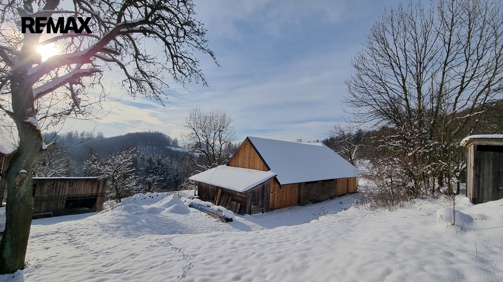 Kolem domu jsou stavby, stodola, dílna, bývalé chlévy.