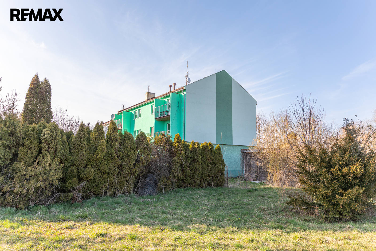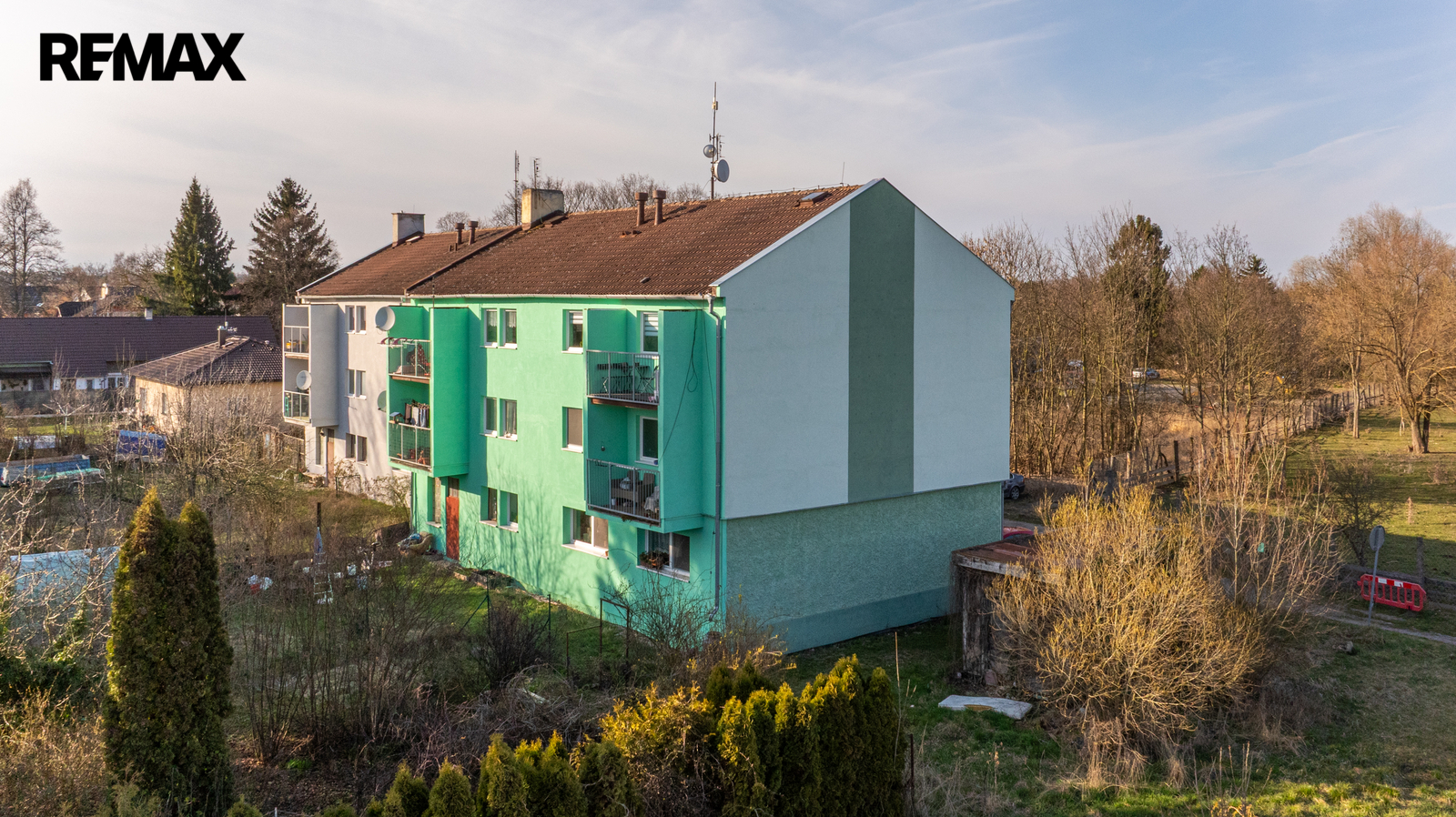 Dům je v dobrém stavu, zateplený, s novými okny, byty jsou individuálně vytápěny elektrickými kotli. Dále k domu patři podíl 1/2 na pozemku kolem domu (podíl 1/2 odpovídá výměře 194,5 m2), příjezdová cesta a pozemek v širším okolí patři státu.