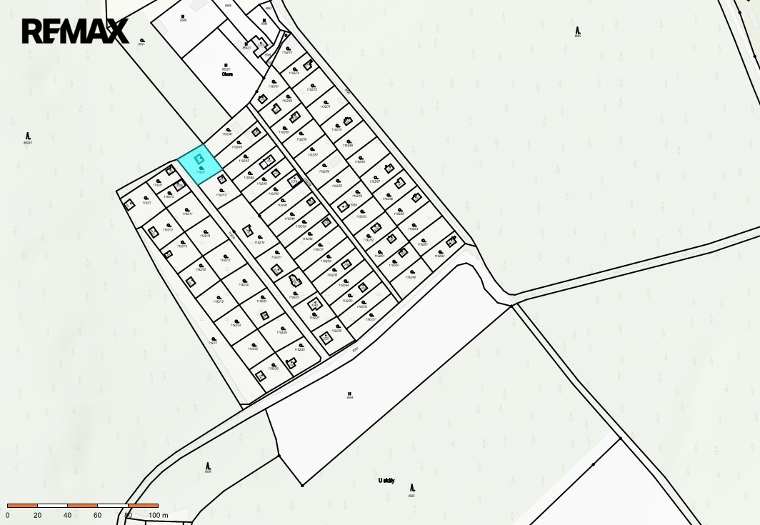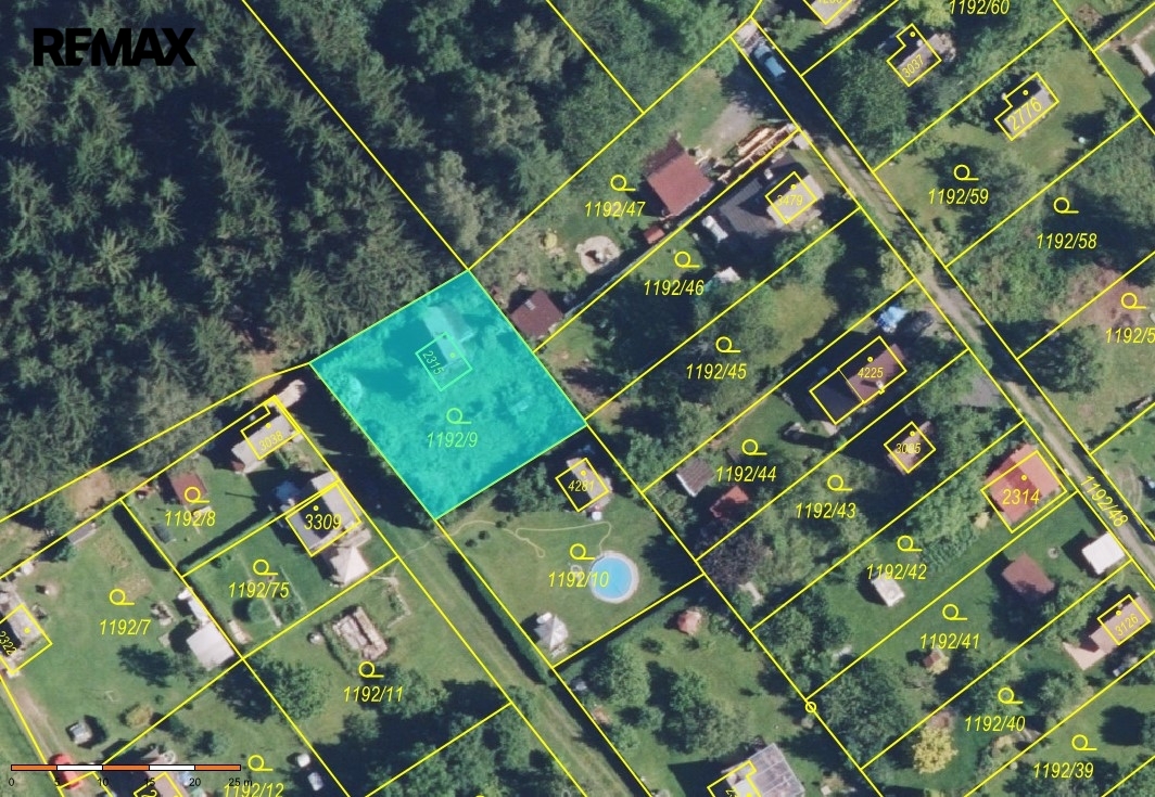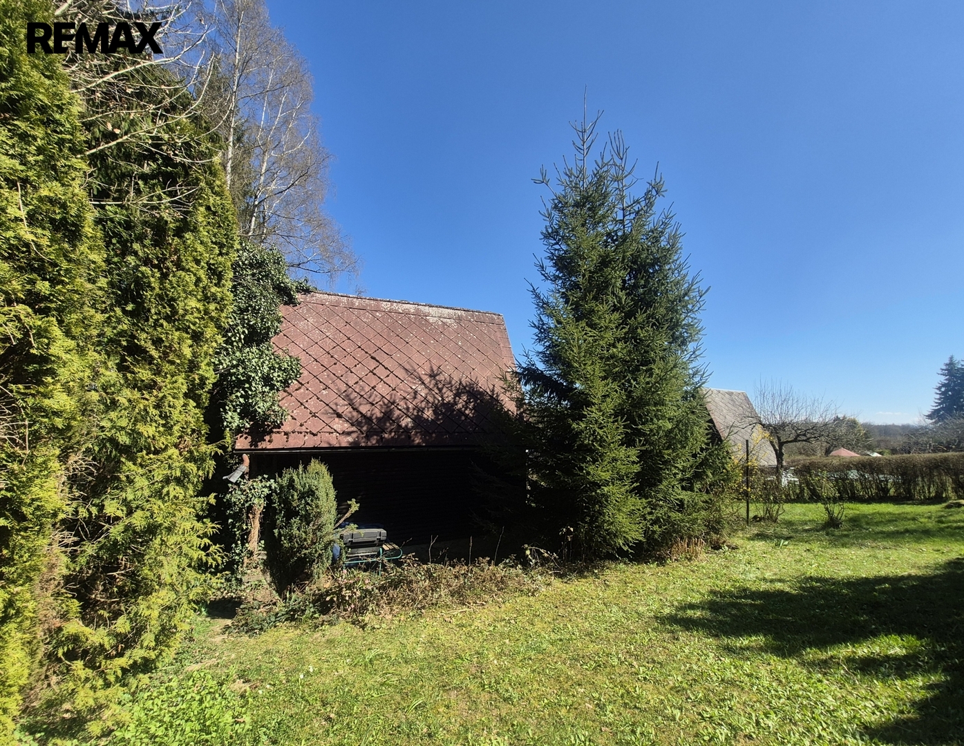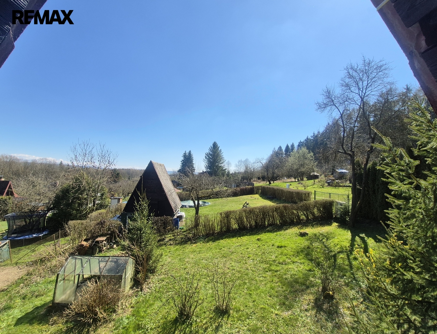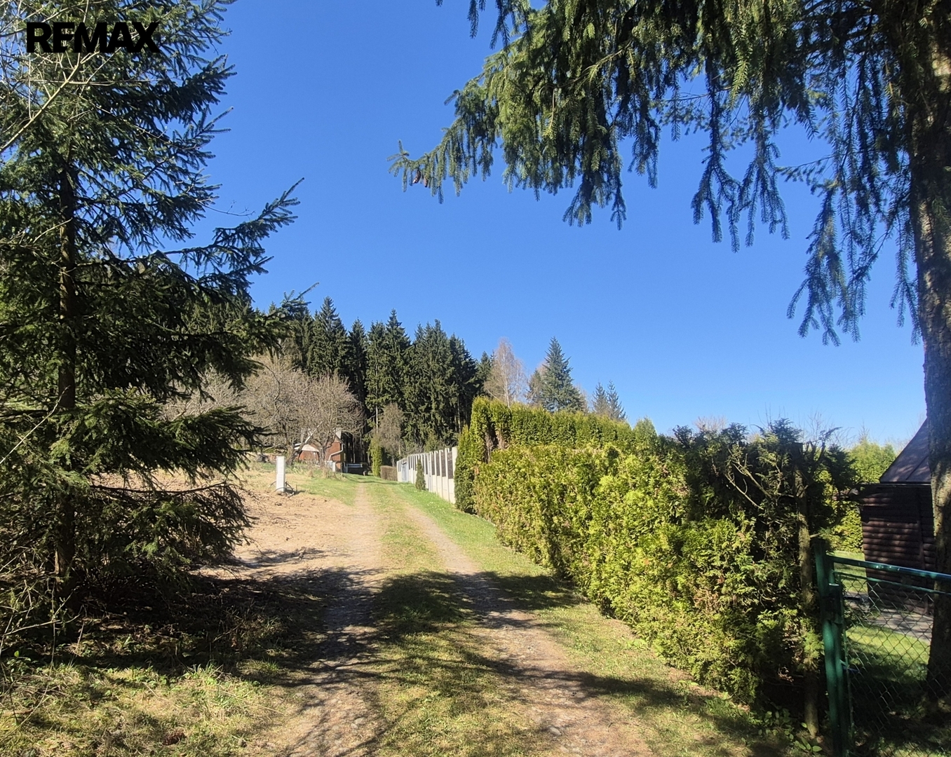 K chatě patří udržovaná oplocená zahrada téměř rovinatého terénu o výměře 404 m2.