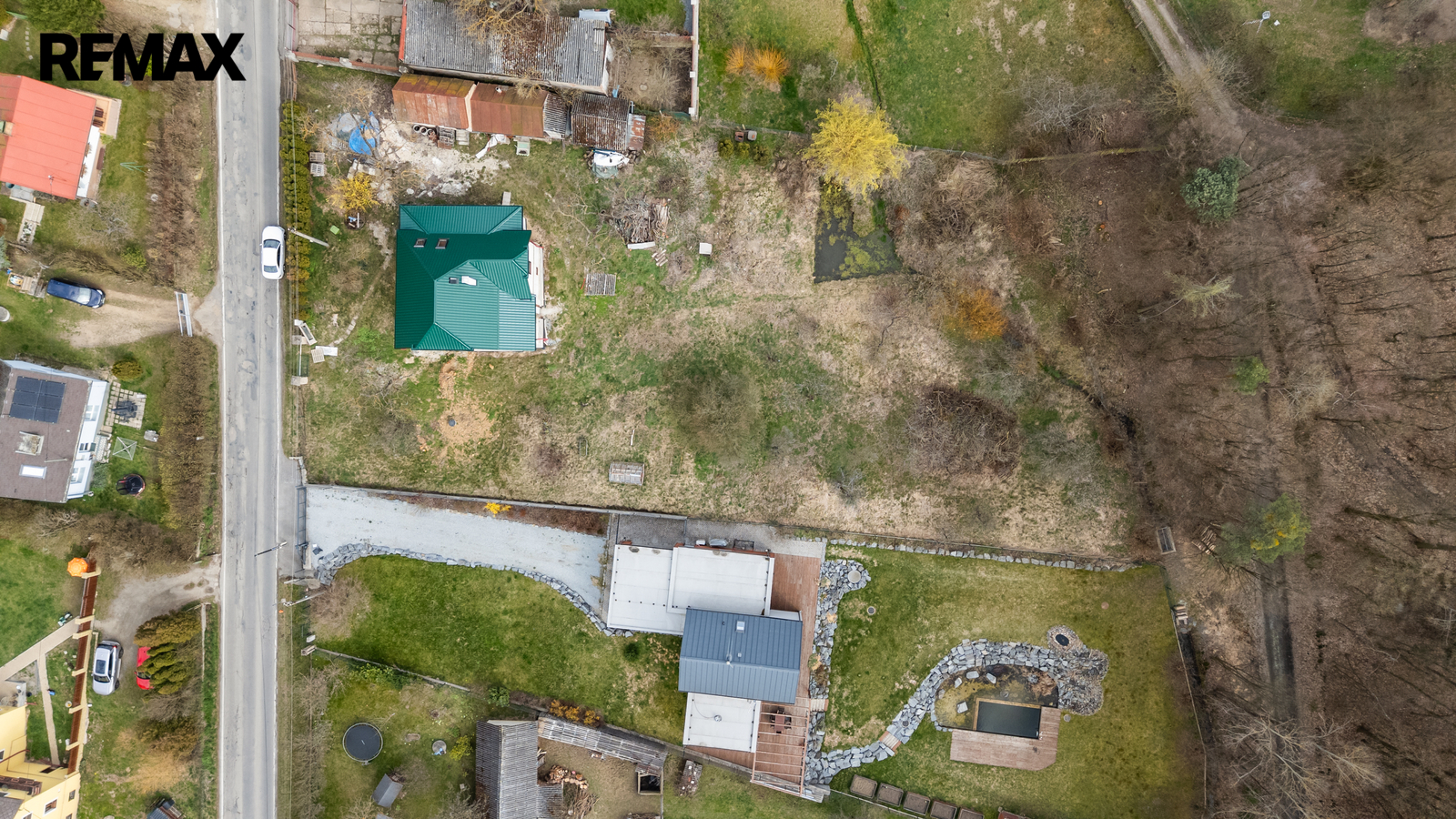 Zahrada se rozprostírá od ulice až k lesu a nabízí opravdu velkorysý prostor. Nachází se na ní jezírko a je mírně svažitá, avšak prakticky obdélníková. Na pozemek je možnost dvou příjezdů z ulice, u hlavního stojí i starší garáž, která nyní slouží jako sklad a další drobné přístavky. Kultivované prostředí vytváří velmi zdařilá realizace sousedního domu a zahrady.