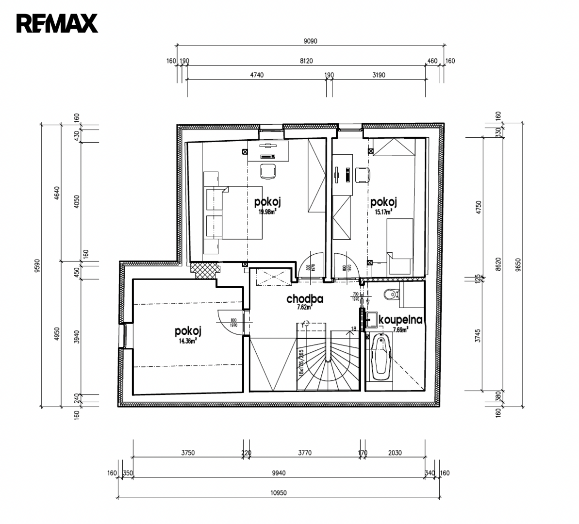 V patře se pak nacházejí další 3 pokoje a druhá koupelna. Nad jedním z pokoju je možné nechat přiznaný vysoký strop či tento půdní prostor využít jako úložný na sezónní věci přístupný výklopnými schody z podesty, tak jako to plánovali udělat současní majitelé.