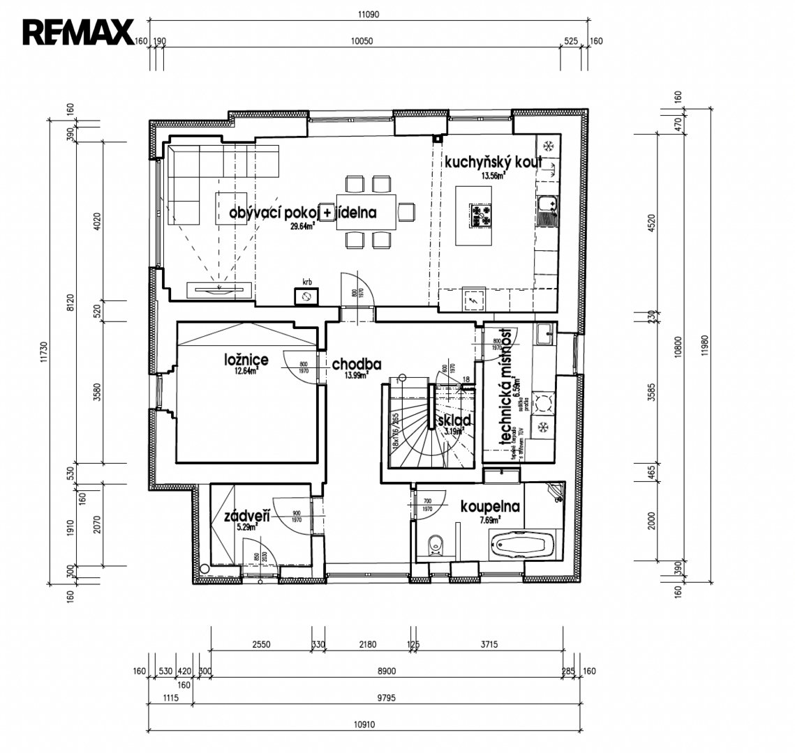 Přízemí domu nabídne vstupní prostor s předsíní navazující na centrální chodbu a koupelnu s WC, první pokoj, šatnu/komoru či malou pracovnu a velký obývací pokoj s kuchyní a s výhledem na zahradu. V kuchyni je příprava na instalaci ostrůvku a bude moci být velmi prostorná a s oknem.