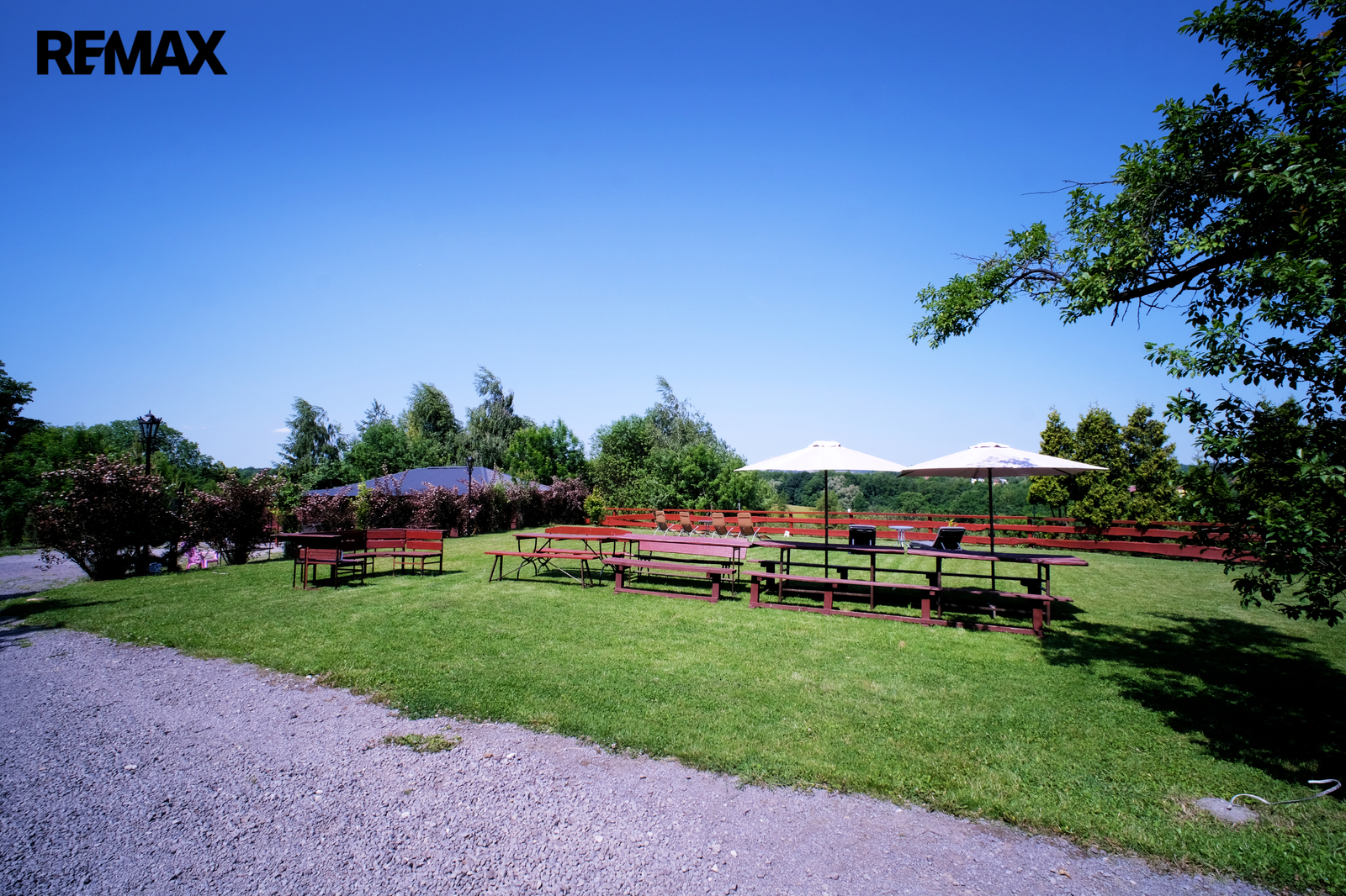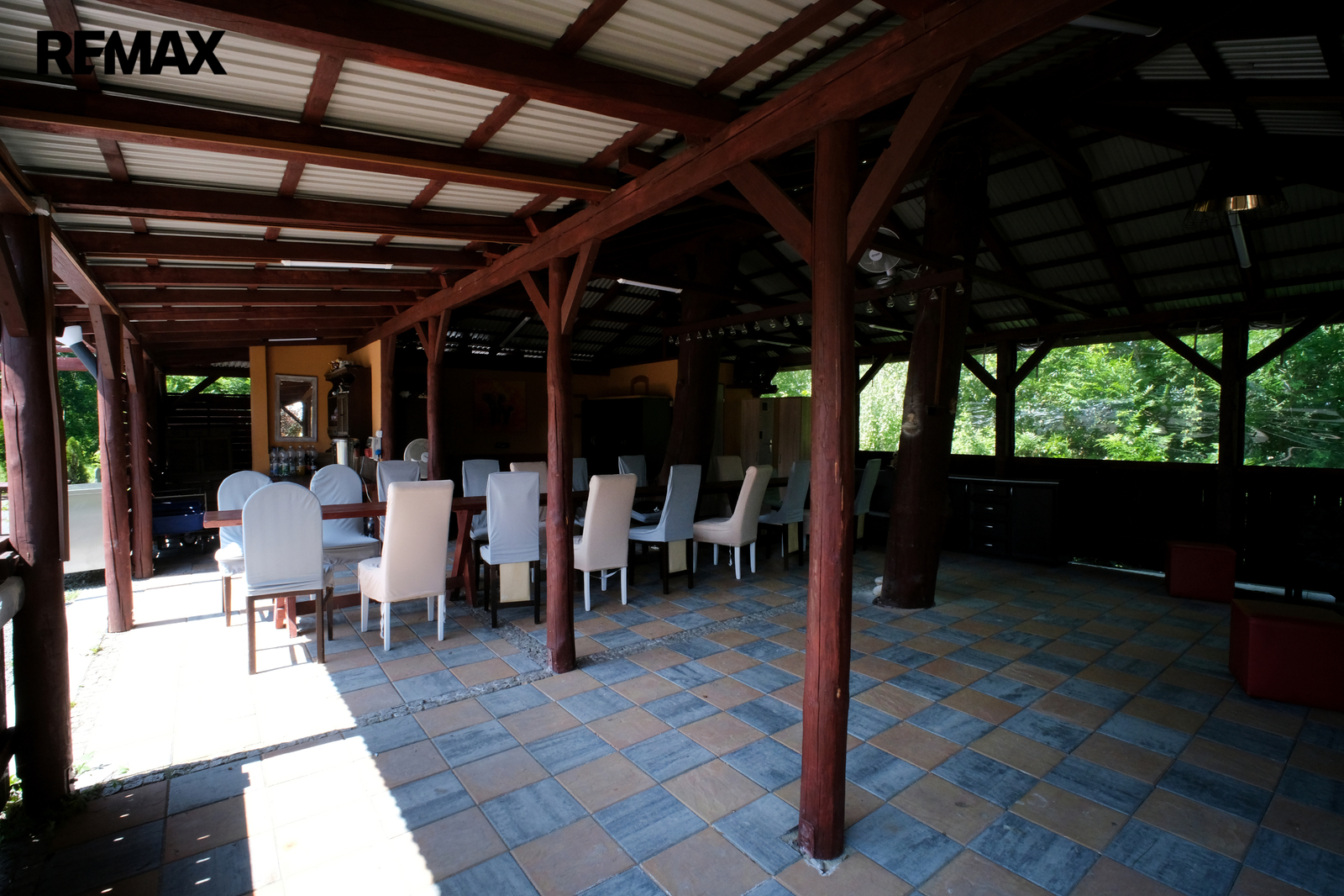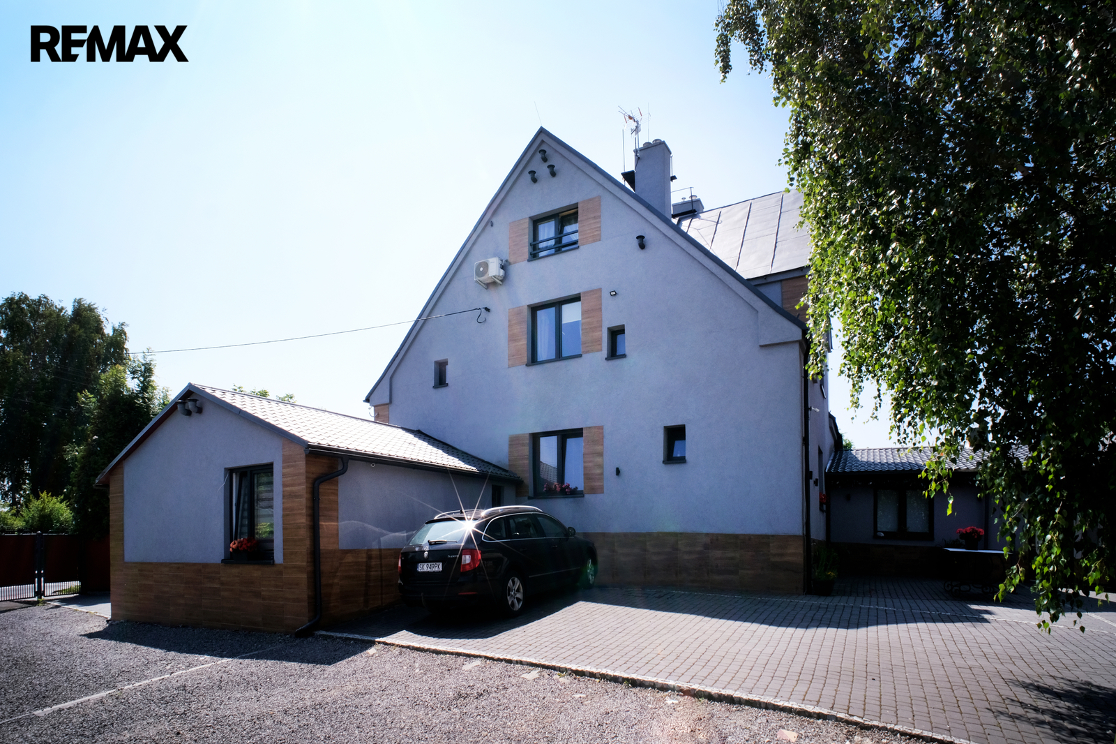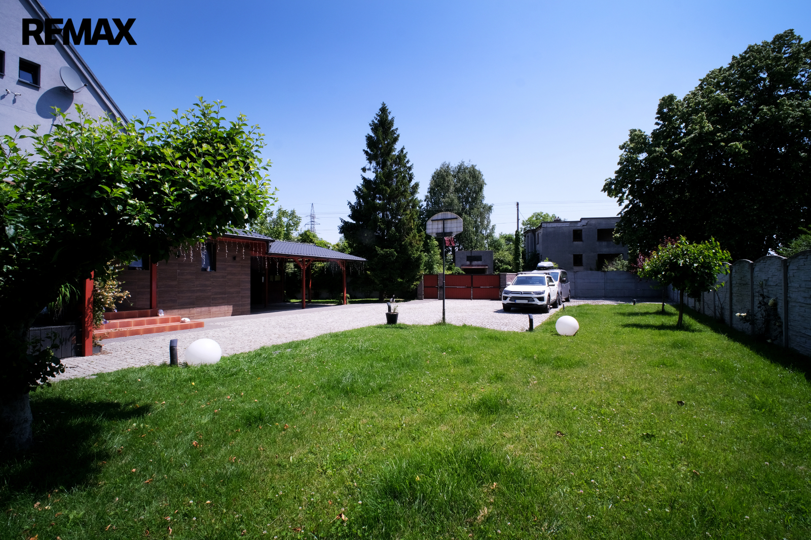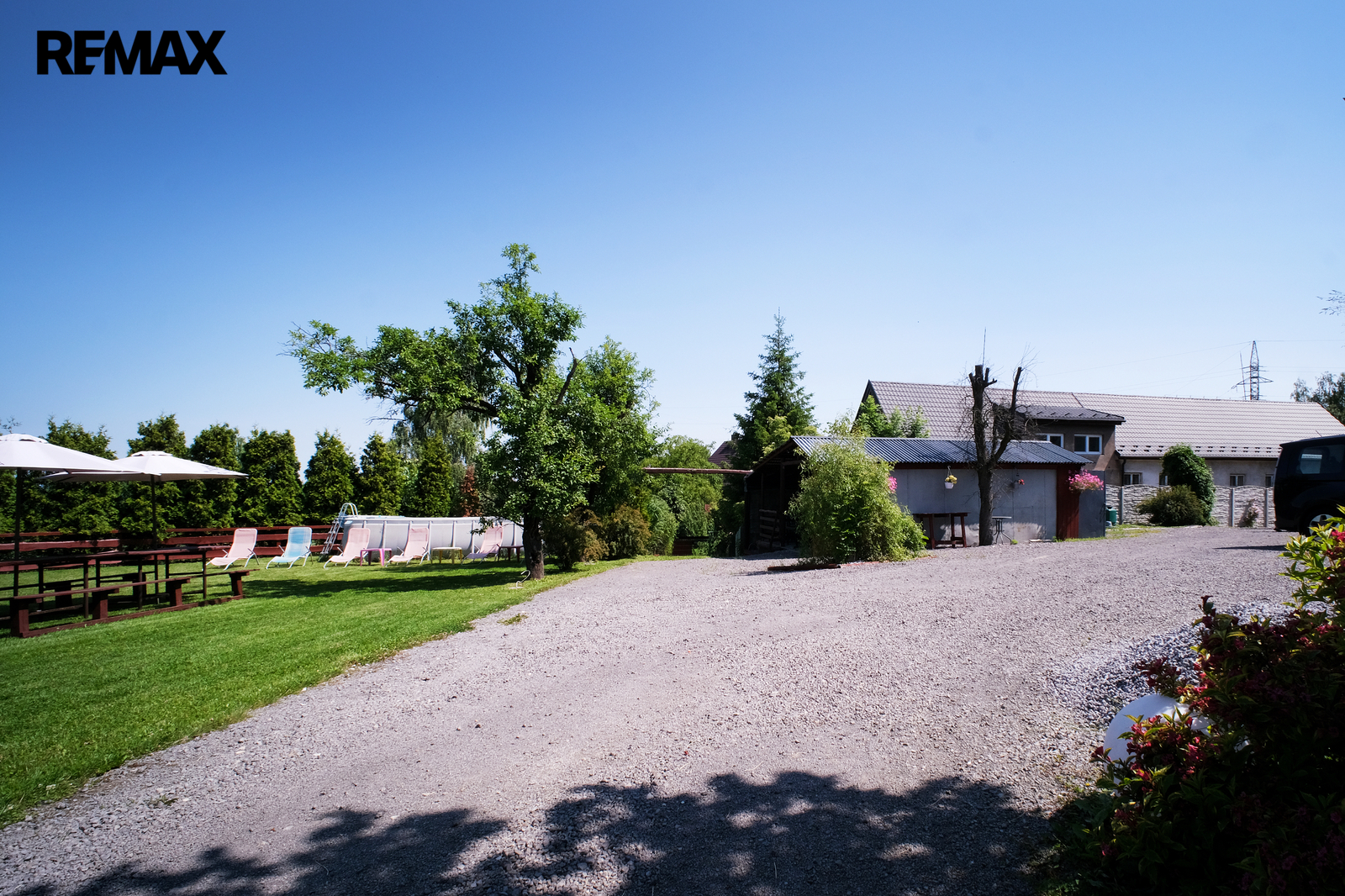 Kryté stání pro 3 vozidla, venkovní zpevněné plochy cca 300 m2 pro parkování dalších automobilů, přívěsů, karavanů a podobně. Dva na sobě nezávislé komfortní vjezdy do areálu z celoročně udržované asfaltové silnice.