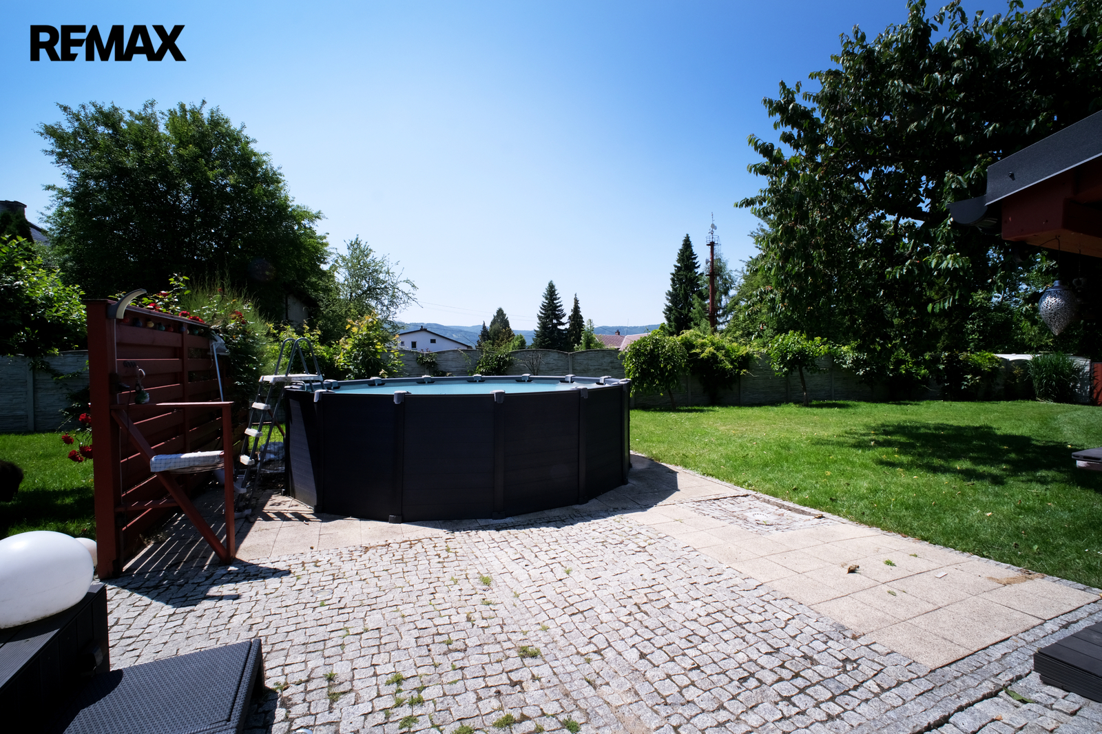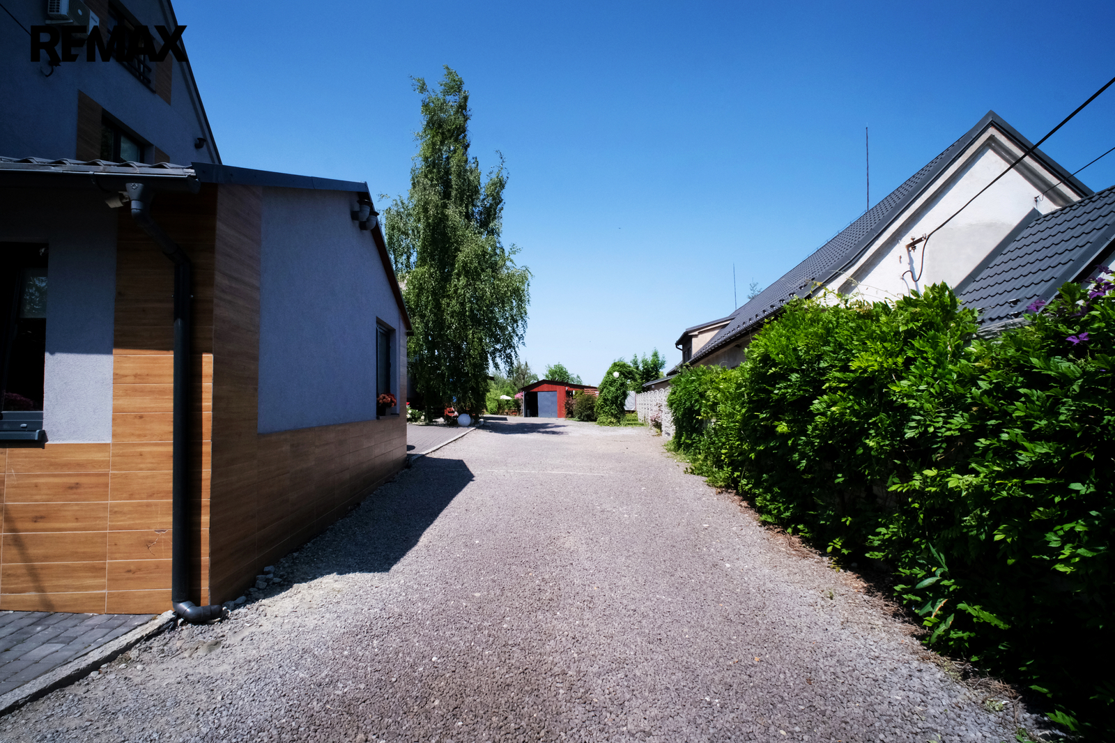 Dále na pozemcích krytá garáž a skladovací montovaná stavba, vhodné jako zázemí pro údržbu, případně uložení jízdních kol, resp. jiného sportovního náčiní.